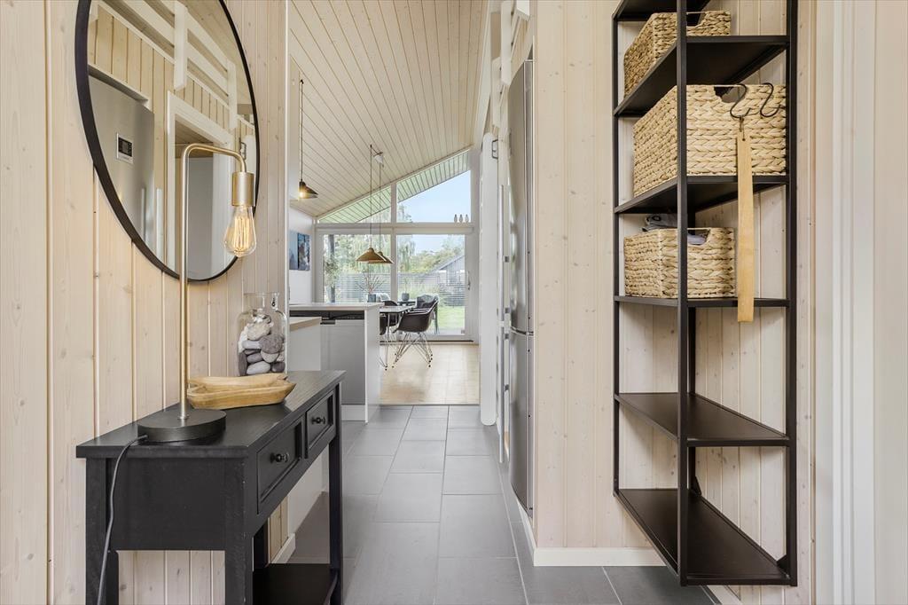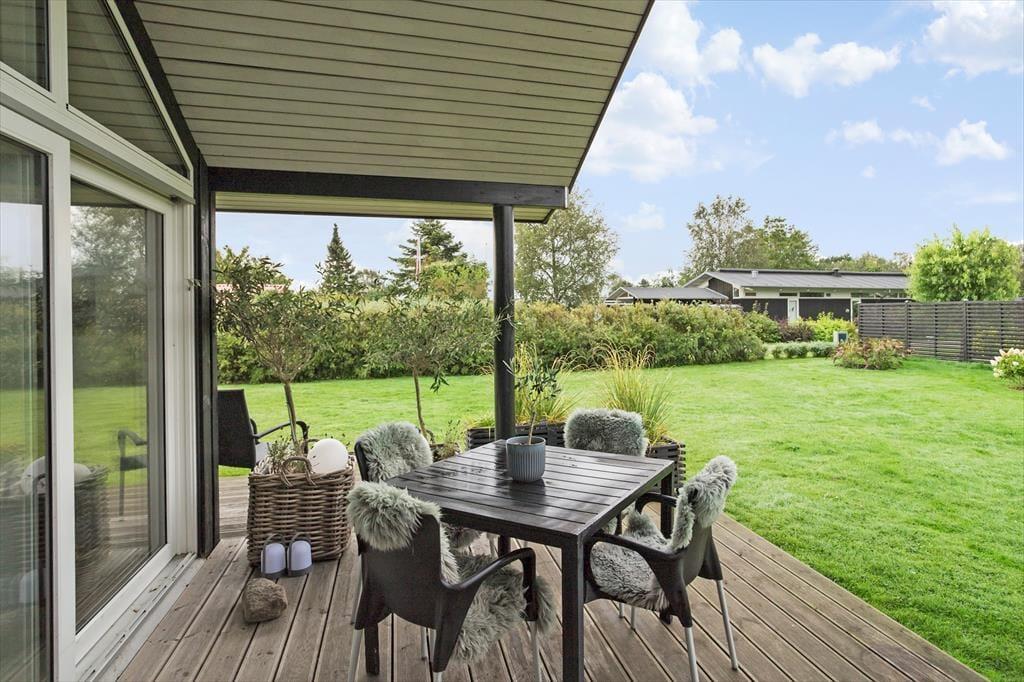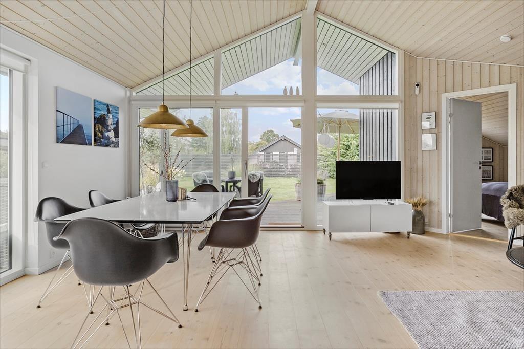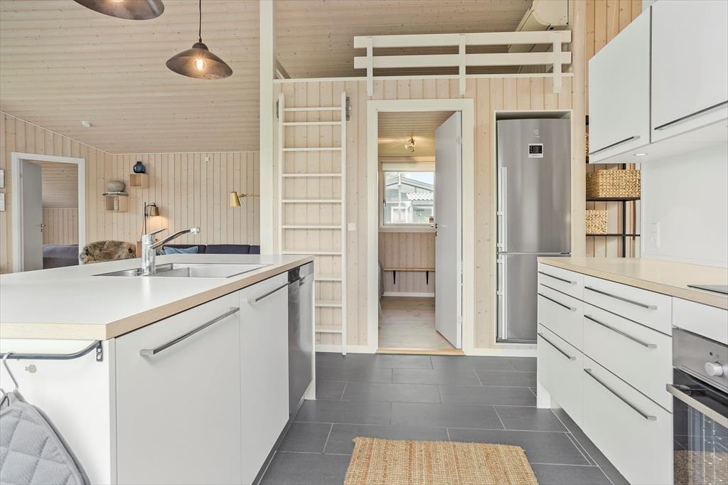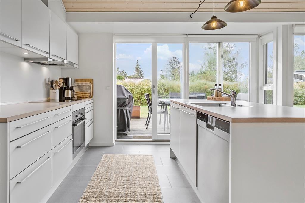 Das Haus hat eine schöne, offene Wohnküche mit einem Essbereich für die ganze Familie, der direkt an die Küche anschließt. Die Küche ist mit einer Spülmaschine ausgestattet und enthält alles, was Sie während Ihres Aufenthaltes benötigen. Von der Küche aus haben Sie Zugang zu einer großen, teilweise überdachten Holzterrasse, die Sie während Ihres Aufenthaltes sicherlich ausgiebig nutzen werden.