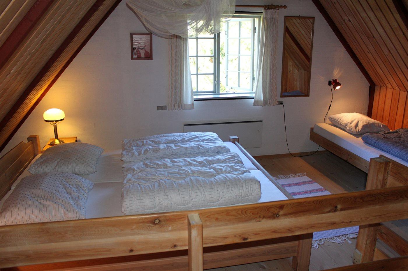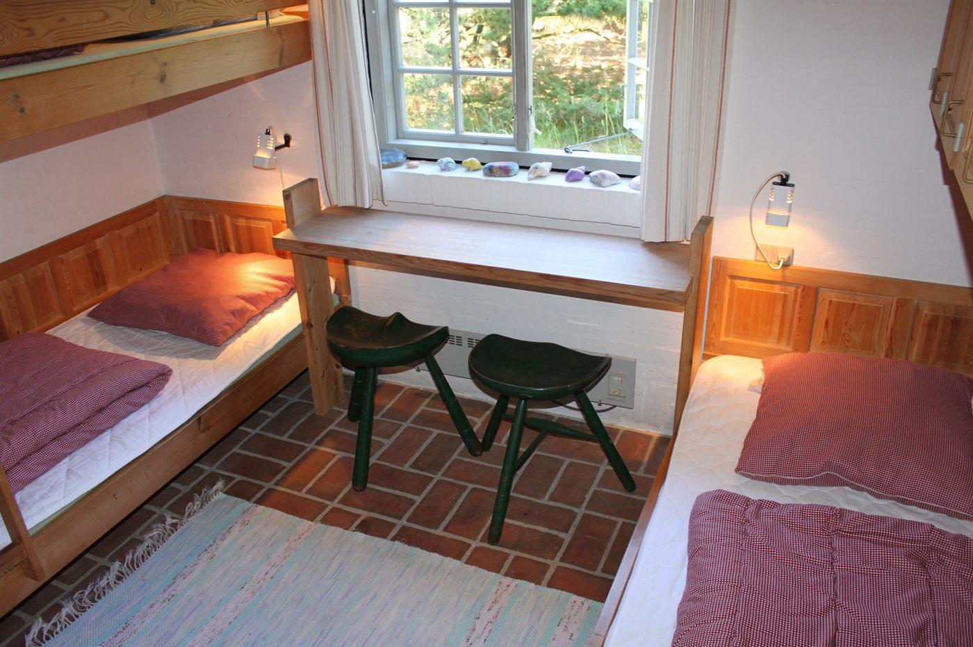 Die Schlafplätze verteilen sich auf 2 Schlafräume. 2 Schlafplätze in einem Doppelbett. 2 Schlafplätze in Einzelbetten. 2 Schlafplätze in einem Etagenbett.