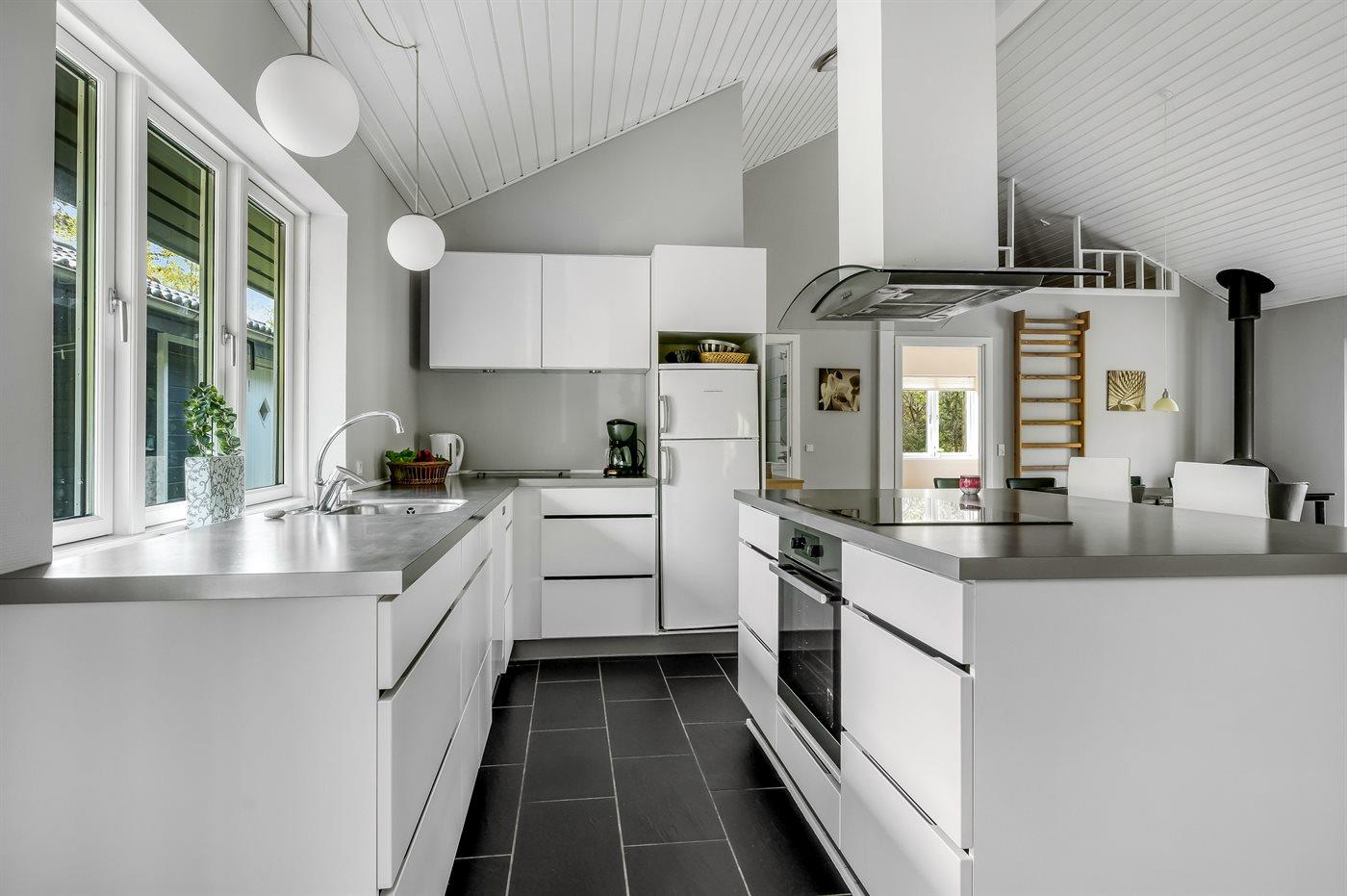 Die Küche ist mit Kühlschrank ausgestattet. Außerdem gibt es 4 Induktions-Kochzonen, Umluftofen, Mikrowelle sowie Geschirrspüler.