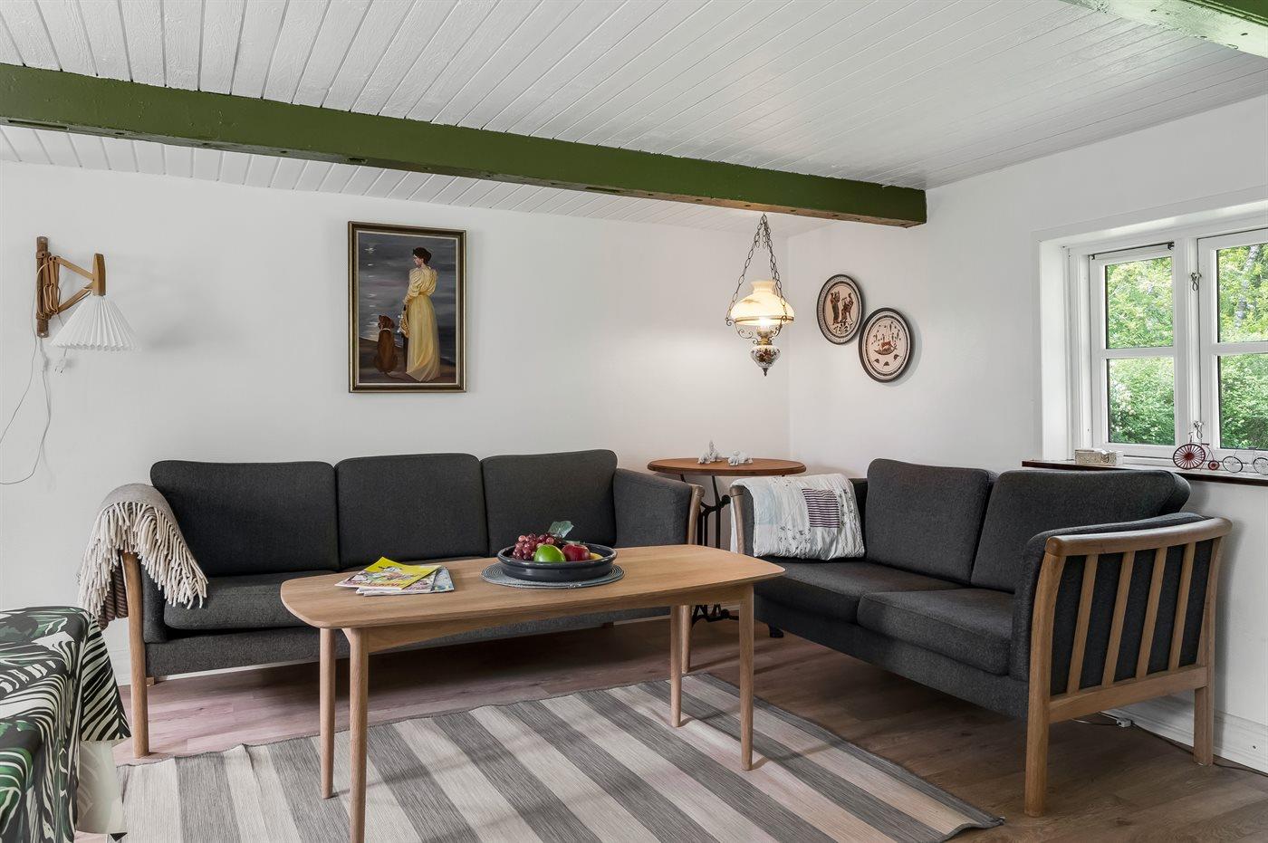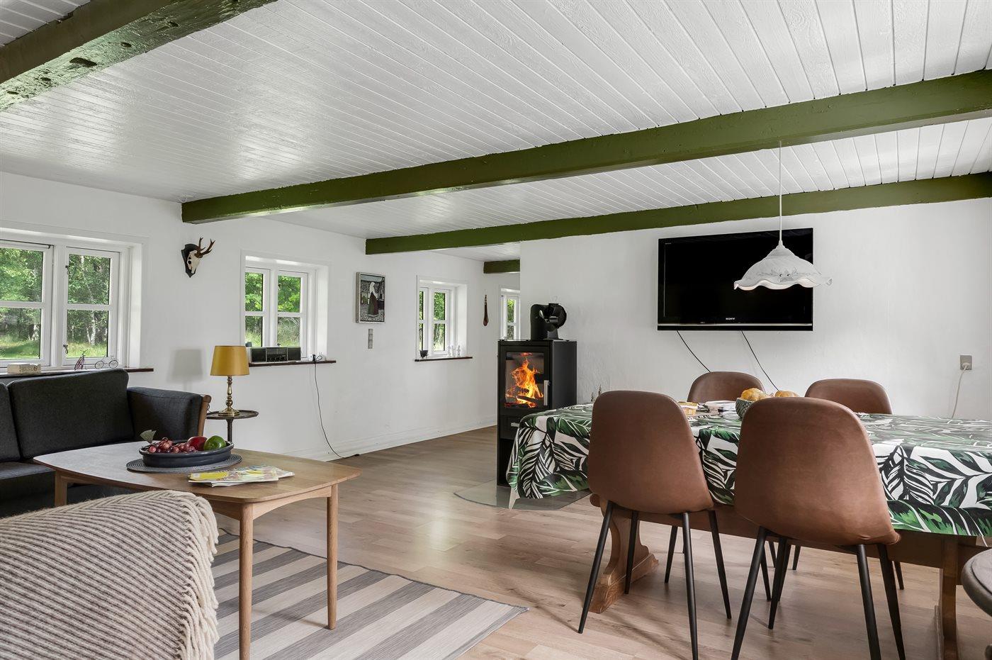 Das Ferienhaus liegt ungestört mit Wald und Feldern als nächster Nachbarschaft und mit reichlich Wildtieren in der Umgebung. Die Decken sind niedrig (175 cm), doch dafür wurde das Haus 2023 umfassend renoviert. Es verfügt über einen Eingangsbereich, ein Badezimmer mit Duschnische sowie eine Küche mit Essplatz, die offen in das Wohnzimmer mit Kaminofen und Wärmepumpe übergeht, sowie über zwei gute Schlafzimmer.