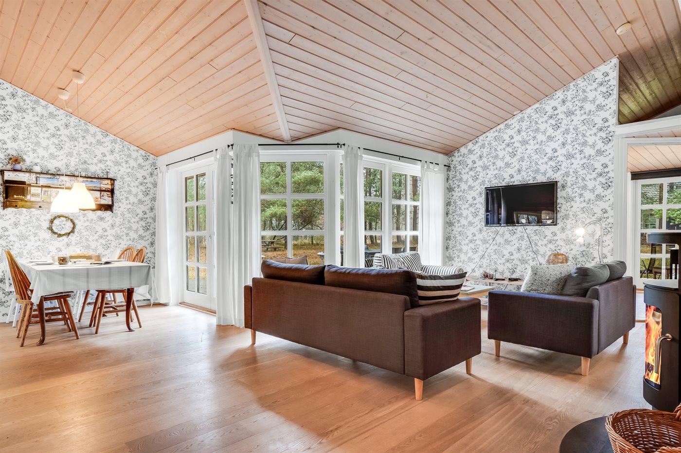 • Ein helles und geräumiges Wohnzimmer mit großen Fenstern, die für fantastisches Licht sorgen und eine schöne Aussicht auf die umliegende Natur bieten.
