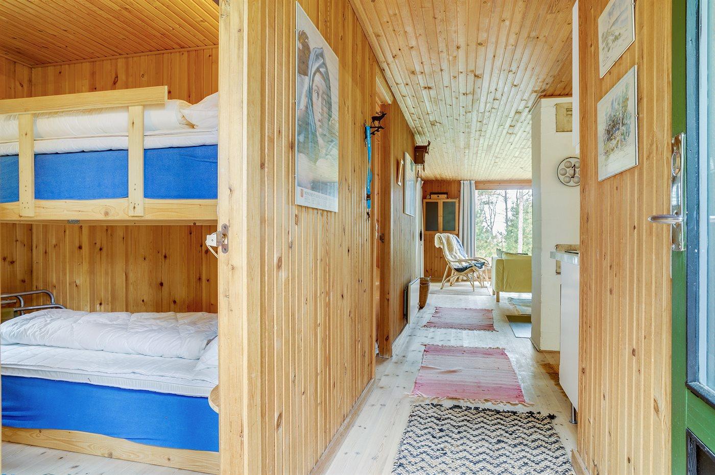 Die Schlafplätze verteilen sich auf 2 Schlafräume. 2 Schlafplätze in einem Doppelbett. 2 Schlafplätze in einem Etagenbett. Ein Schlafplatz auf einer Schlafcouch.