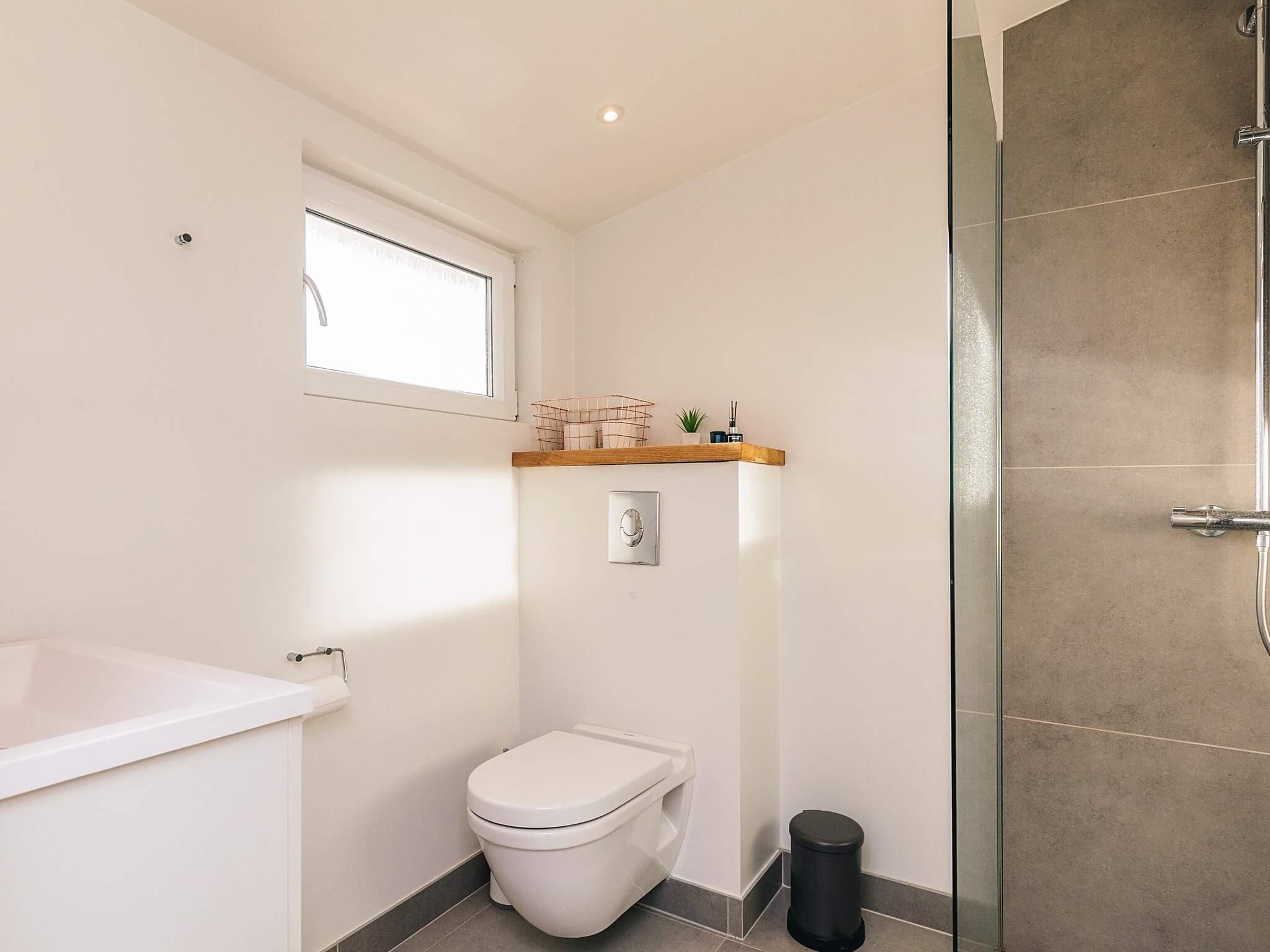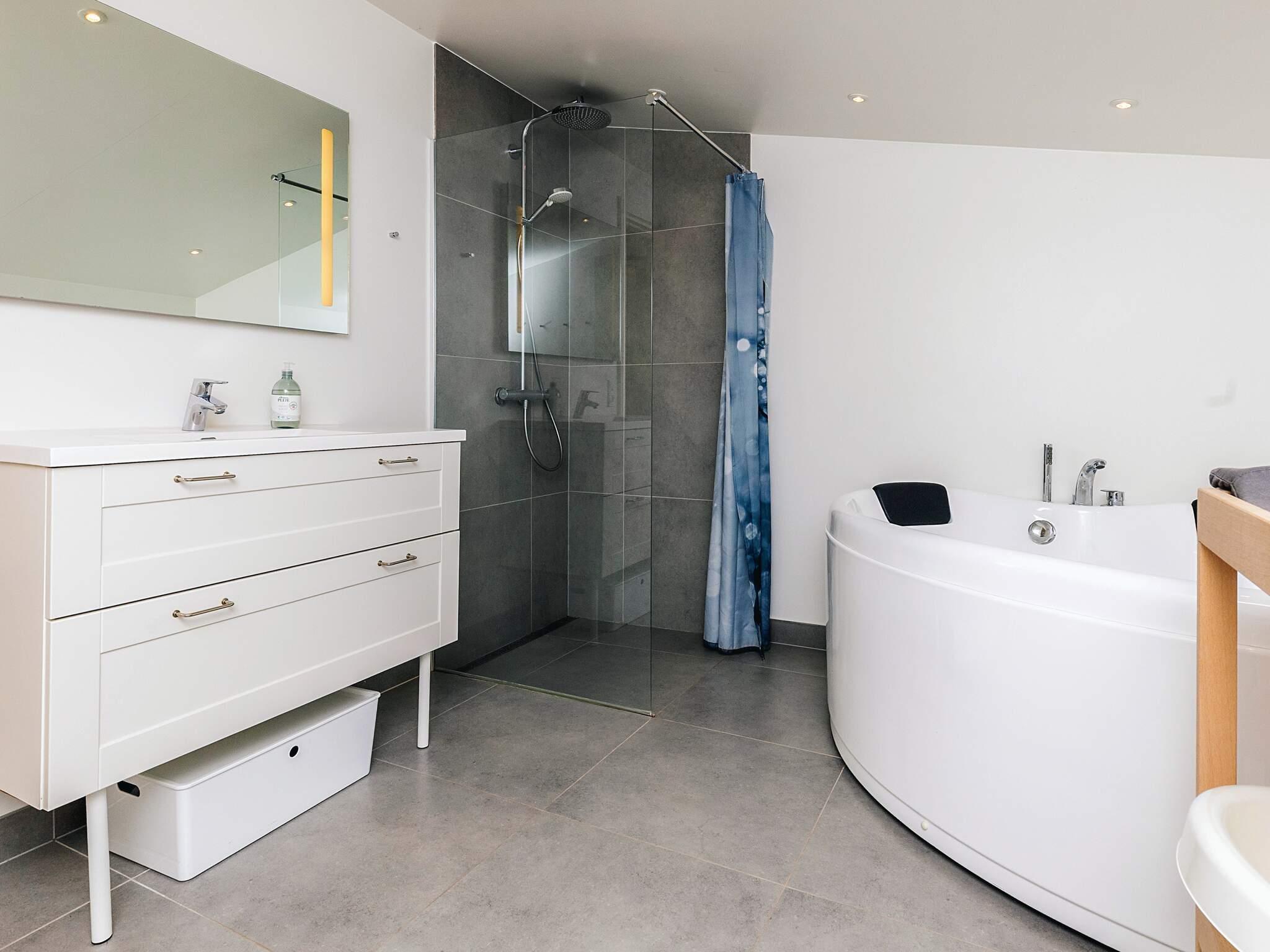 Vom Eingangsbereich aus gelangt man in die große Wohnküche mit Zugang zu zwei weiteren Schlafzimmern mit Doppelbetten, einem Badezimmer mit Dusche und einem großen Wellnessbad mit Dusche und Whirlpool für zwei Personen. Ein Hauswirtschaftsraum mit Waschmaschine und Trockner und nicht zuletzt das Herzstück des Hauses: der große Wohnbereich mit Küche, der Platz für die ganze Familie bietet.