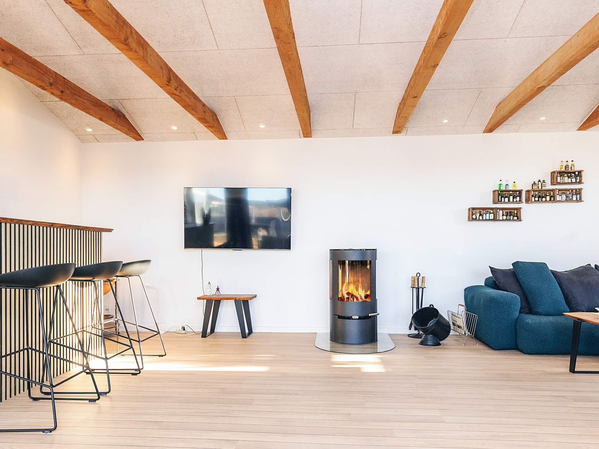 Große Eingangshalle mit Zugang zu zwei hellen Schlafzimmern mit Doppelbetten und einem großen Wohnzimmer mit hohen Decken und Sichtbalken, einem Holzofen und einer Luft-Luft-Wärmepumpe. Das Wohnzimmer ist mit einer Bar und einer gemütlichen Sitzecke mit Sofa und Fernseher ausgestattet. Es gibt kein Kabelfernsehen, aber Sie können Ihre eigenen Streaming-Dienste usw. über den installierten Chromecast streamen.