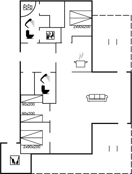 Die Schlafplätze verteilen sich auf 3 Schlafzimmer; 2 mit Doppelbett und 1 mit 2 Einzelbetten. Das Haus ist ferner mit kostenloser Internetverbindung (Computer ist mitzubringen), Waschmaschine, Wäschetrockner, Kinderhochstuhl sowie Kinderbett ausgestattet und es ist eine energiesparende Luft-Luft-Wärmepumpe installiert. Aktivitätsraum mit Trimm-Rad und Fittnessbank im Gästehaus.