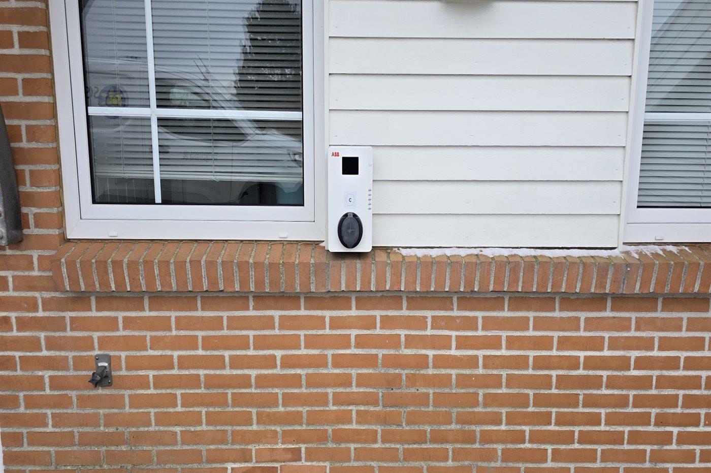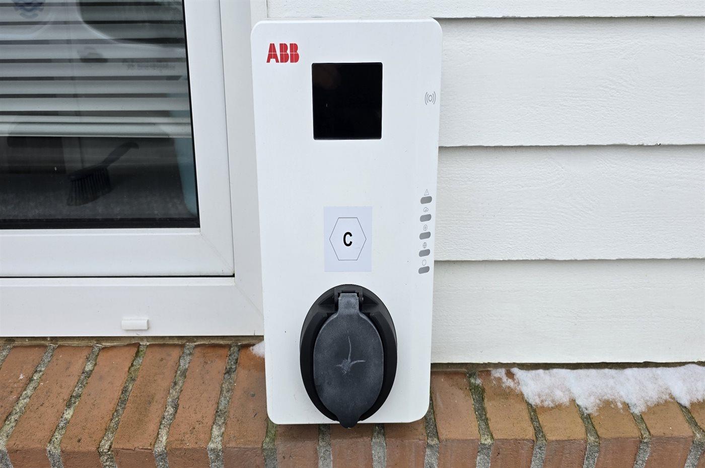 Sandkasten und Schaukel auf dem Grundstück. Es ist ein Ladestecker für Elektroautos, mit einer Ladeleistung von 11 kW, installiert.