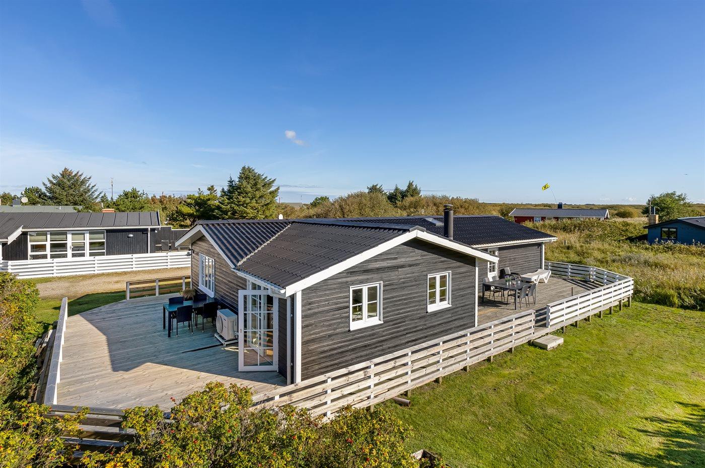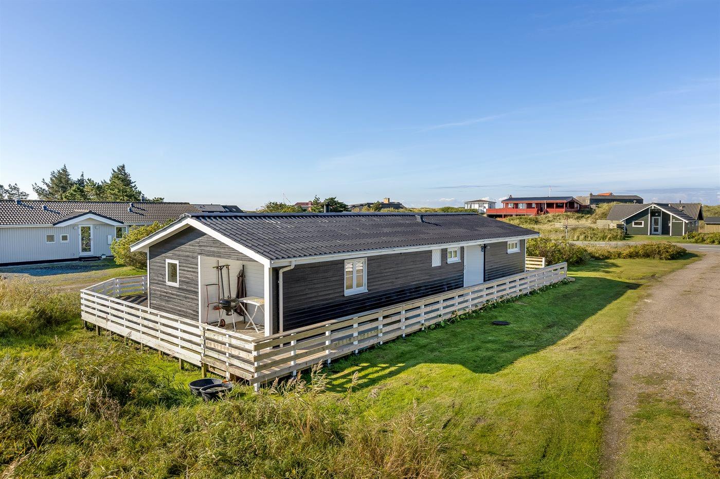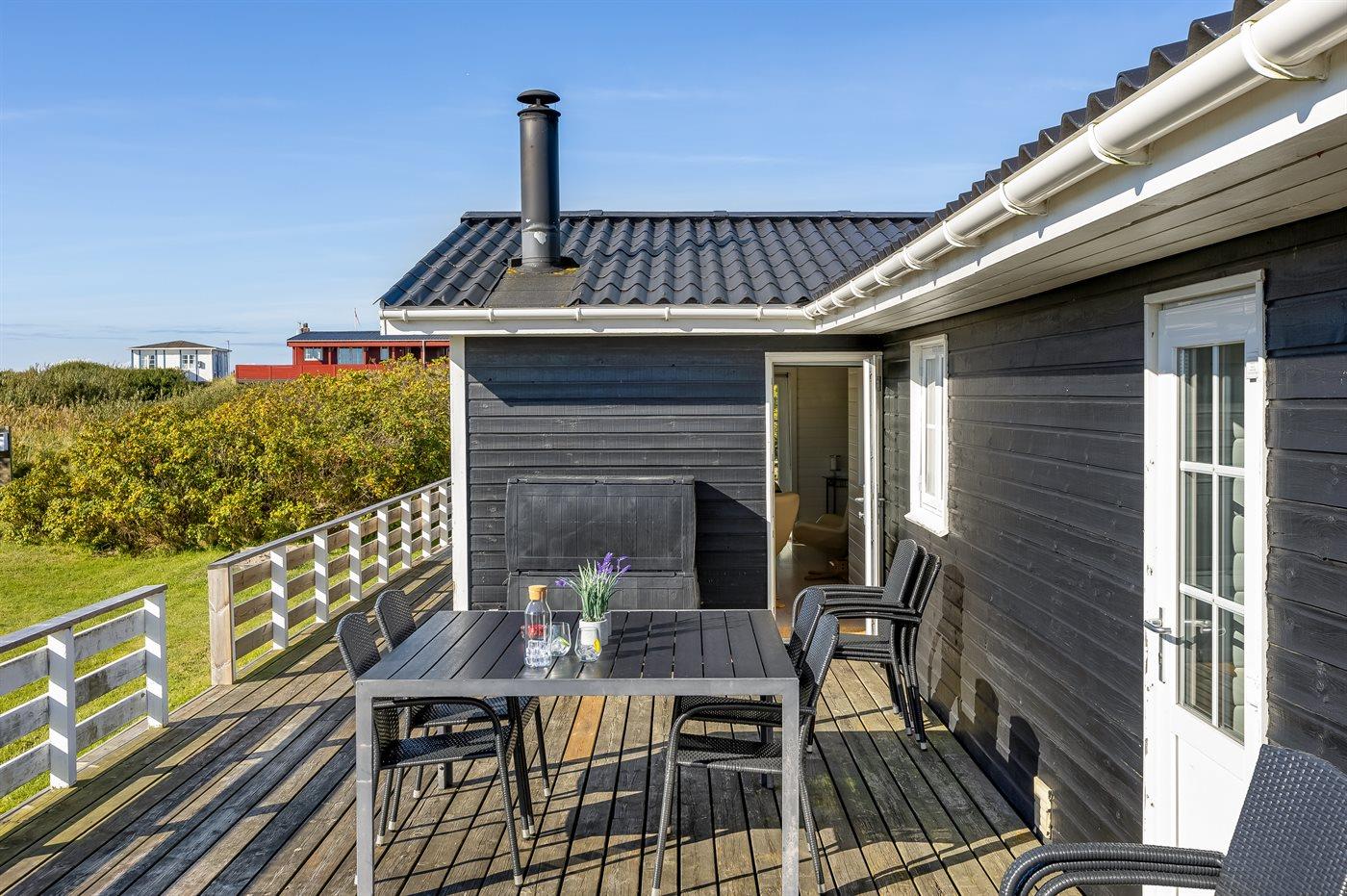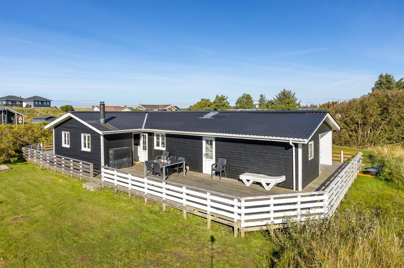 Nur 500 m vom schönen Strand entfernt finden Sie dieses hübsche Ferienhaus, das von einem schönen, großen und teilweise überdachten Terrassenareal umgeben ist.