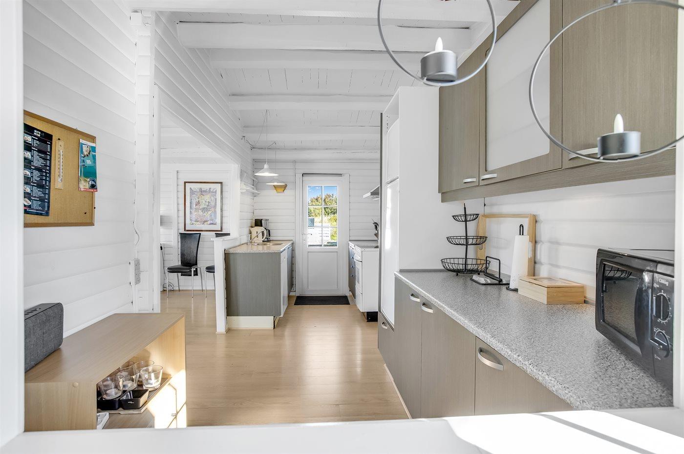 Die Küche ist mit Kühlschrank ausgestattet. Außerdem gibt es 4 elektrische Kochplatten, Backofen, Mikrowelle sowie Geschirrspüler.