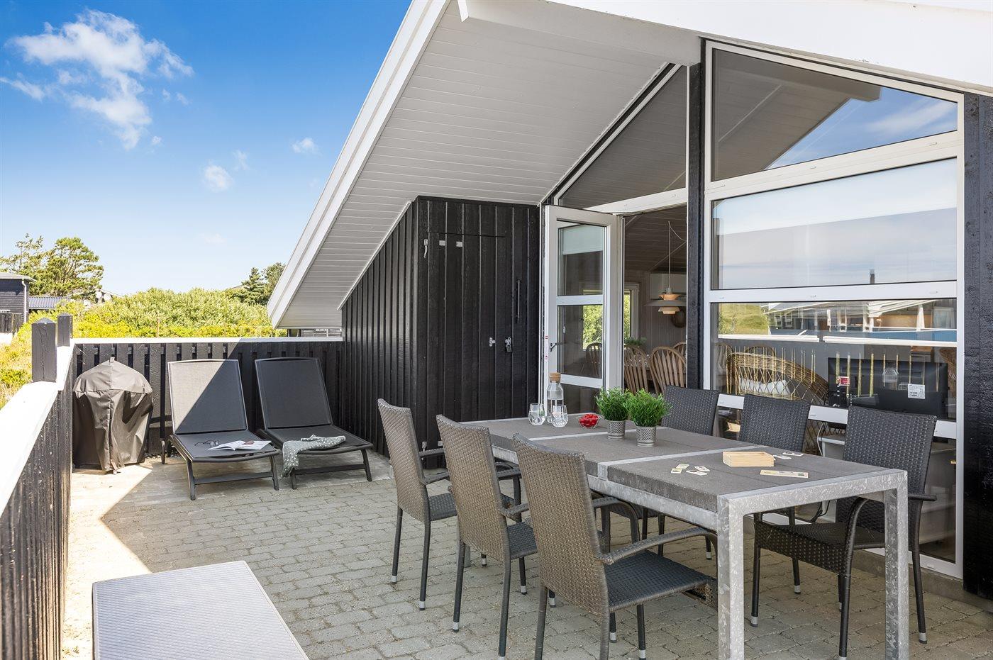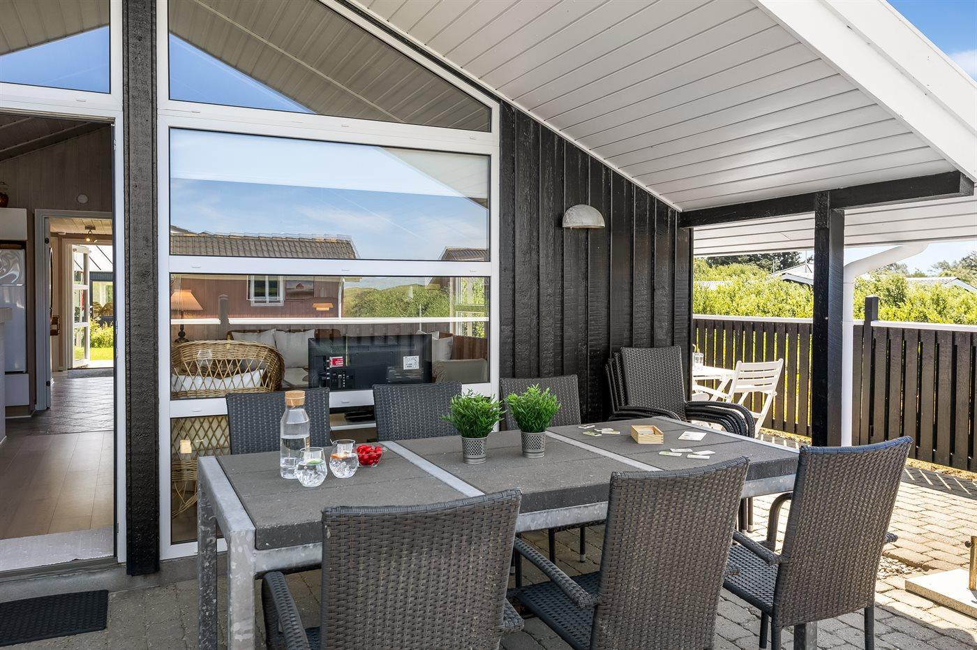 Zum Haus gehört eine schöne sowohl offene als auch überdachte und abgeschirmte Terrasse, von der aus du den Blick auf die Dünen genießen kannst. Hochwertige Gartenmöbel und ein Weber-Grill stehen zur Verfügung.