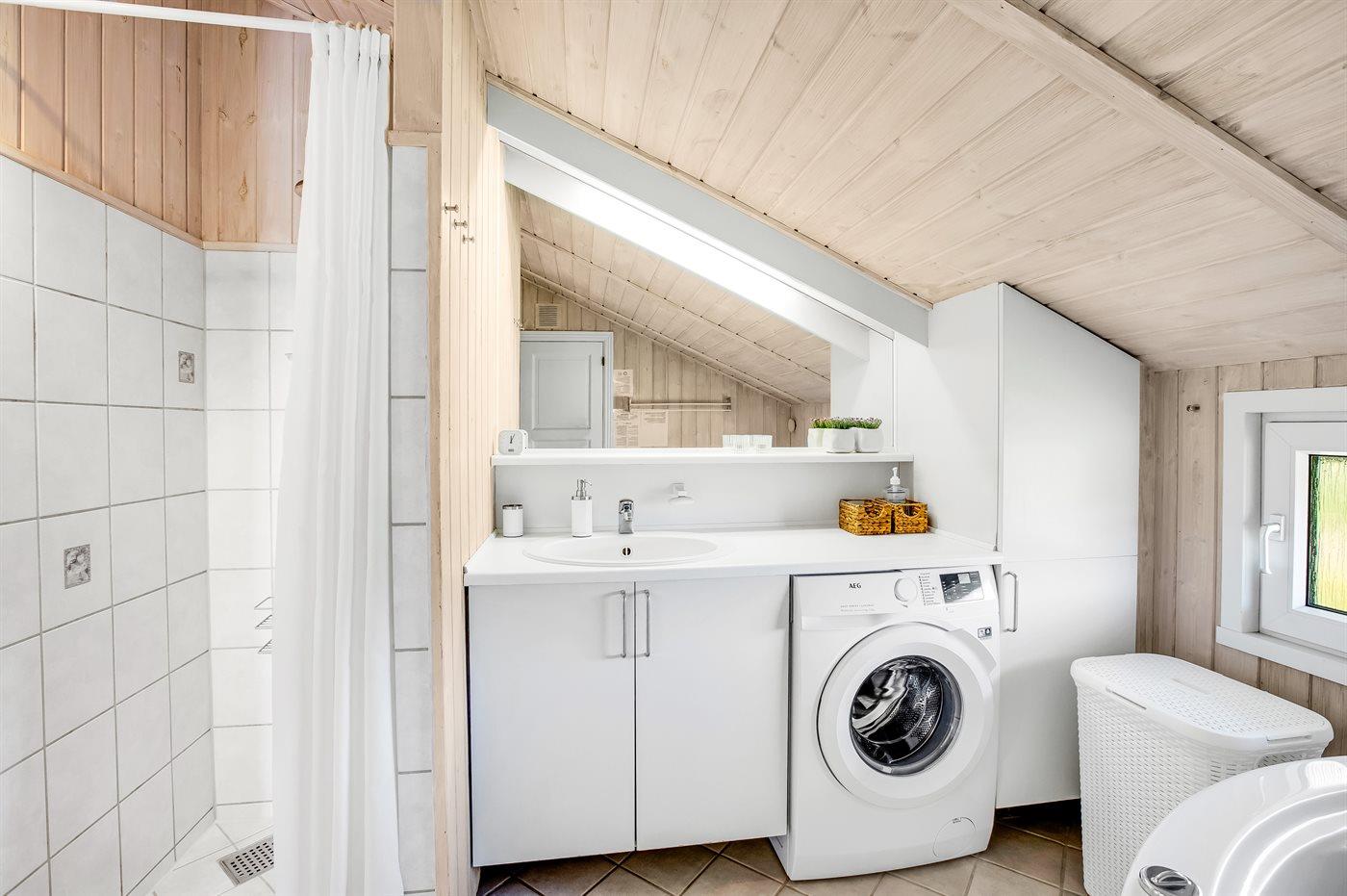 Schönes Badezimmer mit beheizbarem Fliesenboden, Duschnische, Waschmaschine, 2-Personen-Whirlpool und Zugang zur Sauna des Hauses. Die moderne und gut ausgestattete Küche verfügt u. a. über Kühlschrank, Tiefkühlgerät, Geschirrspüler, Mikrowelle, Cerankochfeld und Umluftofen.