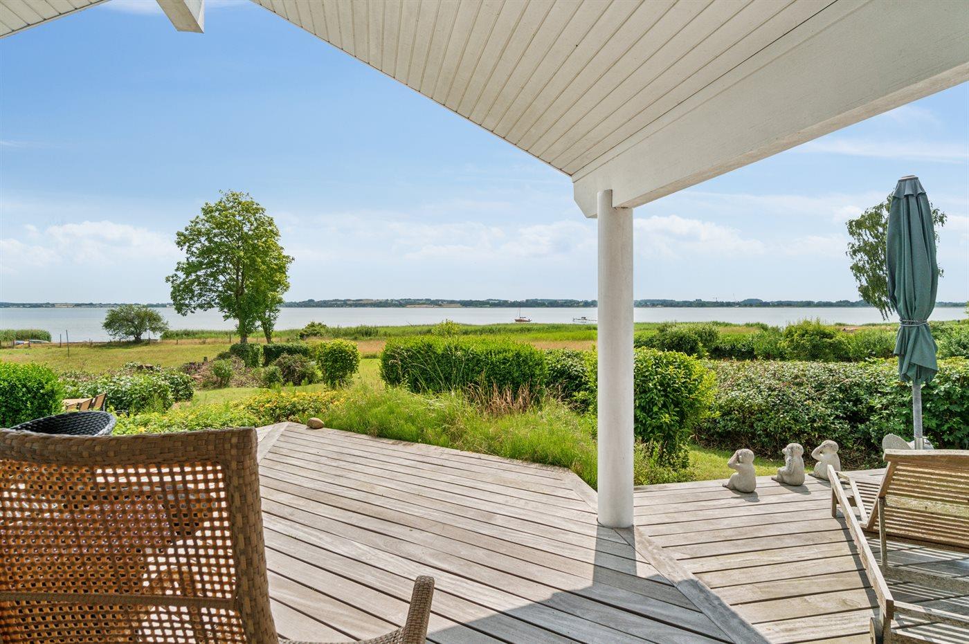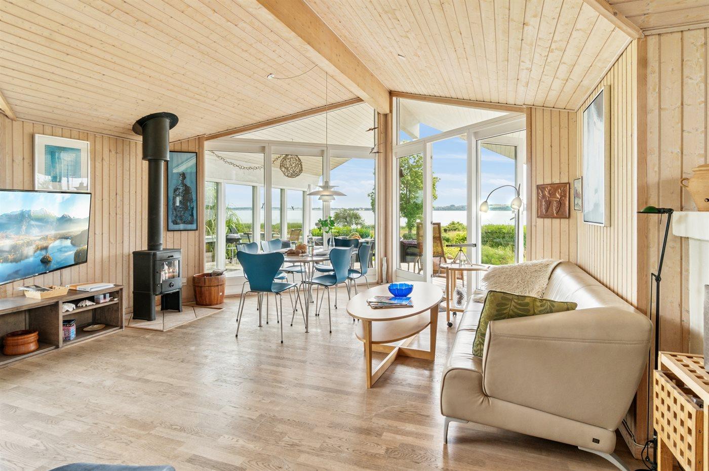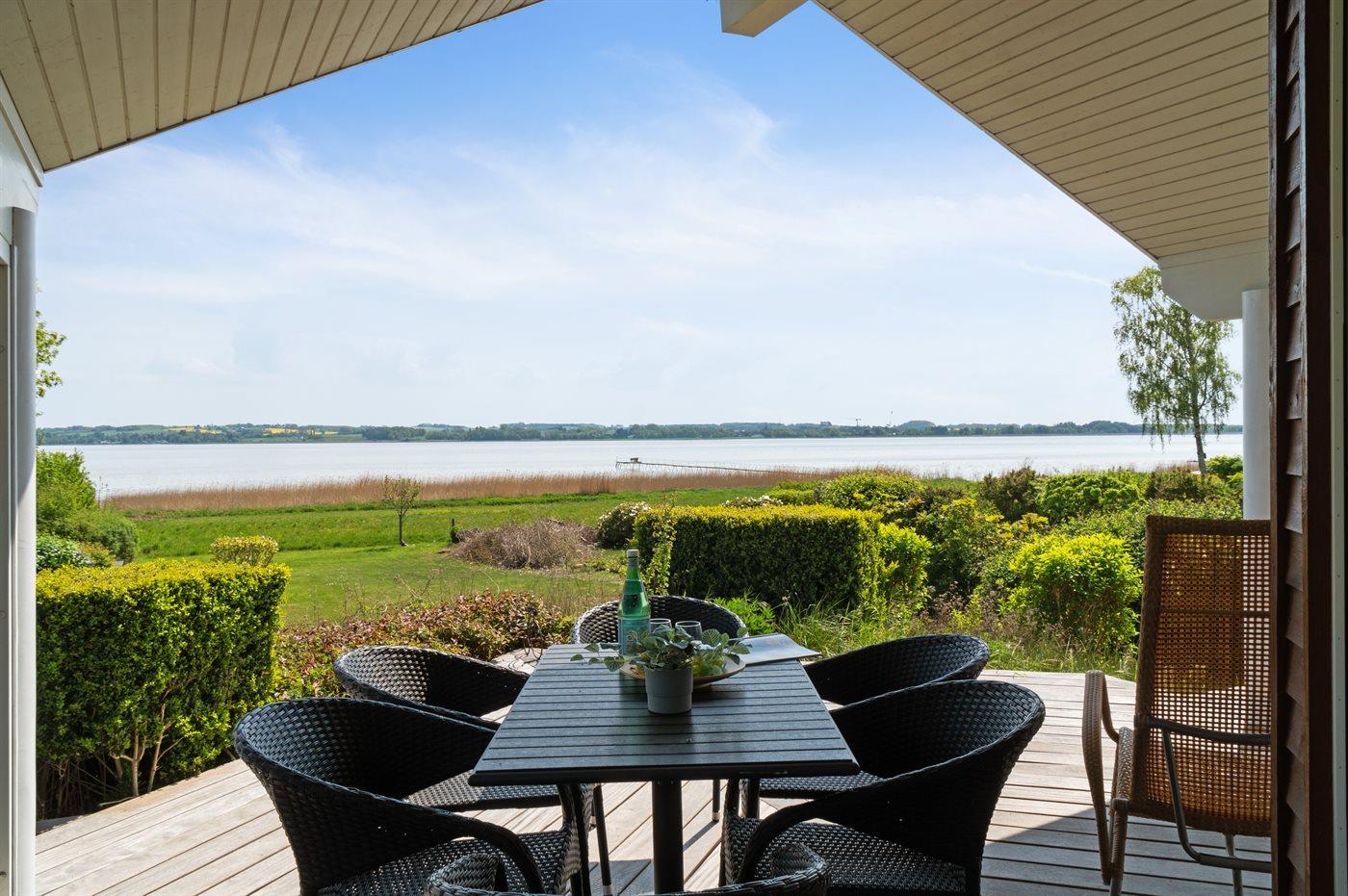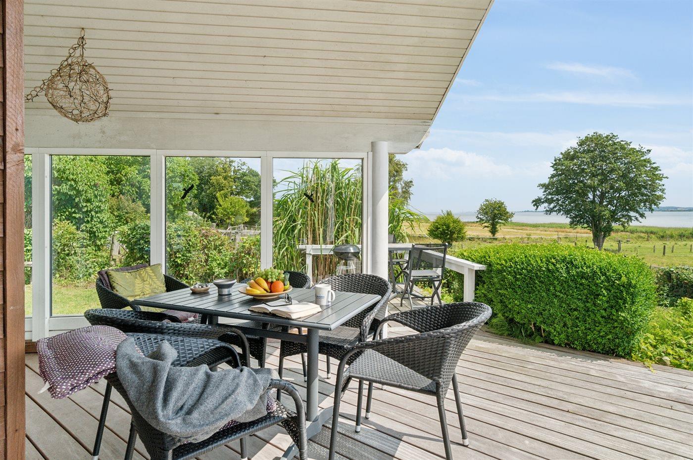 Panoramablick auf den Lammefjord, kinderfreundlich, mit Terrasse und Kaminofen, ideal für naturnahe Erholung in Dänemark.