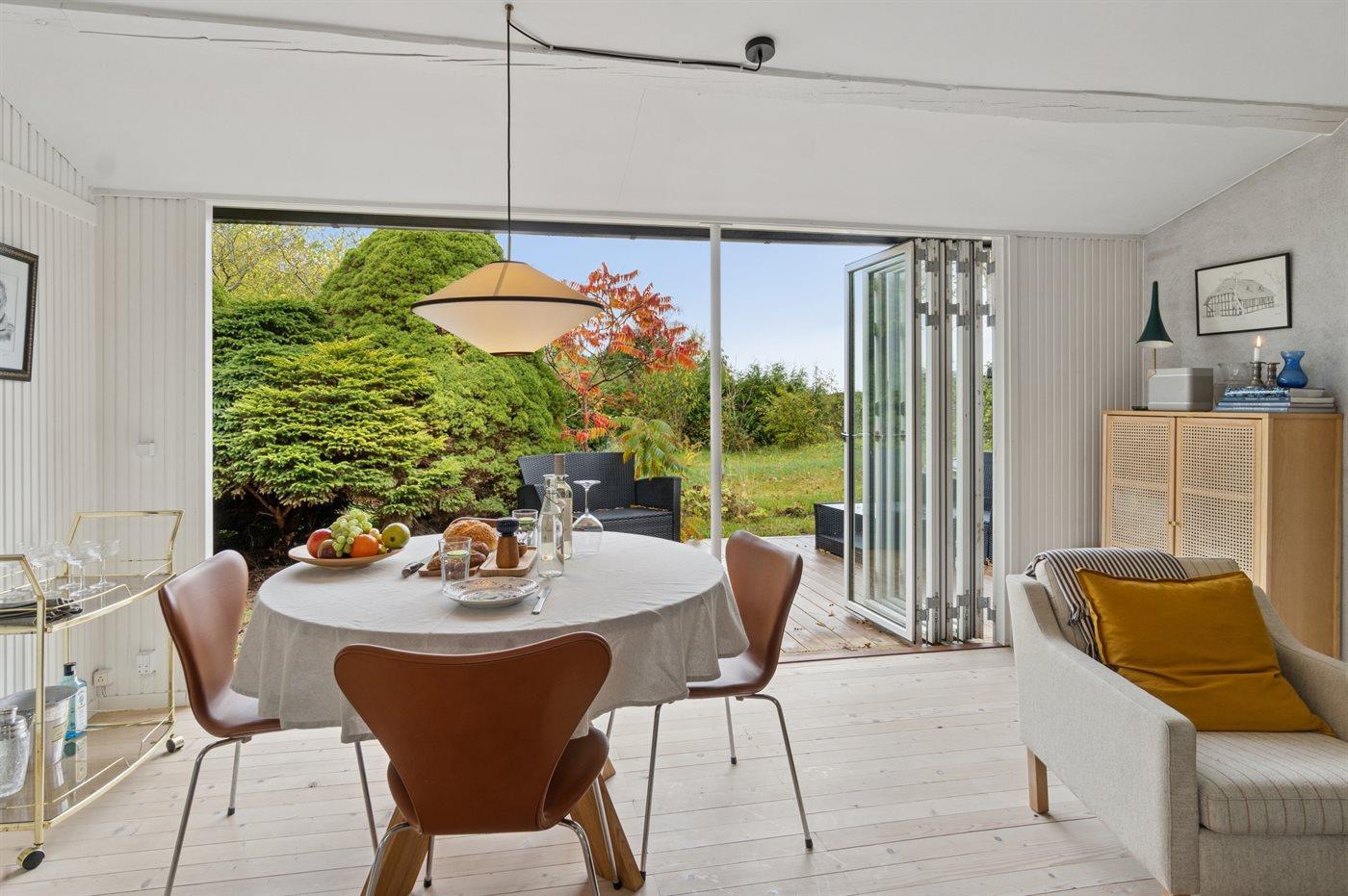 Das Haus verfügt über eine schöne Küche in offener Verbindung mit dem Wohnzimmer und dem Essbereich. Das große Fenster im Wohnzimmer kann geöffnet und zur Seite geschoben werden, sodass das Leben im Freien nach innen geholt wird und du freien Zugang zur Terrasse hast. Rund um das Haus gibt es schöne Terrassen und eine attraktive Bepflanzung, die dazu einlädt, draußen zu sein und die Sonne sowie das gute Wetter zu genießen.
