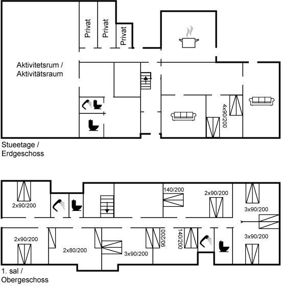Die Schlafplätze verteilen sich auf 9 Schlafräume. 20 Schlafplätze in Doppelbetten. 6 Schlafplätze in Einzelbetten. Ferner stehen 3 Kinderbetten zur Verfügung.