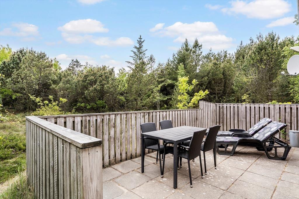 Vom Wohnraum treten Sie hinaus auf die schöne Terrasse, die dank Ihrer Ausrichtung gen Süden wunderbar sonnig ist. Auf der Terrasse können Sie sich nach Herzenslust sonnen und entspannen - untermalt von einem schönen Ausblick auf die Bäume und Büsche des Naturgrundstücks. Der schöne Gesang der Vögel in den Baumkronen macht die friedvolle Ferienhausidylle perfekt.
