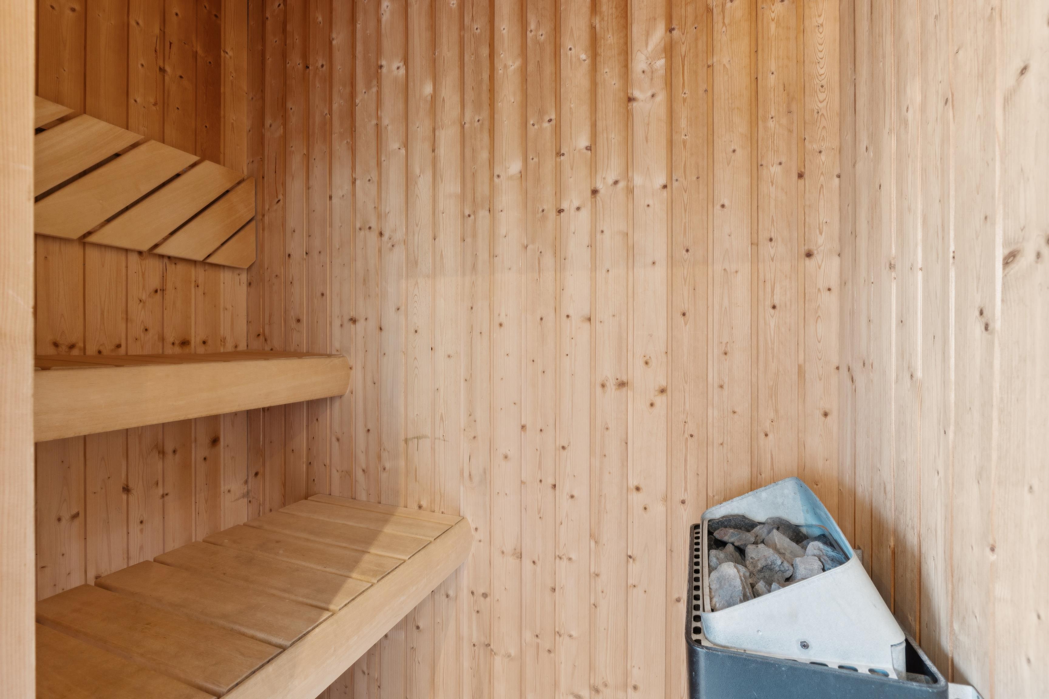 Das Badezimmer ist mit Fußbodenheizung und Whirlpool (auf den Bildern noch nicht installiert) sowie Sauna ausgestattet - ideal zum Entspannen nach einem aktiven Tag an dem 200 m entfernten Angelsee oder dem 800 m entfernten Golfplatz. Relaxt nach einem Saunagang draußen auf den Sonnenliegen, die auf der großen nach Süden ausgerichteten Terrasse bereit stehen oder grillt dort eueren selbstgefangenen Fisch und genießt den Abend mit einem guten Glas Wein und Freunden. Hier könnt ihr sowohl morgens den Sonnenaufgang als auch Abends den Sonnenuntergang bewundern.