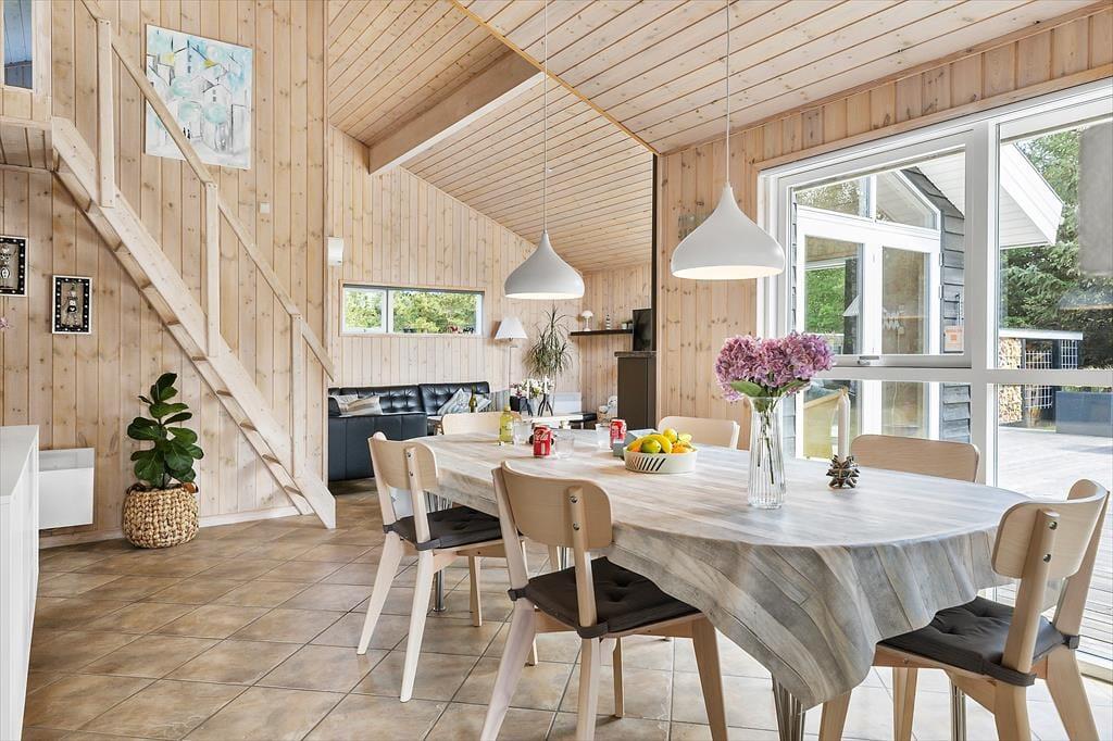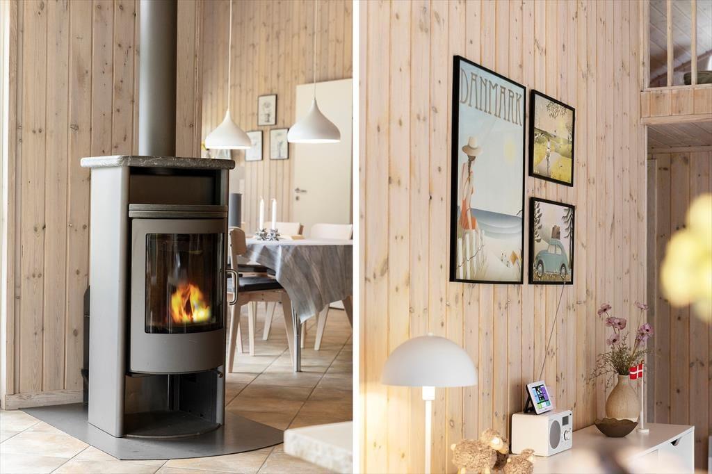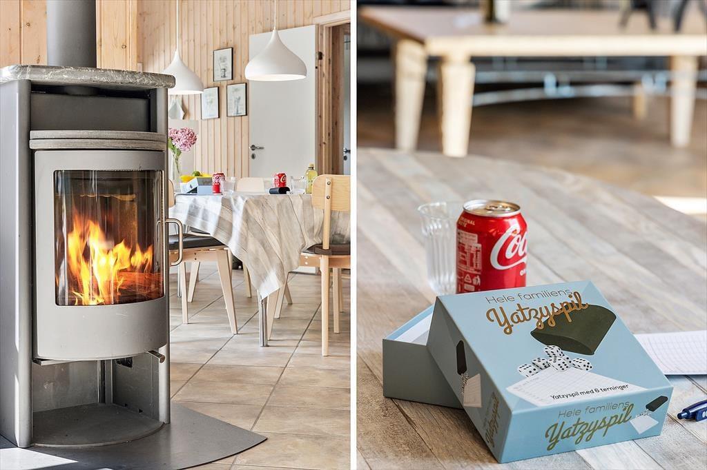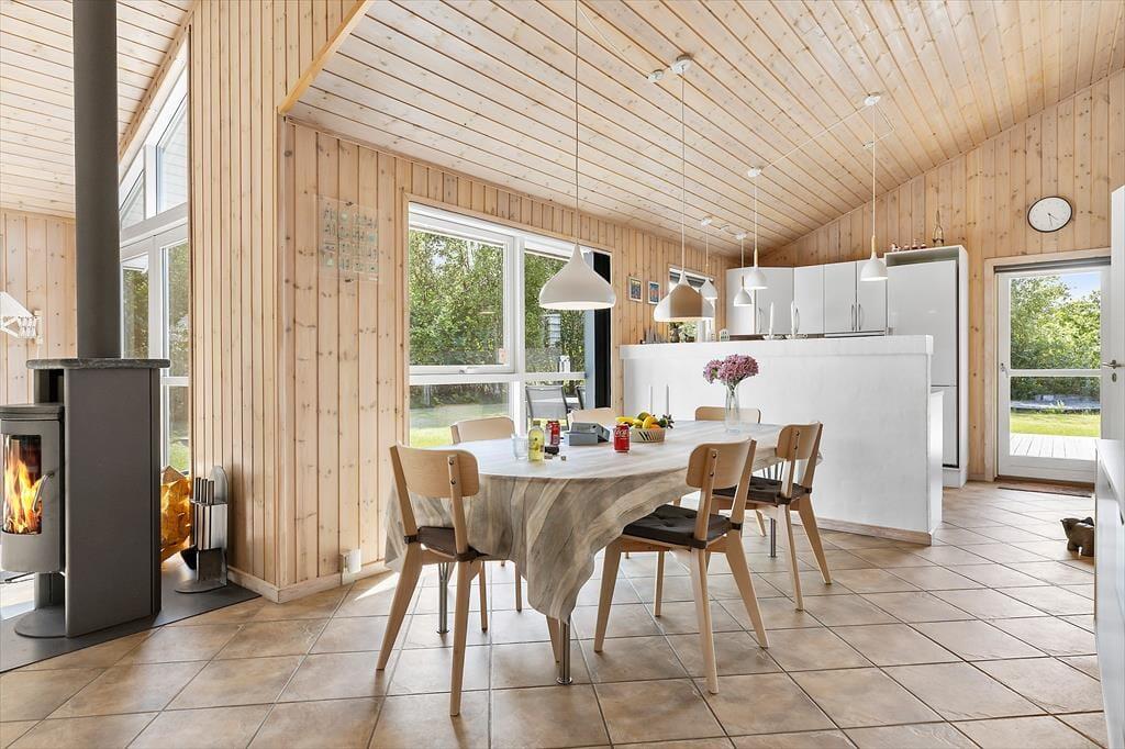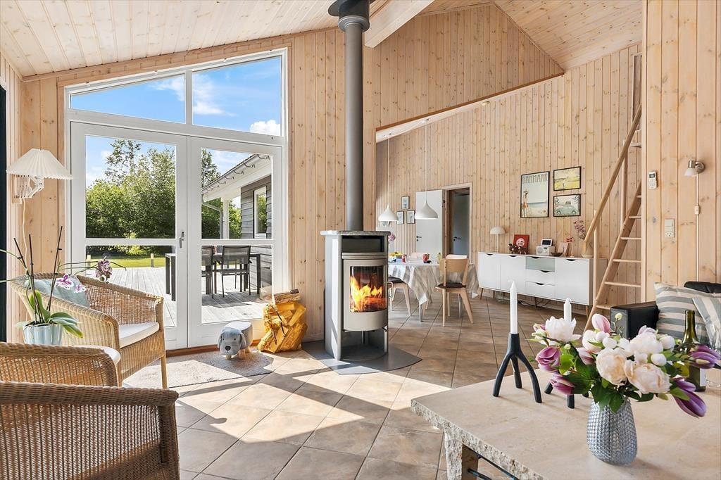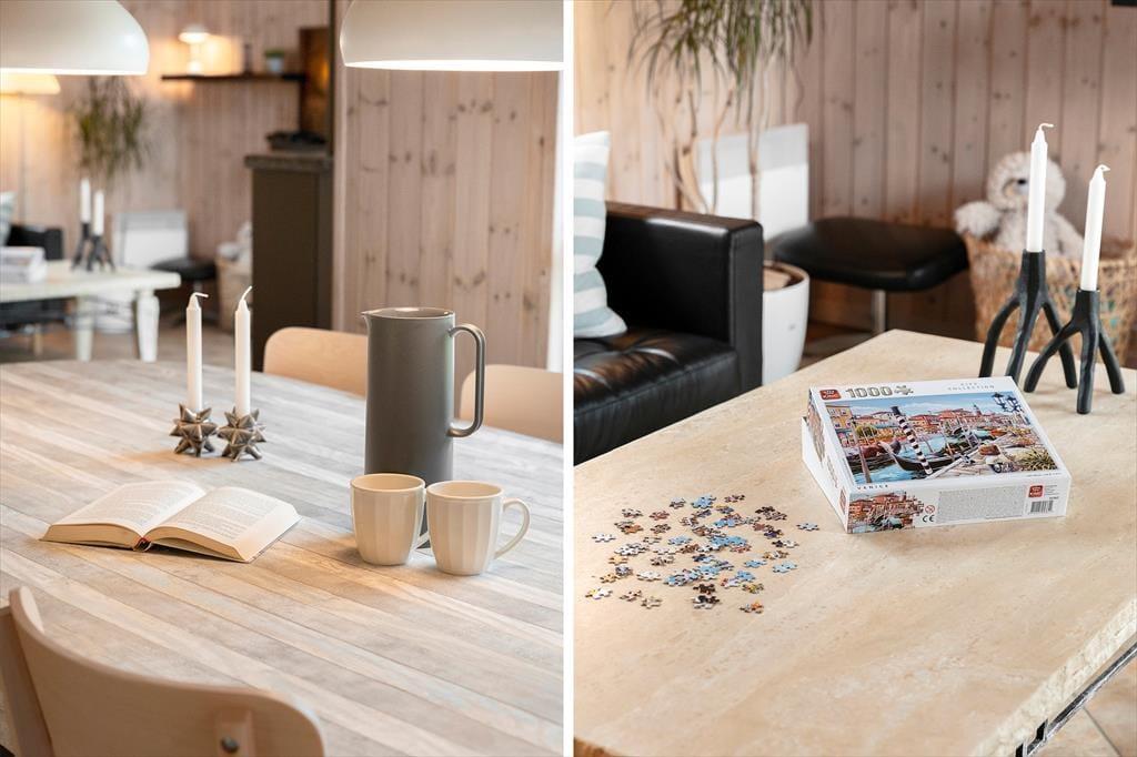 Das Ferienhaus besticht durch eine helle und freundliche Atmosphäre, die Sie sofort willkommen heißt. Das Wohnzimmer ist geräumig und verfügt über große Fenster, die das Tageslicht hereinlassen und einen schönen Blick auf die grüne Umgebung bieten. Der offene Grundriss zwischen Wohnzimmer und Küche macht es einfach, Zeit miteinander zu verbringen, sei es beim Kochen, Spielen oder Entspannen auf dem Sofa. Mit seiner einladenden Einrichtung und den bequemen Möbeln ist das Haus ideal für gemütliche Stunden mit der Familie – ob vor dem Kamin an einem kühlen Abend oder am Esstisch bei einem gemeinsamen Abendessen.