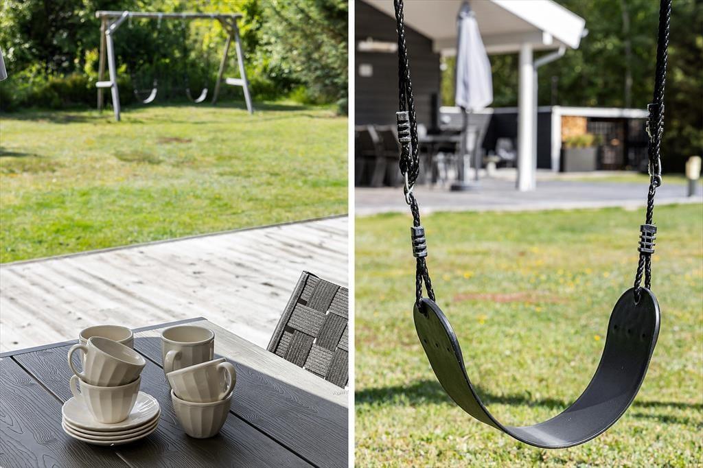 Die Außenbereiche sind ein wahres Vergnügen. Die große Terrasse lädt dazu ein, unter freiem Himmel zu entspannen. Hier gibt es bequeme Gartenmöbel, auf denen Sie Ihren Morgenkaffee, die warme Sonne oder ein leckeres Grillabendessen genießen können. Das Grundstück bietet eine große Rasenfläche, auf der Kinder gerne spielen – hier ist viel Platz für Ballspiele und andere Aktivitäten. Die naturschöne Umgebung sorgt dafür, dass Sie zur Ruhe kommen und die kleinen Freuden des Urlaubs genießen können, während Vogelgesang und der Duft des Sommers eine besondere Atmosphäre schaffen.