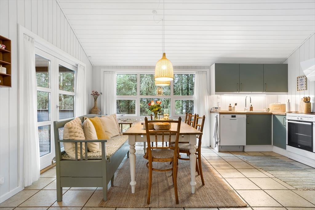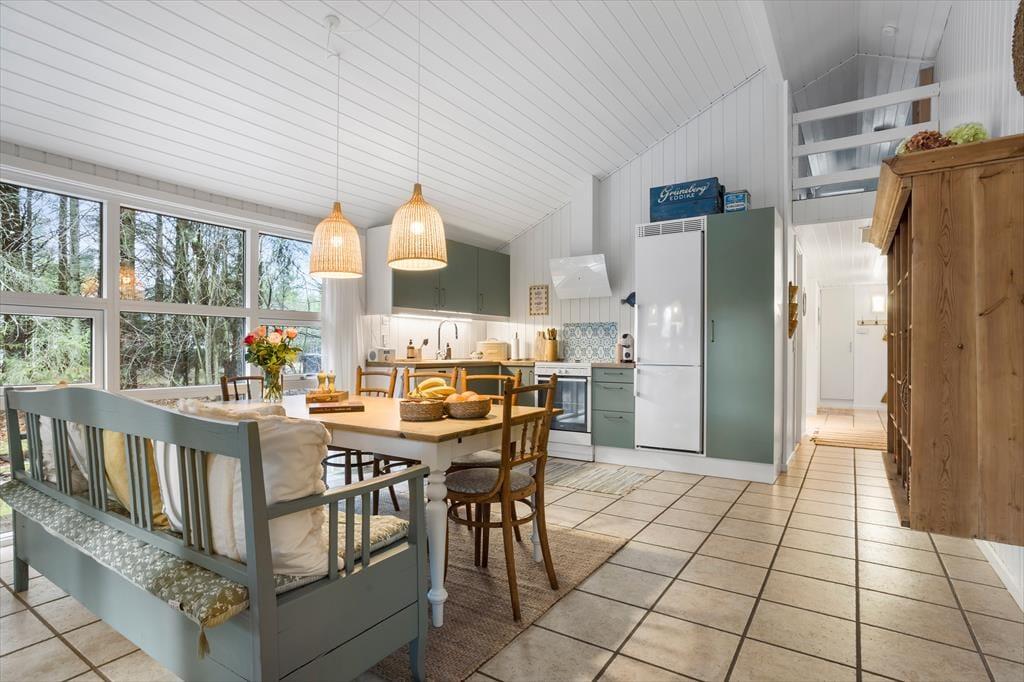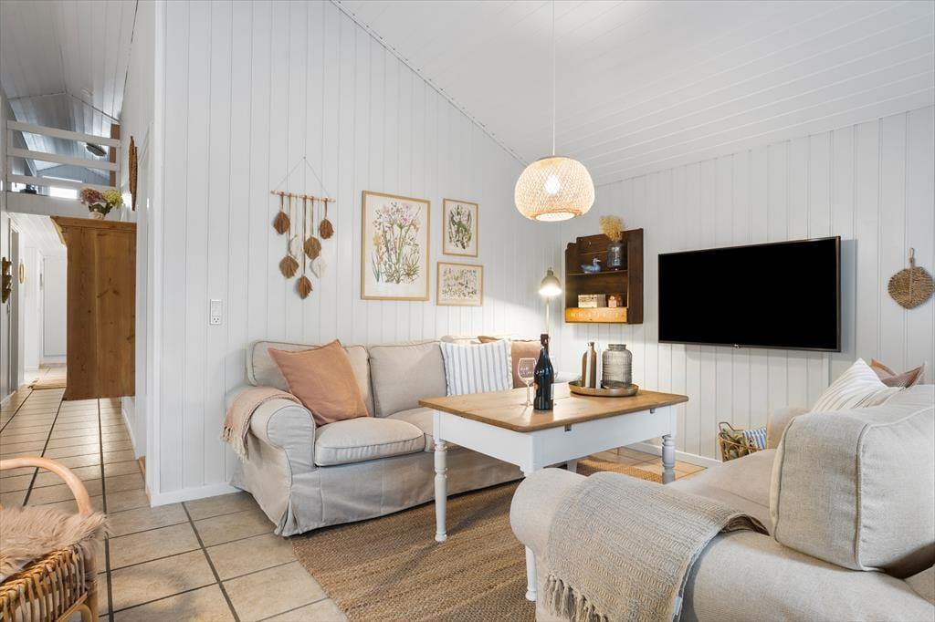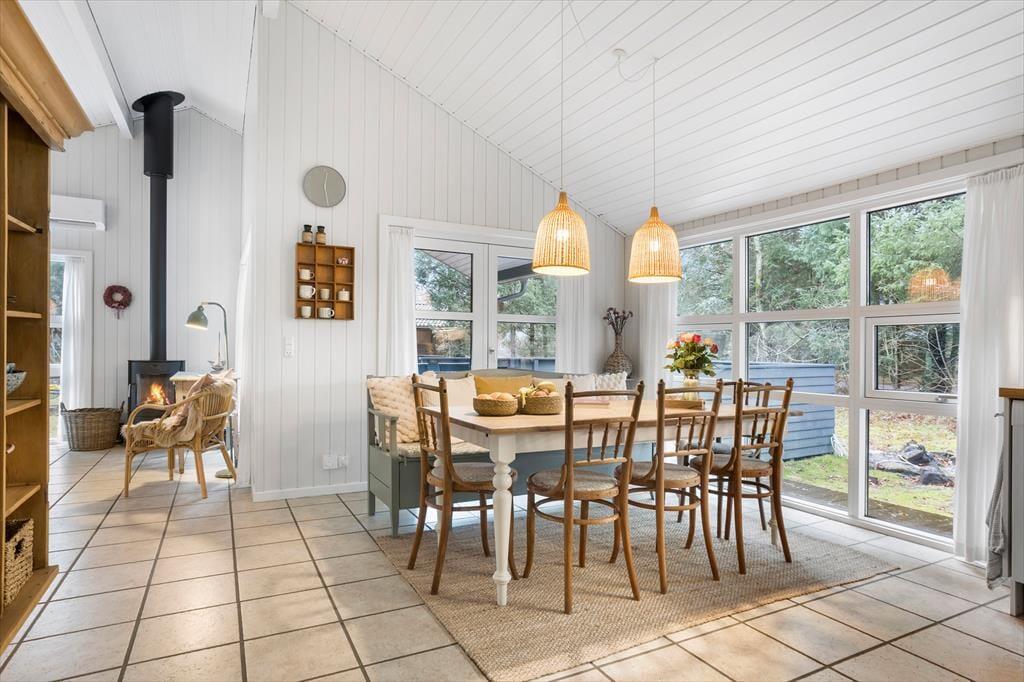 Dieses charmante Ferienhaus bietet eine helle und freundliche Atmosphäre, in der du dich sofort wie zu Hause fühlst. Der Kamin im Wohnzimmer sorgt für gemütliche Stunden, sei es bei Brettspielen mit der Familie oder entspannten Momenten mit einem guten Buch. Die Einrichtung ist praktisch und einladend, und mehrere Zimmer haben direkten Zugang zum Außenbereich, was das Leben drinnen und draußen mühelos verbindet. Die Küche und das Wohnzimmer sind offen gestaltet, sodass du gemeinsam kochen und die Mahlzeiten in entspannter Atmosphäre genießen kannst.