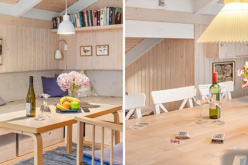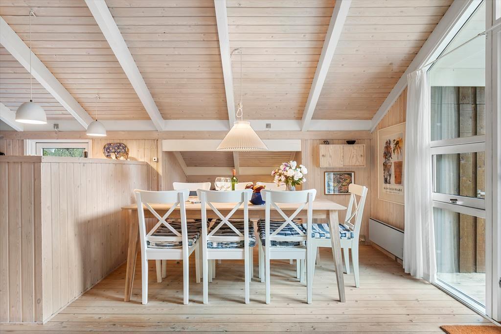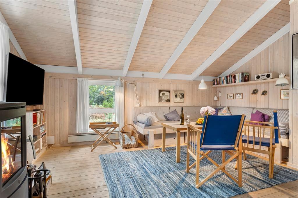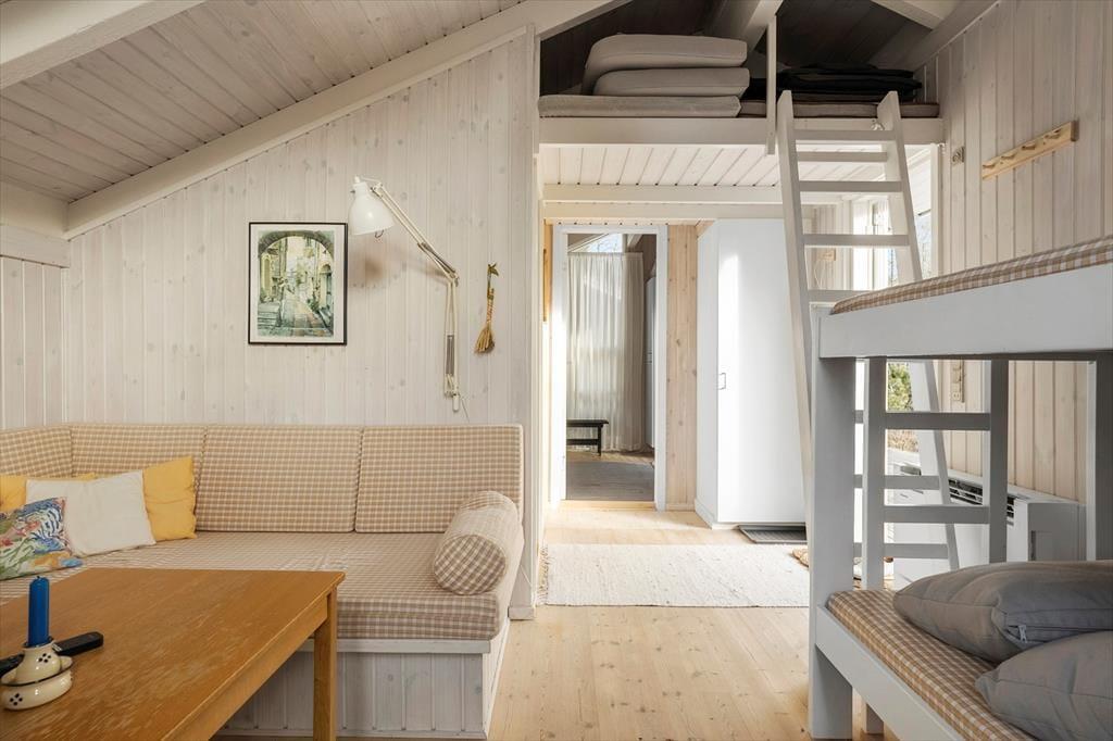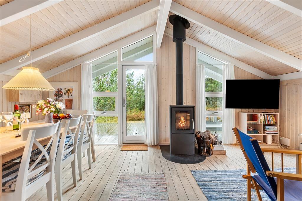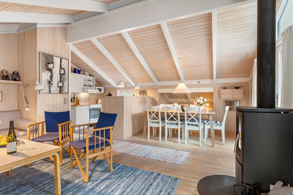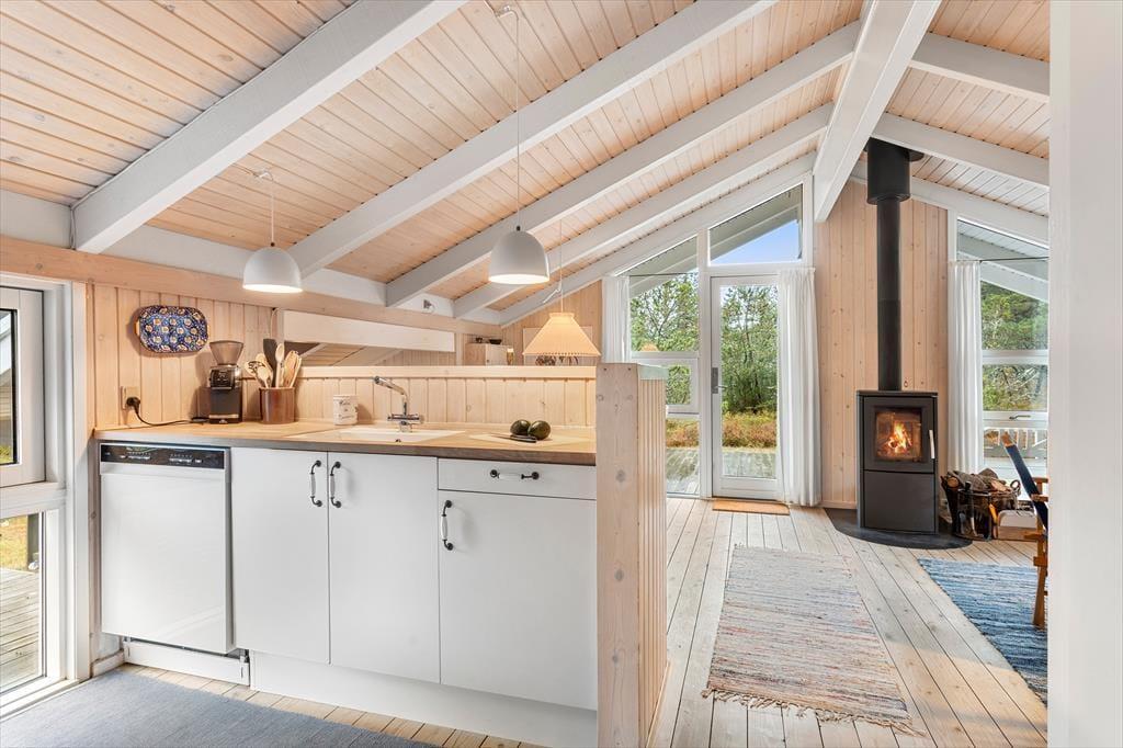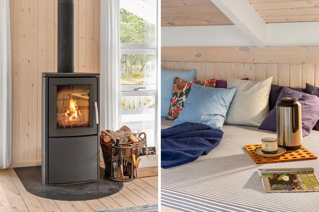 Beim Betreten des Hauses spürt man sofort die helle und einladende Atmosphäre, die einem das Urlaubsgefühl leicht macht. Die Einrichtung ist gemütlich und geschmackvoll – eine harmonische Kombination aus klassischem Ferienhauscharme und modernem Komfort. Der helle Wohnbereich ist der Mittelpunkt des Hauses: Hier können Sie Ihren Kaffee auf dem Sofa genießen, gemeinsam Spiele spielen oder sich vor dem Kamin aufwärmen, während Sie den leisen Geräuschen der Natur lauschen. Im Wohnzimmer gibt es außerdem eine gemütliche Alkove – perfekt für ein Nickerchen, zum Lesen oder für die Kinder, die sich mit einem Film entspannen möchten. Die Küche ist offen in den Wohnraum integriert, sodass Sie auch während des Kochens miteinander plaudern können. Zwei Badezimmer sorgen für einen entspannten Start in den Tag – eines davon befindet sich im Annex, der sich somit ideal als eigenständiger Rückzugsort für Gäste eignet. Der Annex bietet zusätzliche Schlafplätze und Privatsphäre, wenn man sich einmal zurückziehen möchte.