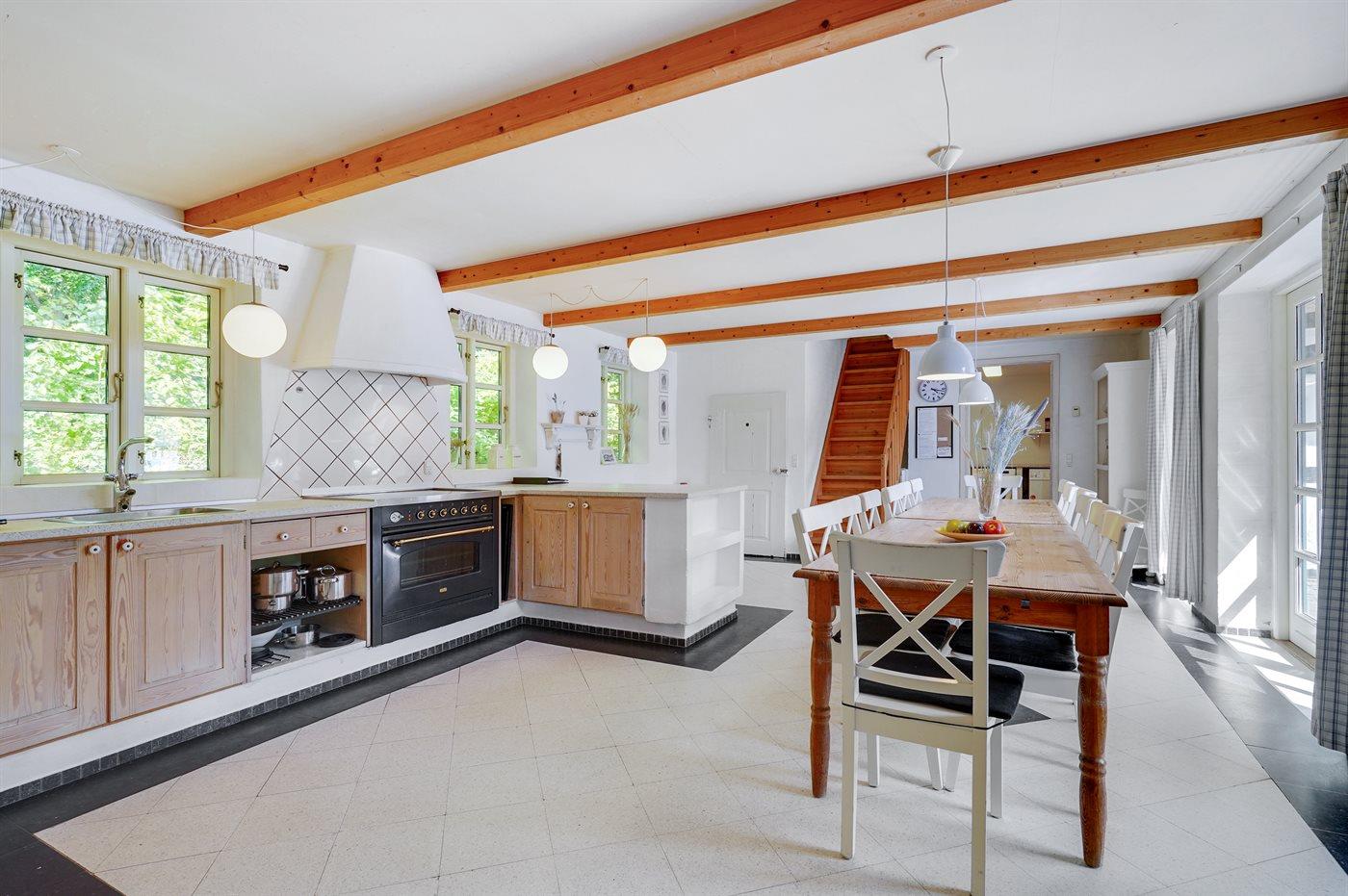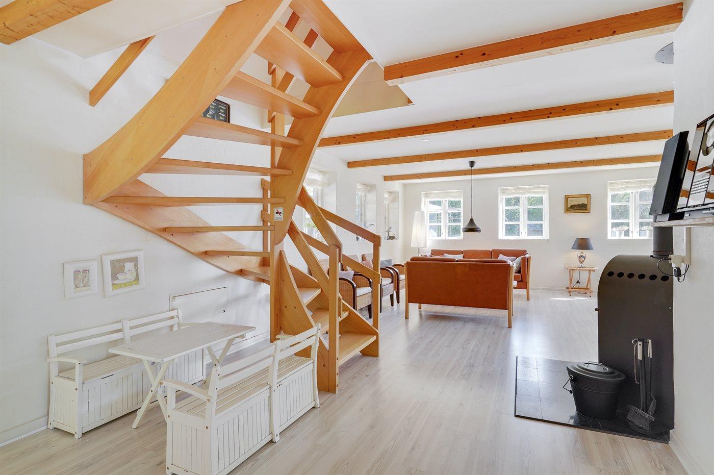 Dieser ehemalige Bauernhof eignet sich für 16 Personen. 2 der Schlafplätze eignen sich jedoch nur für größere Kinder (4-11 Jahre). Die Ferienunterkunft hat eine Wohnfläche von 429 m², ist 2-stöckig, und wurde 1827 gebaut. 2002 wurde die Ferienunterkunft renoviert. 2020 wurde die Ferienunterkunft teilweise renoviert. Haustiere dürfen nicht mitgebracht werden. Fußbodenheizung im Wohnzimmer. Fußbodenheizung in der Diele. Fußbodenheizung im Wohnraum. Die Ferienunterkunft ist mit Waschmaschine ausgestattet. Wäschetrockner. Tiefkühlmöglichkeit mit 50 Liter Nutzinhalt. Es gibt außerdem einen Kaminofen. Für die jüngsten Feriengäste ist 1 Kinderhochstuhl vorhanden. Wickeltisch.