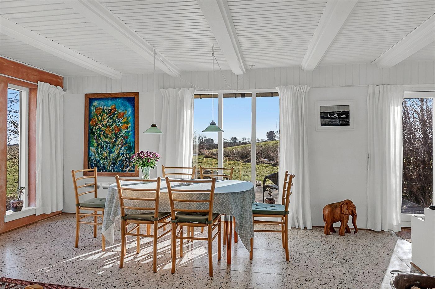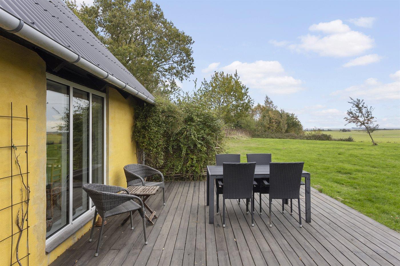 Gemütliches Ferienhaus in sehr ungestörter Lage mit Blick auf offene Felder und das Wasser.