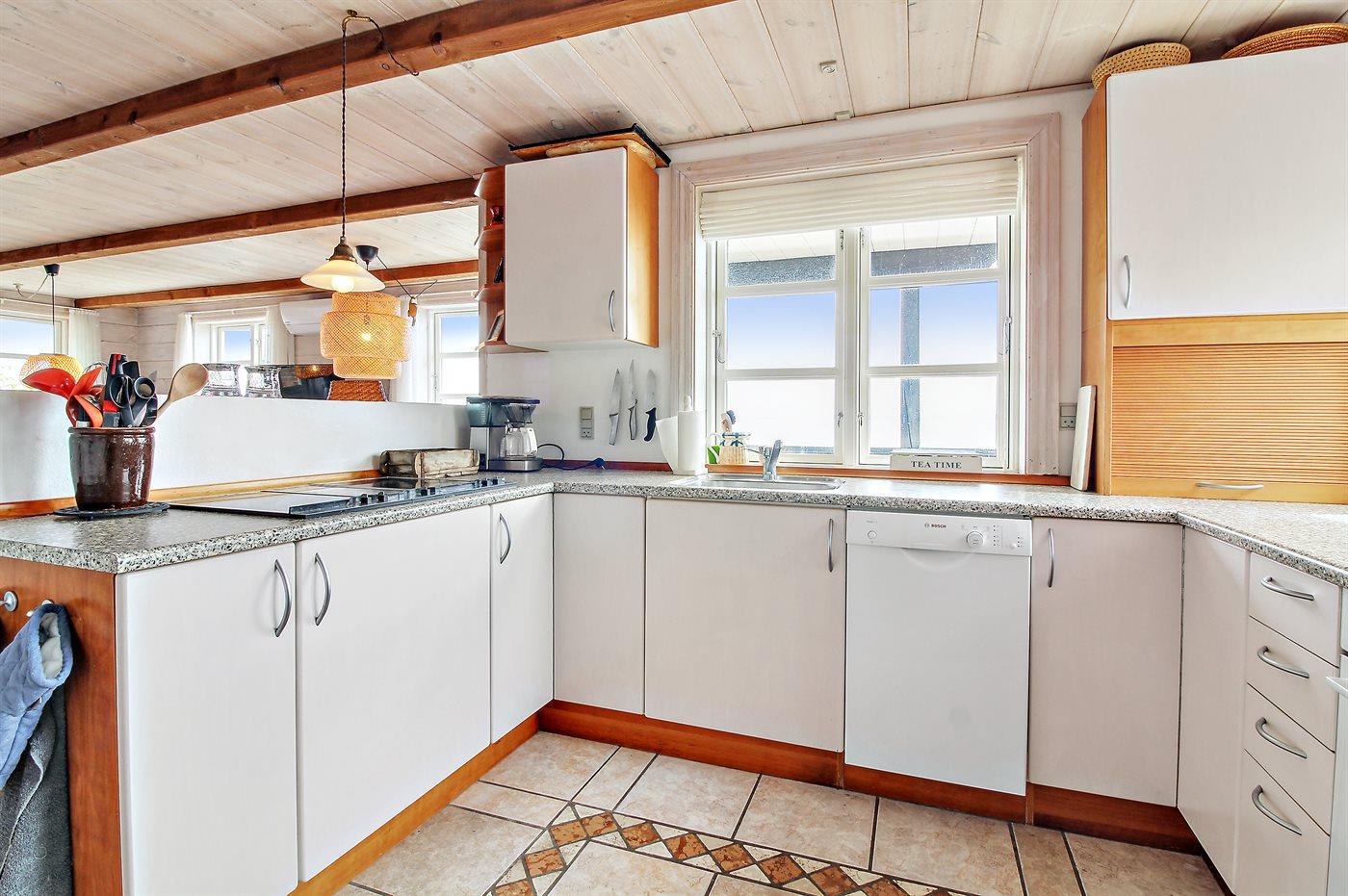 Die Küche ist mit Kühlschrank ausgestattet. Außerdem gibt es 4 Keramik-Kochfelder, Umluftofen, Mikrowelle sowie Geschirrspüler. Fußbodenheizung in der Küche.