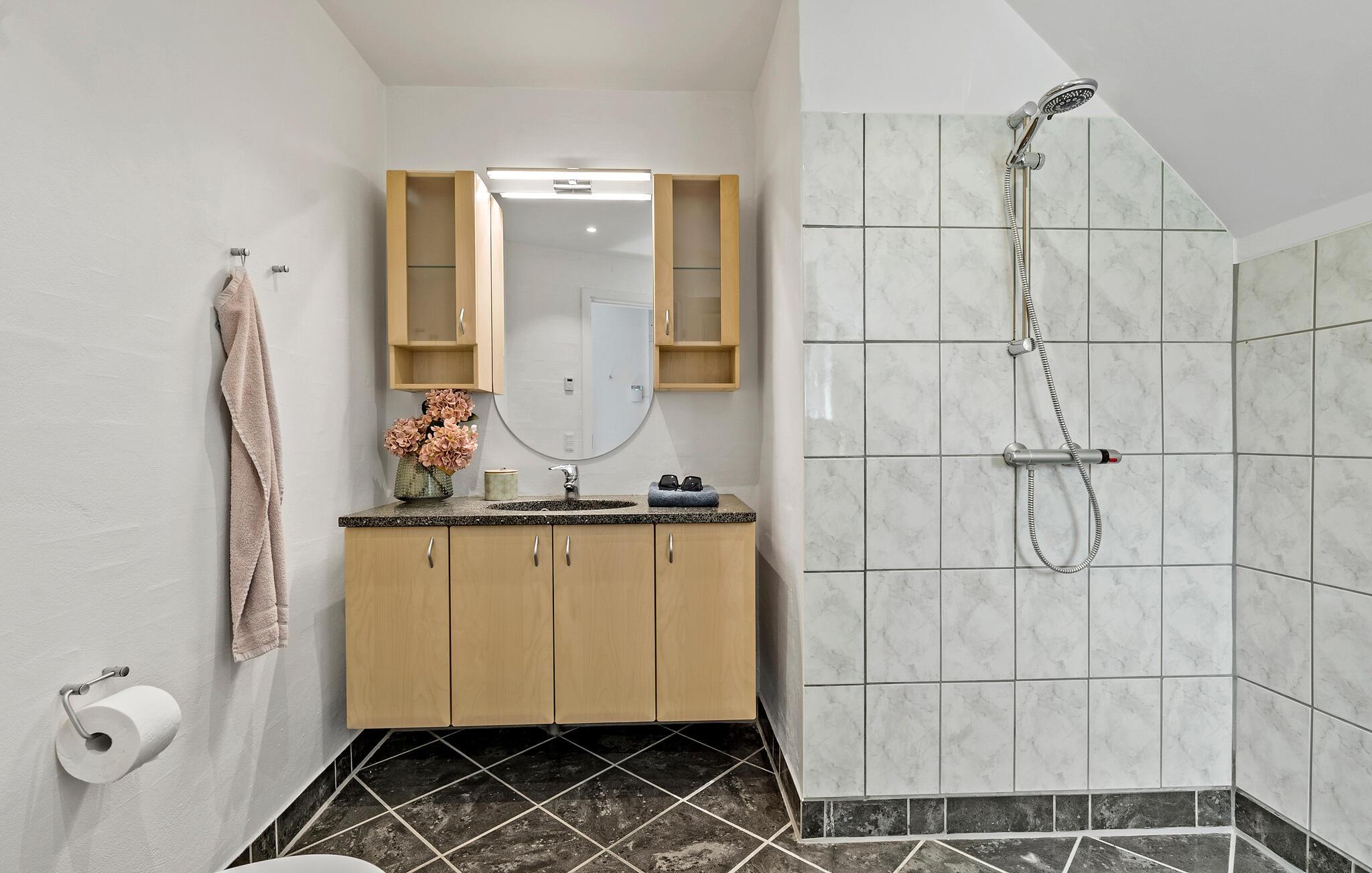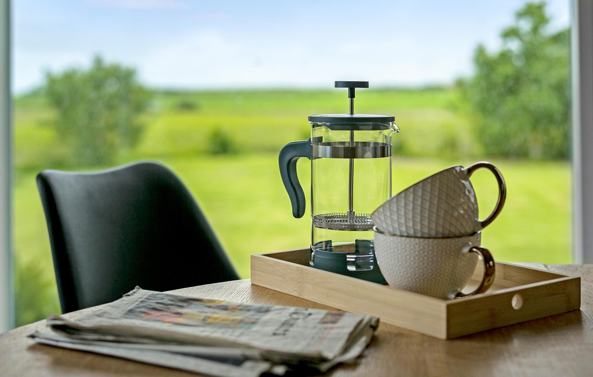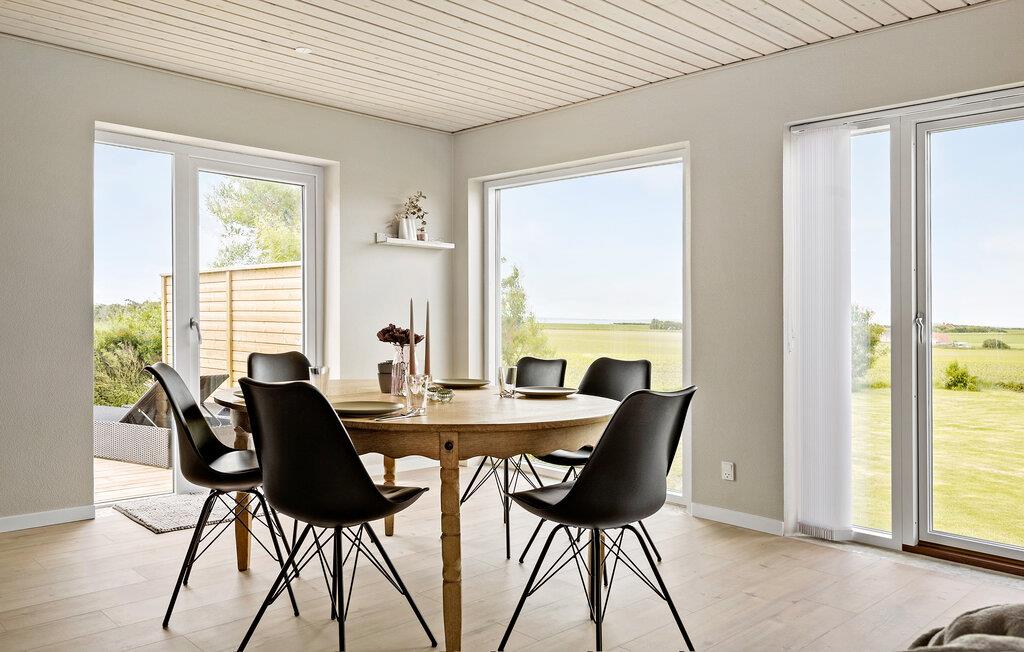 Ihr Ferienhaus bietet Ihnen sowohl Ruhe, Naturerlebnisse als auch Komfort. Das charmante Haus besticht durch seine gemütliche Einrichtung und die geräumige Terrasse, die zu entspannten Stunden an der frischen Luft sowie zum Zubereiten von Grillspezialitäten im Freien einlädt. Freuen Sie sich auf gesellige Abende mit der Familie oder Freunden und genießen Sie die Aussicht auf die weitläufigen Felder und den Fjord in der Ferne. Ihre Küche bietet Ihnen alles, was Sie für die Zubereitung Ihrer gemeinsamen Mahlzeiten benötigen. Genießen Sie diese im hellen Essbereich und freuen Sie sich auch hier über den schönen Blick auf die Umgebung.