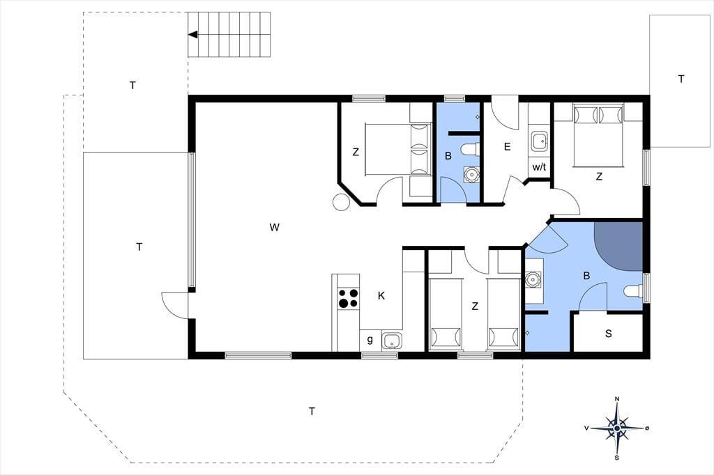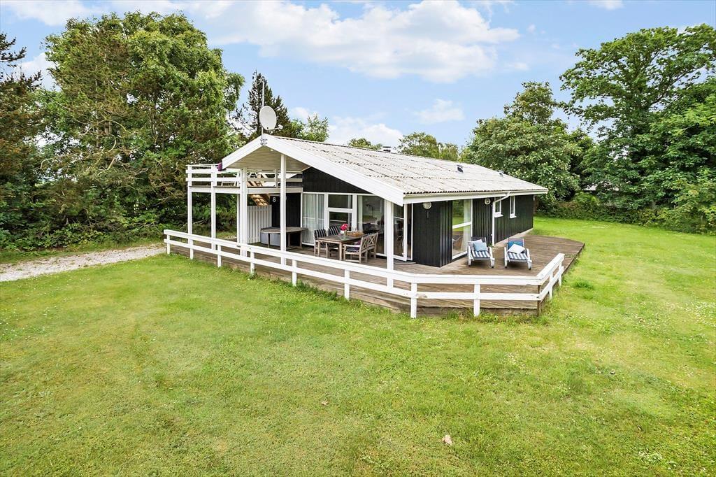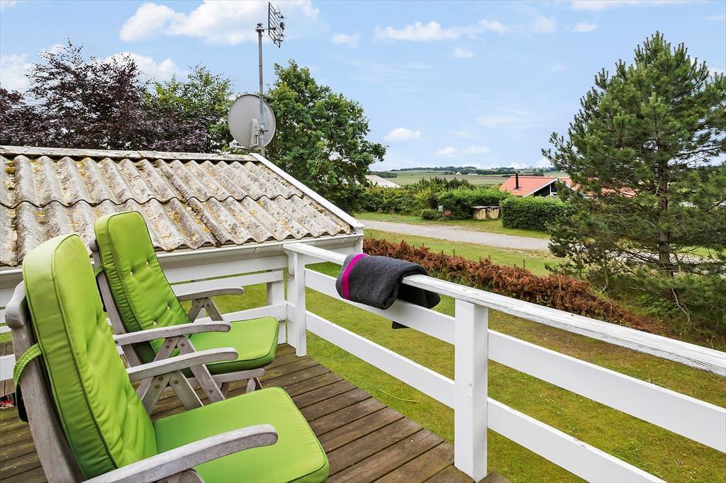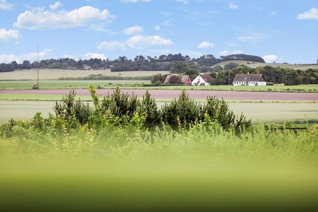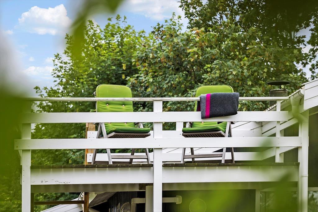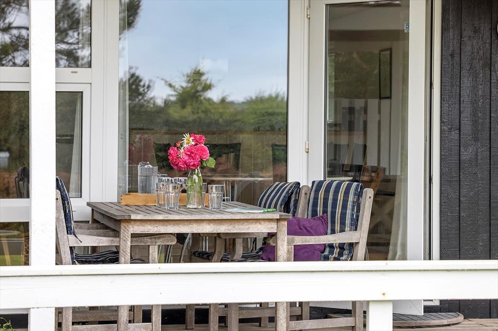 Rund um das Ferienhaus liegt das schöne Grundstück, welches von Büschen und Bäumen umgeben ist. Ein niedriger Reisigzaun im Westen bietet dir zudem die Möglichkeit, das Leben draußen zu beobachten und die Ruhe zu genießen. Vom Essbereich und Wohnzimmer aus führt eine Terrassentür direkt auf die teilweise überdachte Terrasse. Hier kannst du perfekt die Nachmittagssonne genießen. Die Holzterrasse erstreckt sich um eine Seite des Hauses, sodass du genügend Platz hast, um Sonne oder Schutz vor Wind zu finden. Oder du legst dich einfach gemütlich auf eine der Sonnenliegen. Besonders hervorzuheben ist die hohe Terrasse, die über eine Treppe in die Höhe des ersten Stocks führt. Von hier aus hast du einen fantastischen Blick nach Westen und über die Felder im Norden von Samsø. Wir empfehlen dir unbedingt, hier den Sonnenuntergang zu genießen.