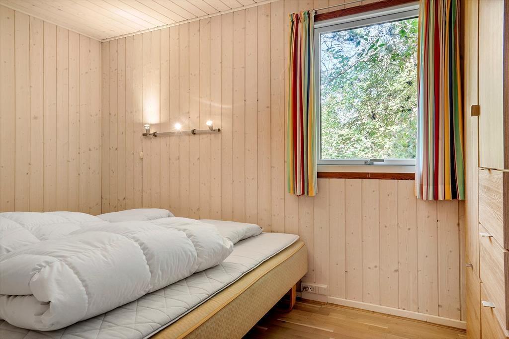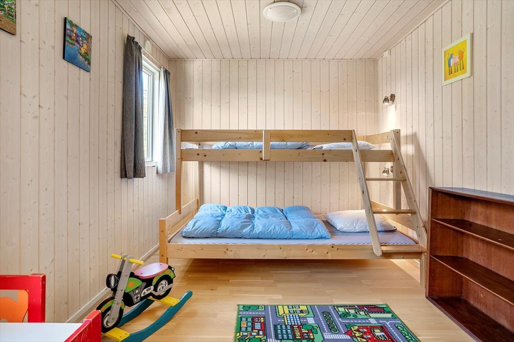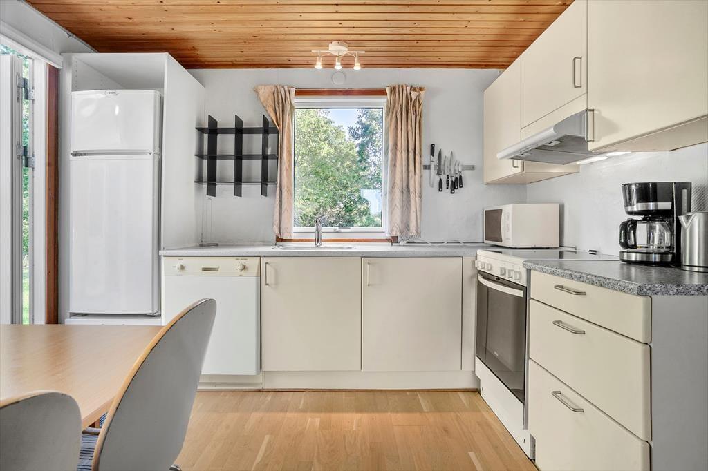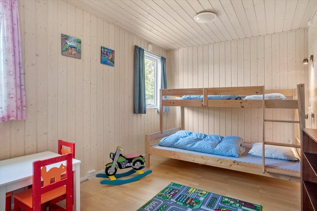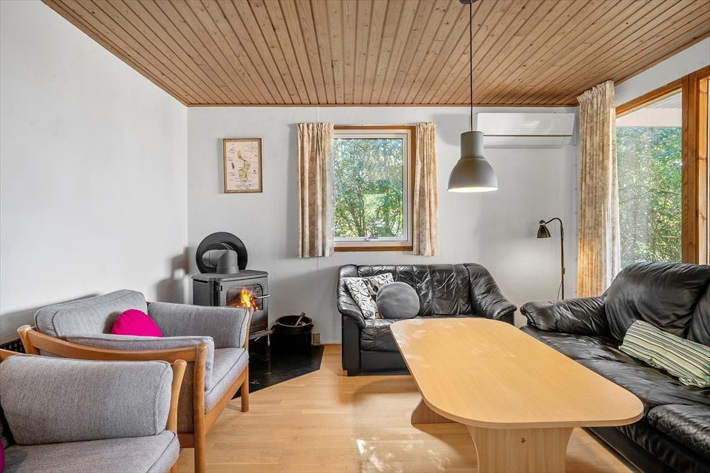 In der Küche befindet sich eine gemütliche Essecke mit einer Bank und Stühlen. In der Küche erwartet Sie angenehm viel Bewegungsfreiheit. Die Küche ist zwar älteren Datums, dafür aber hell und funktionell und verfügt unter anderem über Annehmlichkeiten wie beispielsweise einen Backofen, einen Geschirrspüler und eine Kaffeemaschine. Von der Küche aus gelangen Sie weiter in den offen angrenzenden Wohnraum, in dem Sofas und Lehnstühle zu erholsamen Momenten und gemütlichen Stunden einladen. An kühlen Tagen sorgt der Kaminofen für behagliche Wärme und Stimmung. Der im Wohnraum platzierte Fernseher empfängt eine Auswahl an dänischen Sendern und Viasat-Sendern. Der Wohnraum verwöhnt mit einem Ausgang auf die überdachte Terrasse und mit Aussicht in den großen, grünen Garten. Der Schlafbereich umfasst zwei Zimmer, von denen eins mit einem Doppelbett, einem Fernseher und Schrankfläche versehen ist. Der zweite Raum eignet sich perfekt für Kinder. Er bietet ein Doppelbett, ein direkt darüber angebrachtes Kinderhochbett und Platz zum Spielen. Das ansprechende, helle Badezimmer mit einer Dusche liegt neben den Schlafräumen. Das Ferienhaus wird mit dem Kaminofen im Wohnraum, mit einer Wärmepumpe und mit Elektroheizkörpern beheizt.