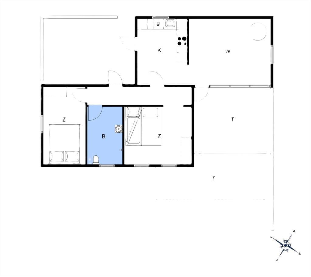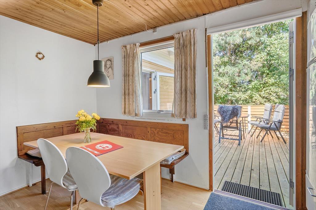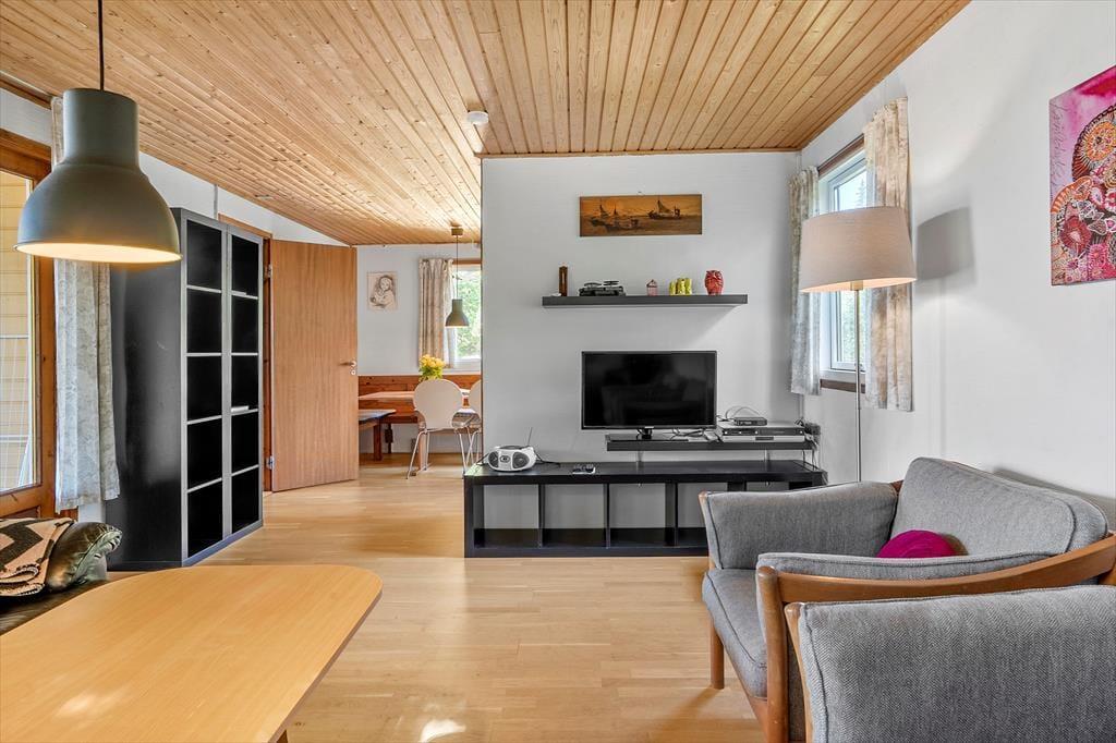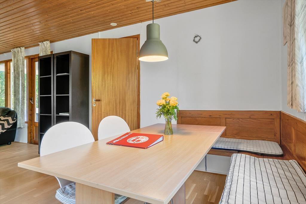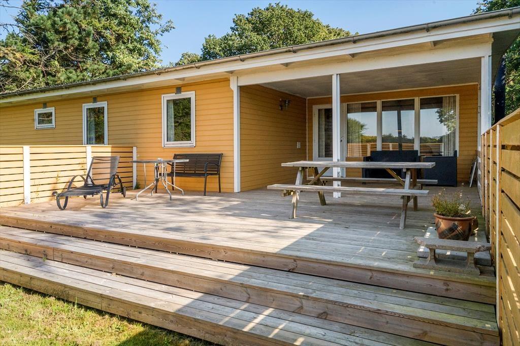 In der Küche befindet sich eine gemütliche Essecke mit einer Bank und Stühlen. In der Küche erwartet Sie angenehm viel Bewegungsfreiheit. Die Küche ist zwar älteren Datums, dafür aber hell und funktionell und verfügt unter anderem über Annehmlichkeiten wie beispielsweise einen Backofen, einen Geschirrspüler und eine Kaffeemaschine. Von der Küche aus gelangen Sie weiter in den offen angrenzenden Wohnraum, in dem Sofas und Lehnstühle zu erholsamen Momenten und gemütlichen Stunden einladen. An kühlen Tagen sorgt der Kaminofen für behagliche Wärme und Stimmung. Der im Wohnraum platzierte Fernseher empfängt eine Auswahl an dänischen Sendern und Viasat-Sendern. Der Wohnraum verwöhnt mit einem Ausgang auf die überdachte Terrasse und mit Aussicht in den großen, grünen Garten. Der Schlafbereich umfasst zwei Zimmer, von denen eins mit einem Doppelbett, einem Fernseher und Schrankfläche versehen ist. Der zweite Raum eignet sich perfekt für Kinder. Er bietet ein Doppelbett, ein direkt darüber angebrachtes Kinderhochbett und Platz zum Spielen. Das ansprechende, helle Badezimmer mit einer Dusche liegt neben den Schlafräumen. Das Ferienhaus wird mit dem Kaminofen im Wohnraum, mit einer Wärmepumpe und mit Elektroheizkörpern beheizt.