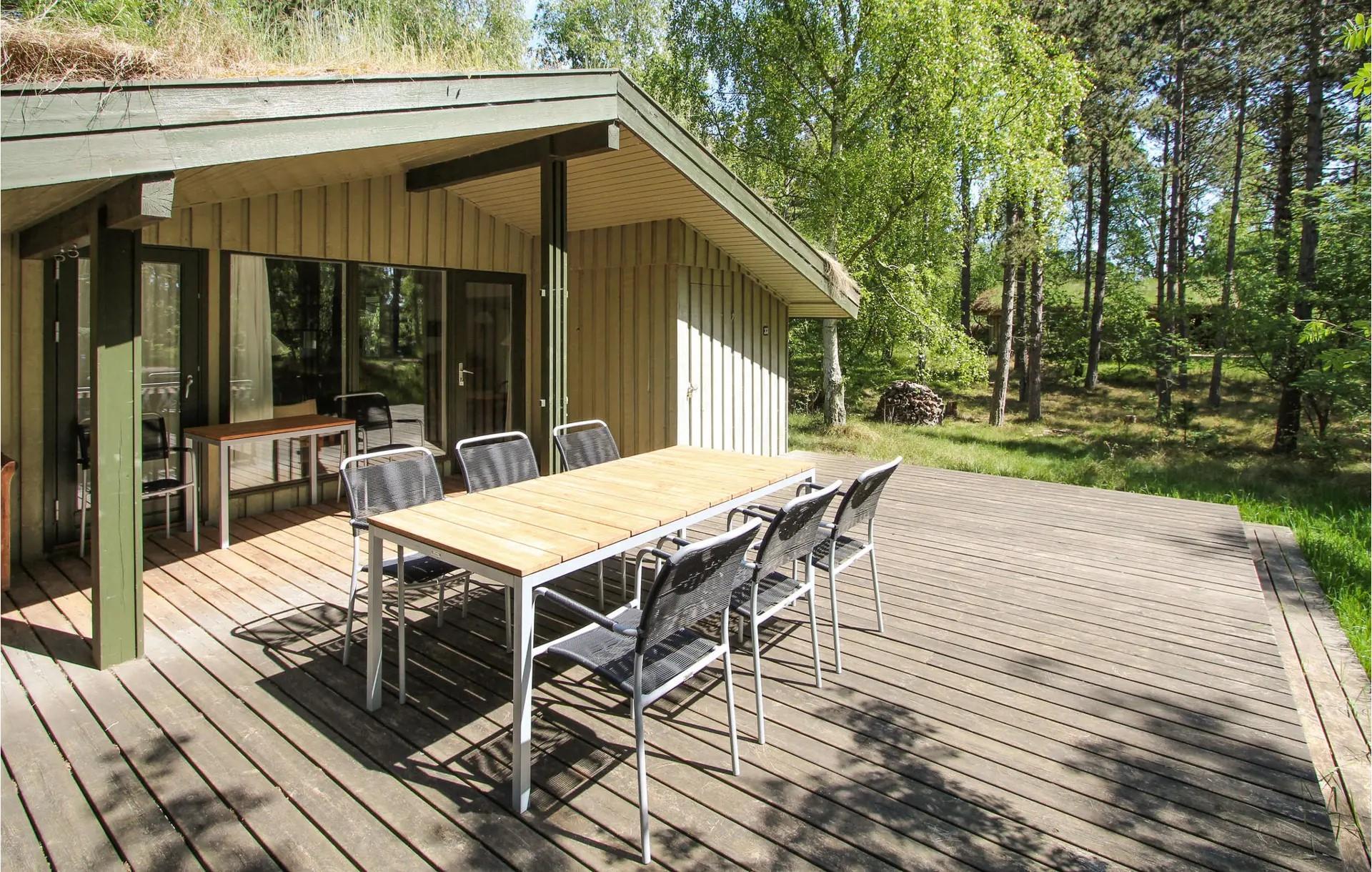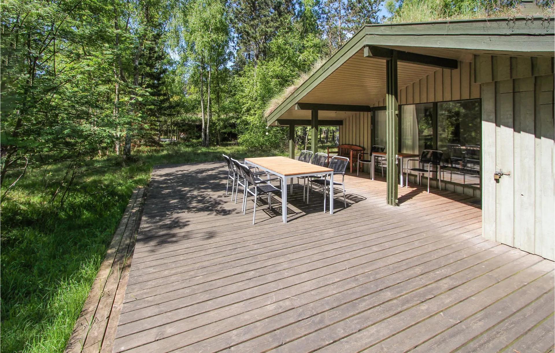 erwartet Sie eine teilweise überdachte Terrasse mit guten Gartenmöbeln, auf der Sie die ruhigen Morgenstunden Ihres Urlaubs mit einer Tasse Kaffee oder lange Sommerabende in der friedlichen Umgebung des Waldes genießen können. Das Grundstück ist naturbelassen mit Heidekraut und hohem Gras, und der Wald liegt ganz in der Nähe – perfekt zum Spielen, Spazierengehen und für kleine Abenteuer. Da das Gebiet unter Naturschutz steht, ist es nicht erlaubt, am Haus zu grillen, aber Sie können ganz einfach einen Einweggrill mit an den Strand nehmen und Essen und Meerblick kombinieren.