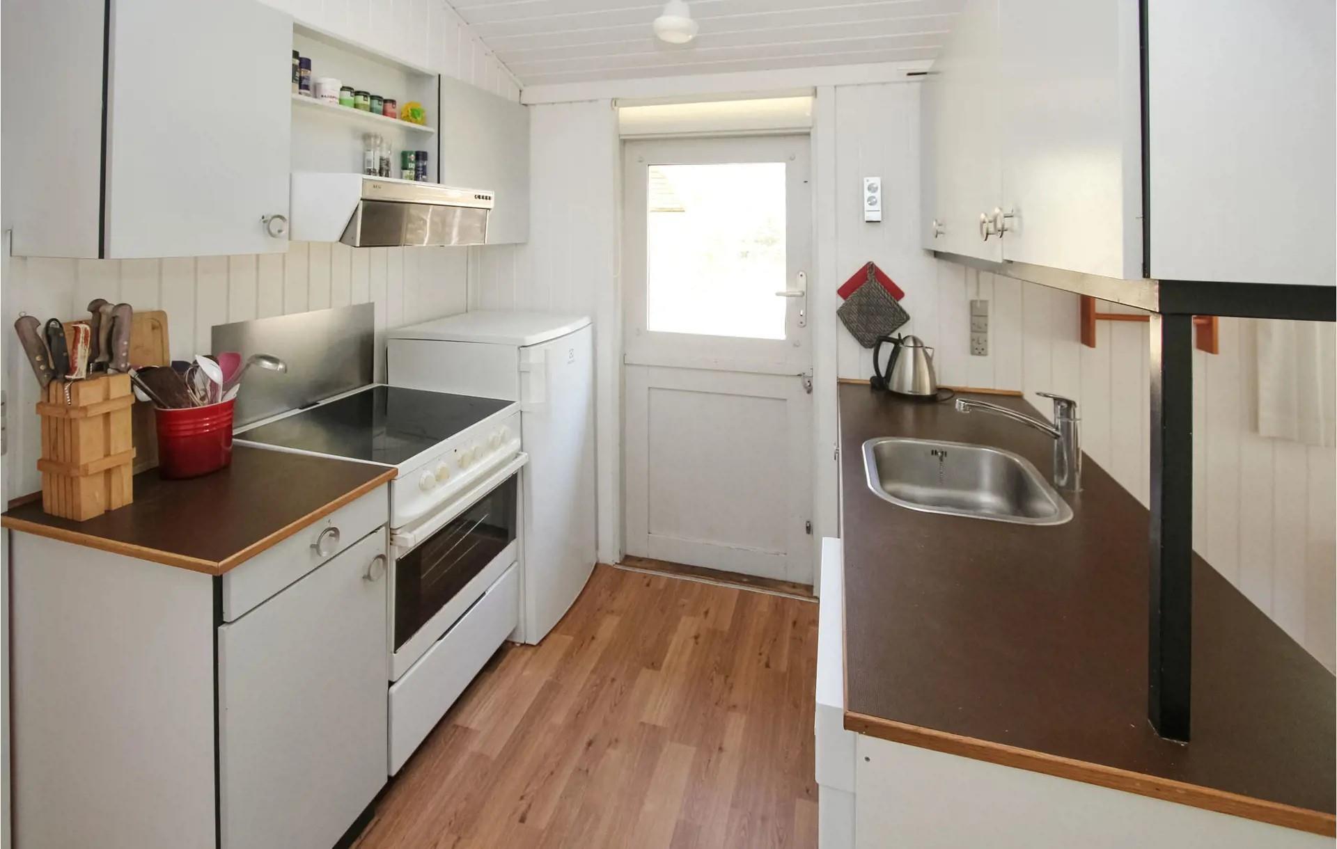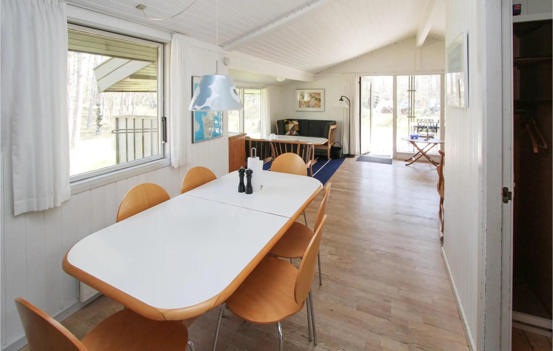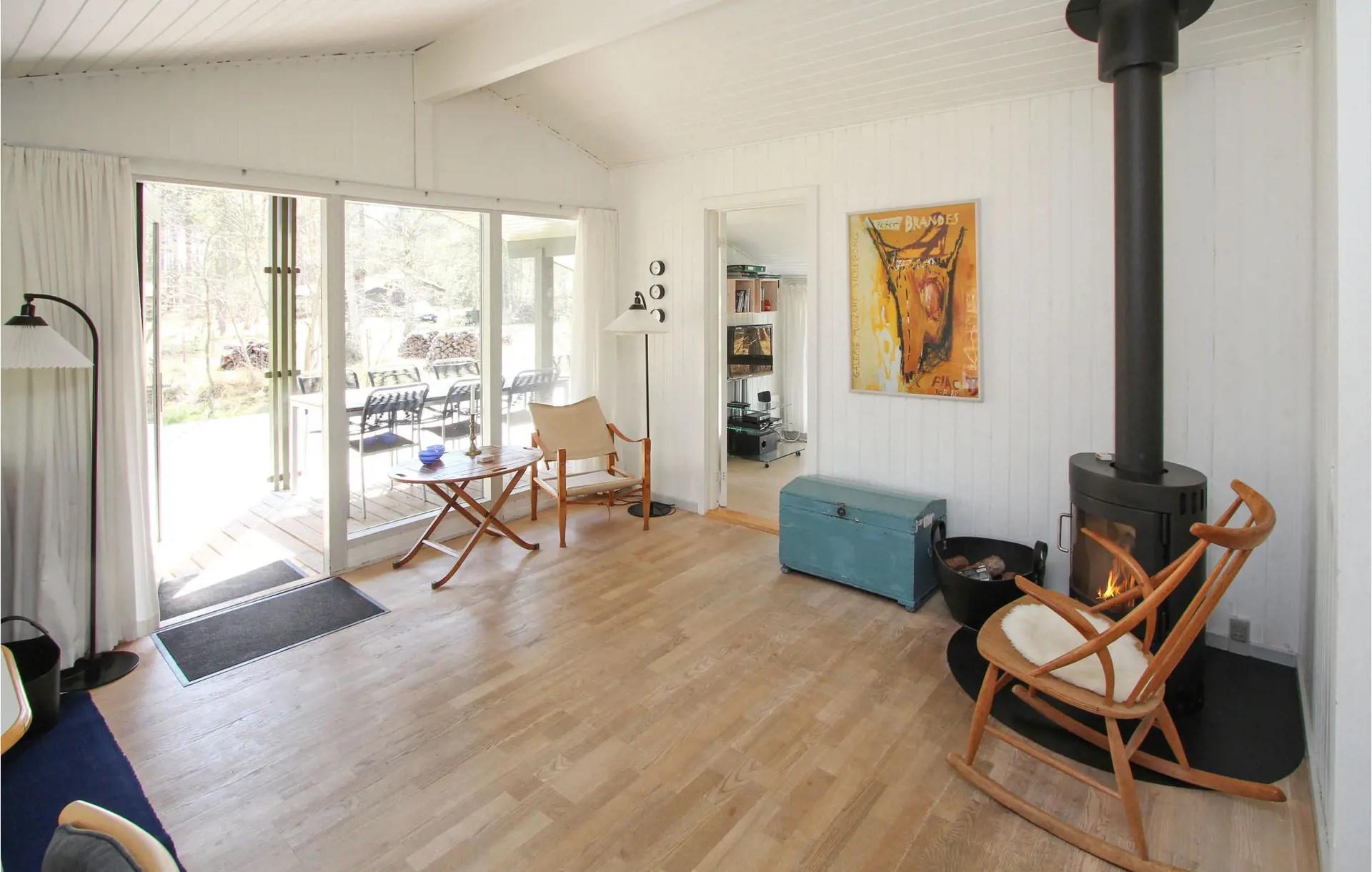empfängt Sie eine warme und klassische Atmosphäre mit Holzwänden, Holzdecken und natürlichem Lichteinfall durch die großen Fensterfronten. Das Haus verfügt über einen gemütlichen Wohnbereich mit bequemen Möbeln, einem Holzofen und einem Chromecast-Fernseher, sodass Sie sich vor dem Kaminfeuer entspannen oder Ihre Lieblingssendungen streamen können. Die Küche ist praktisch und zum Essbereich hin offen, sodass Sie Ihre Urlaubsmahlzeiten zubereiten und trotzdem am Tisch mitreden können.