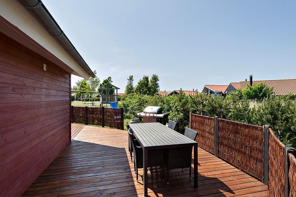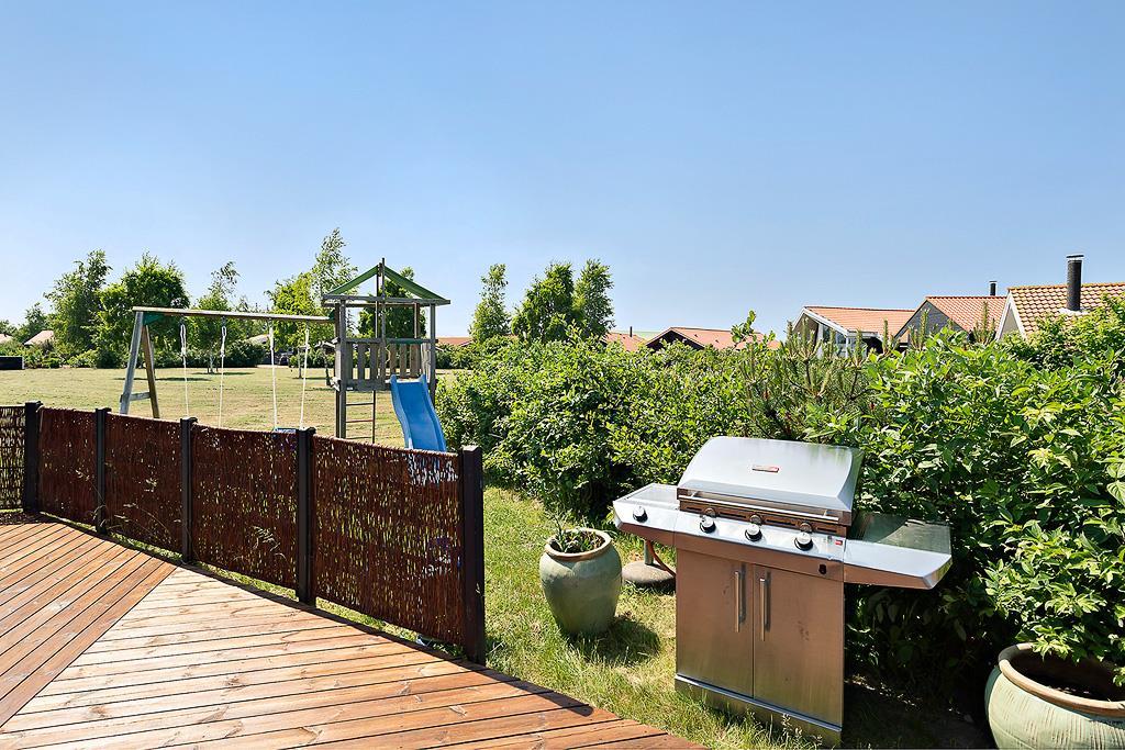 Schöne Holzterrasse mit Grill und Gartenmöbeln sowie ein schöner Garten mit vielen Aktivitäten für die Kinder und viel Platz für Ballspiele.