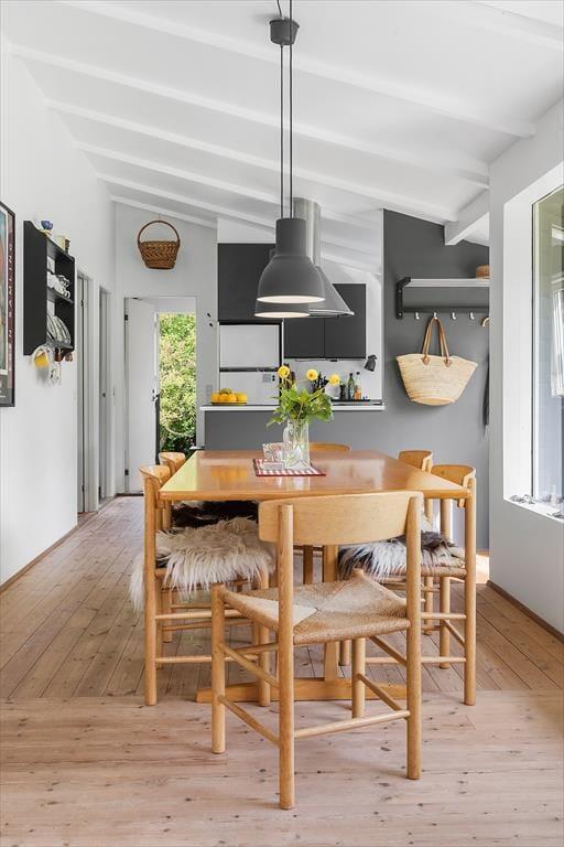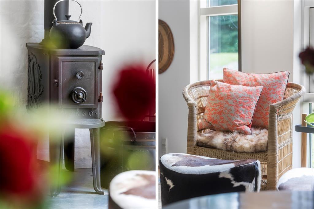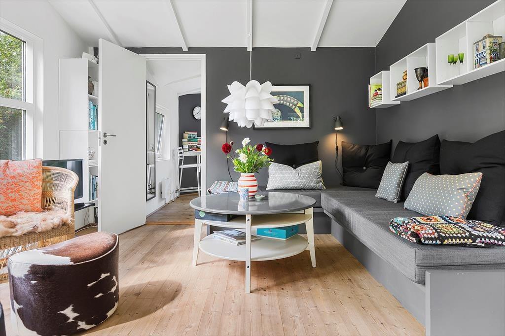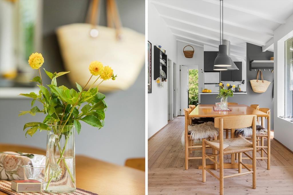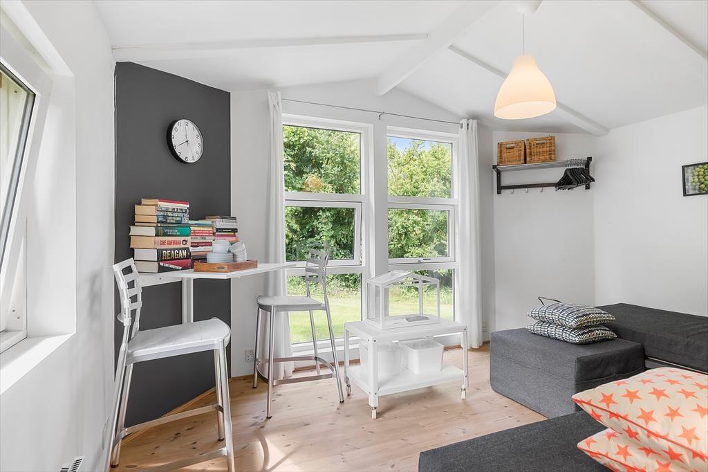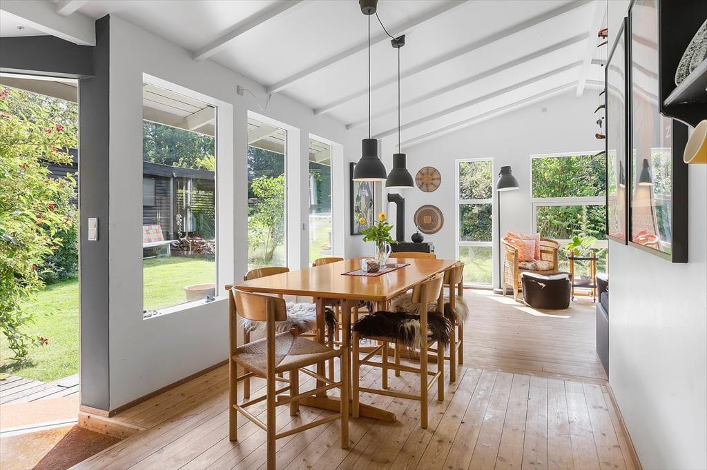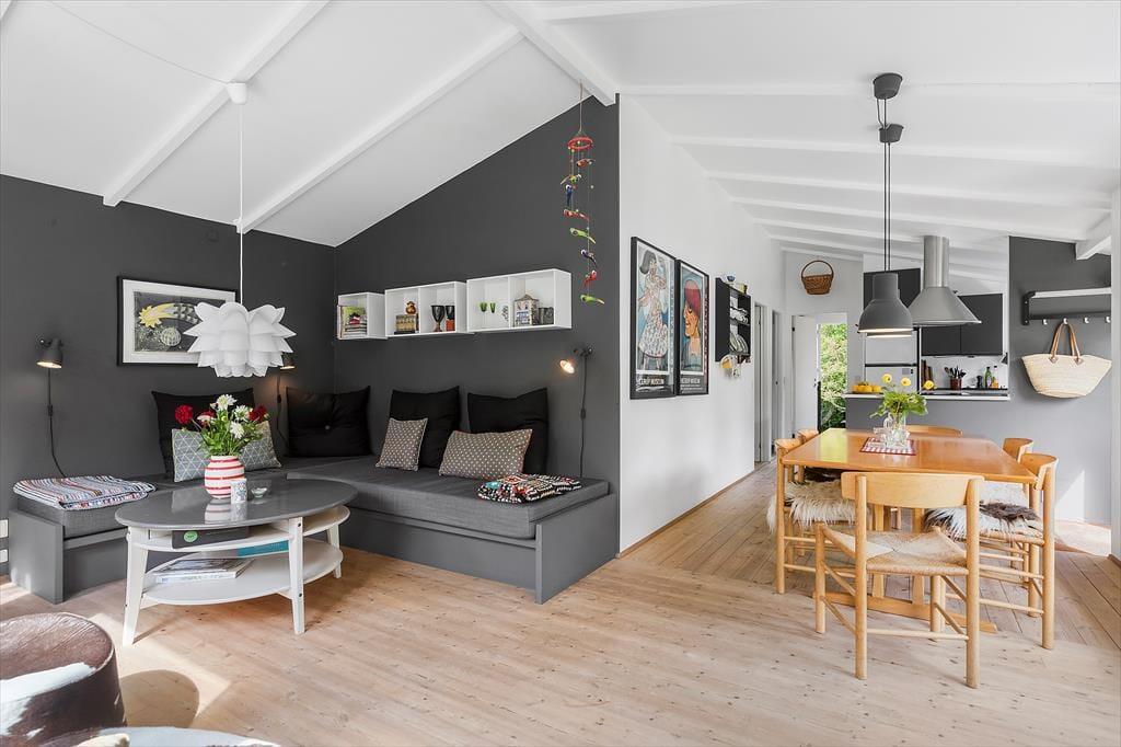 Dieses wunderschöne Ferienhaus in Munkerup bietet eine helle und einladende Atmosphäre, in der Offenheit und Gemütlichkeit perfekt harmonieren. Der großzügige Wohnbereich verbindet Wohnzimmer, Essbereich und Küche zu einem offenen Raum, der sich ideal für gemeinsame Stunden mit Familie und Freunden eignet. Die großen Fenster lassen viel Tageslicht herein und bieten einen wunderschönen Blick auf den hügeligen Garten.