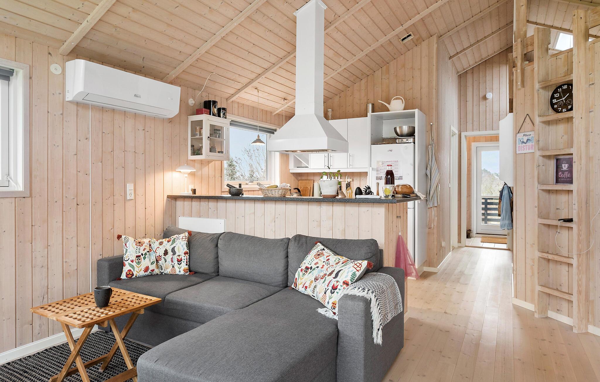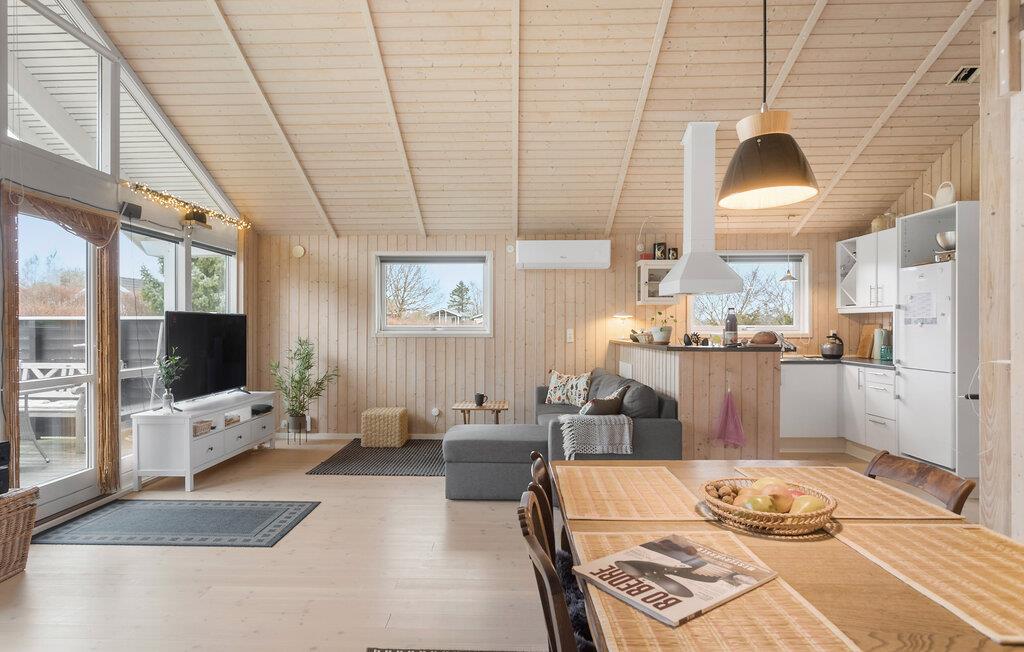 Verbringen Sie mit Ihrer Familie einen ruhigen Urlaub und kommen in diesem gut ausgestatteten Ferienhaus voll auf Ihre Kosten. Schon beim Betreten strahlt Ihnen die einladende und warme Wohnatmosphäre entgegen, denn die helle Holzverkleidung, der offene Grundriss des Wohnraumes sowie die große Fensterfront schaffen ein stimmiges Bild. Kosten Sie den Charme eines knisternden Kaminfeuers und unterhaltsamen Filmabenden auf dem Sofa aus oder verweilen in den Sommermonaten auf der Holzterrasse. Sichern Sie sich eine Sonnenliegen, während Ihre Kinder im Garten umhertoben und lassen die Abende bei gegrillten Speisen in geselliger Runde ausklingen.