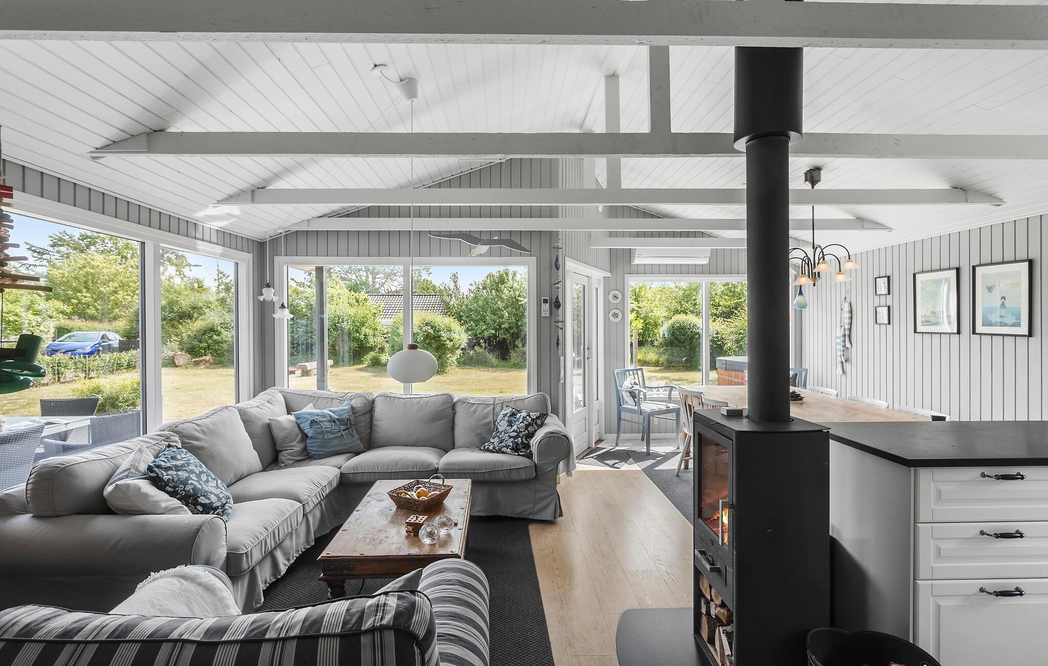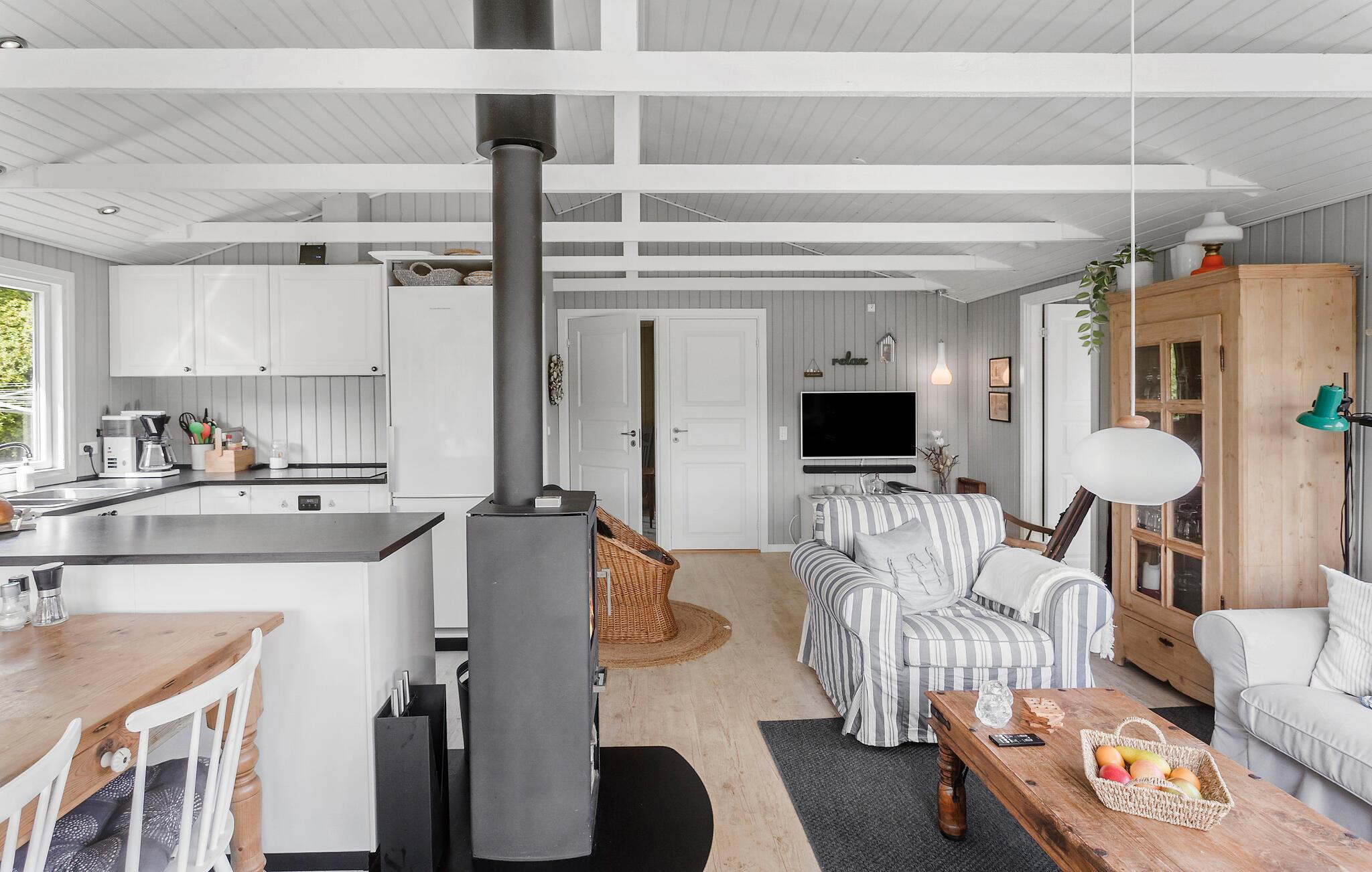 Schönes Ferienhaus am Næsby Strand auf Lolland mit moderner Küche, Kaminofen und großer Terrasse.