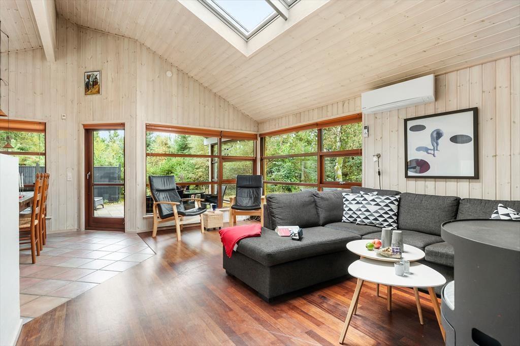 Beim Betreten des Ferienhauses spürst du sofort die helle und leichte Atmosphäre, die hilft, die Schultern zu senken und den Alltagsstress hinter dir zu lassen. Große Fensterpartien holen die Natur ins Wohnzimmer und sorgen den ganzen Tag über für angenehmes Tageslicht, während der offene Grundriss für eine gute Verbindung zwischen Wohnbereich und Küche sorgt. In der Mitte des Raumes steht der Kaminofen bereit, um Wärme und Gemütlichkeit zu verbreiten – ideal für ruhige Stunden mit Kartenspielen oder Gesprächen bei einem Glas Wein. Wenn der Abend hereinbricht und der Körper sich nach etwas Verwöhnung sehnt, kannst du in den hauseigenen Whirlpool und die Sauna gehen – und dich danach in einem der drei gemütlichen Schlafzimmer entspannen, die der ganzen Familie Ruhe und Komfort bieten.