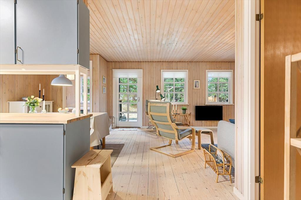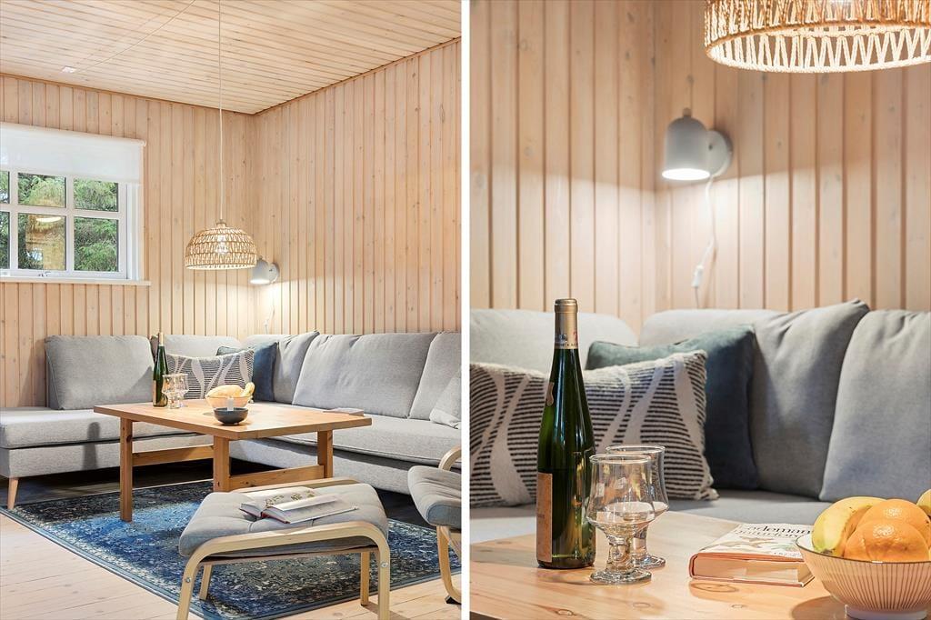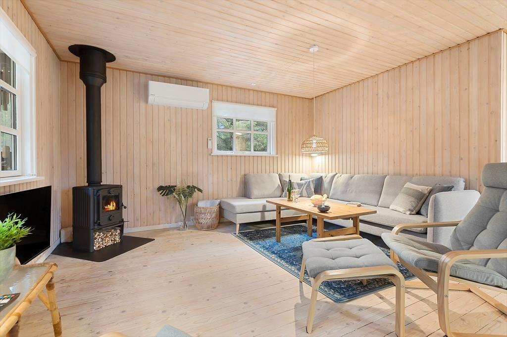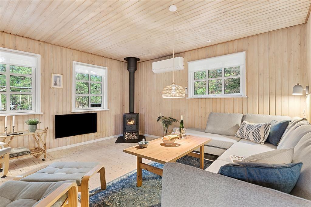 Treten Sie ein in ein Ferienhaus, in dem das Licht durch die Fenster strömt und eine einladende und freundliche Atmosphäre schafft. Der nordische Einrichtungsstil prägt die Räume, in denen helle Holzarten und schlichte, elegante Möbel dafür sorgen, dass Sie sich sofort wie zu Hause fühlen. Das Wohnzimmer und die Küche sind offen miteinander verbunden, sodass Sie kochen können, während die Familie Karten spielt oder einen guten Film in der Sofaecke genießt. Das Ferienhaus ist ideal für Entspannung und geselliges Beisammensein – sei es mit einem Buch und Blick in den Garten oder beim gemeinsamen Abendessen nach einem Tag am Strand.