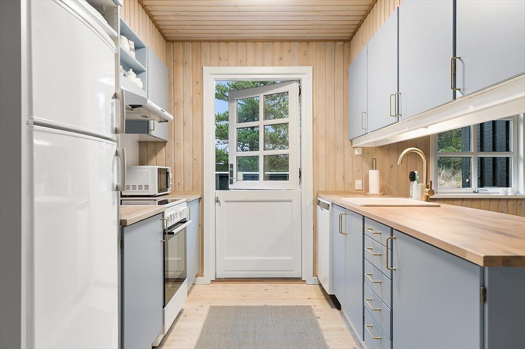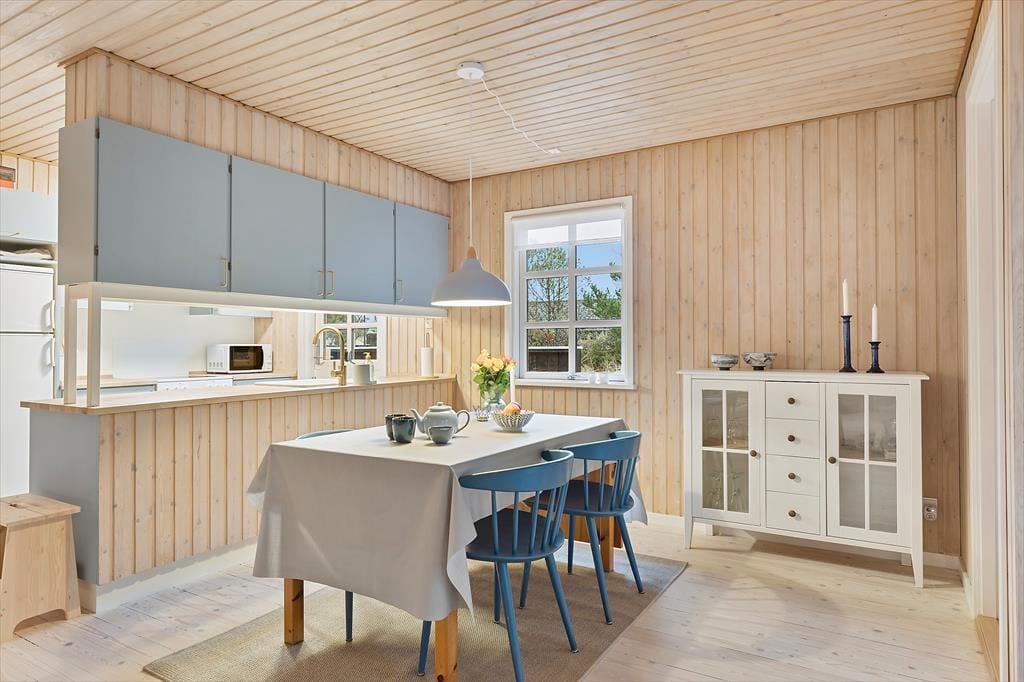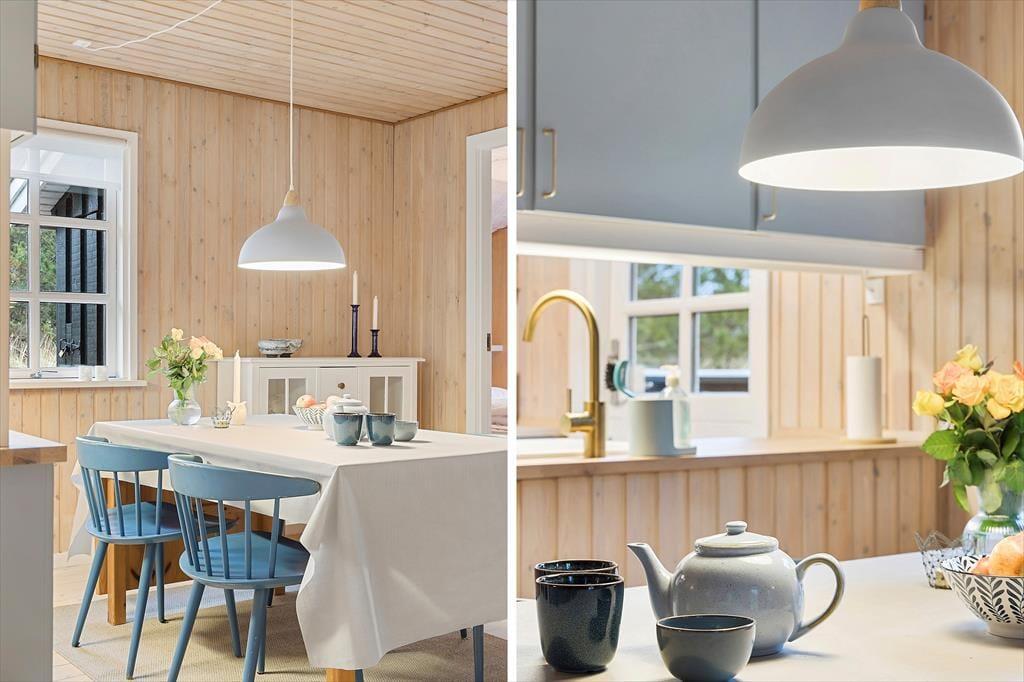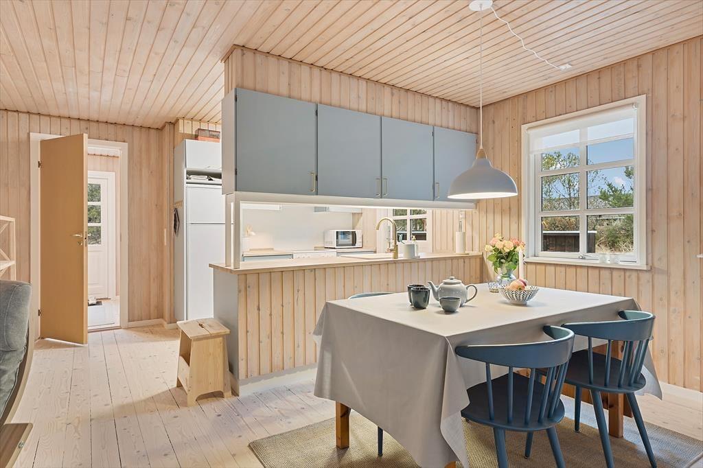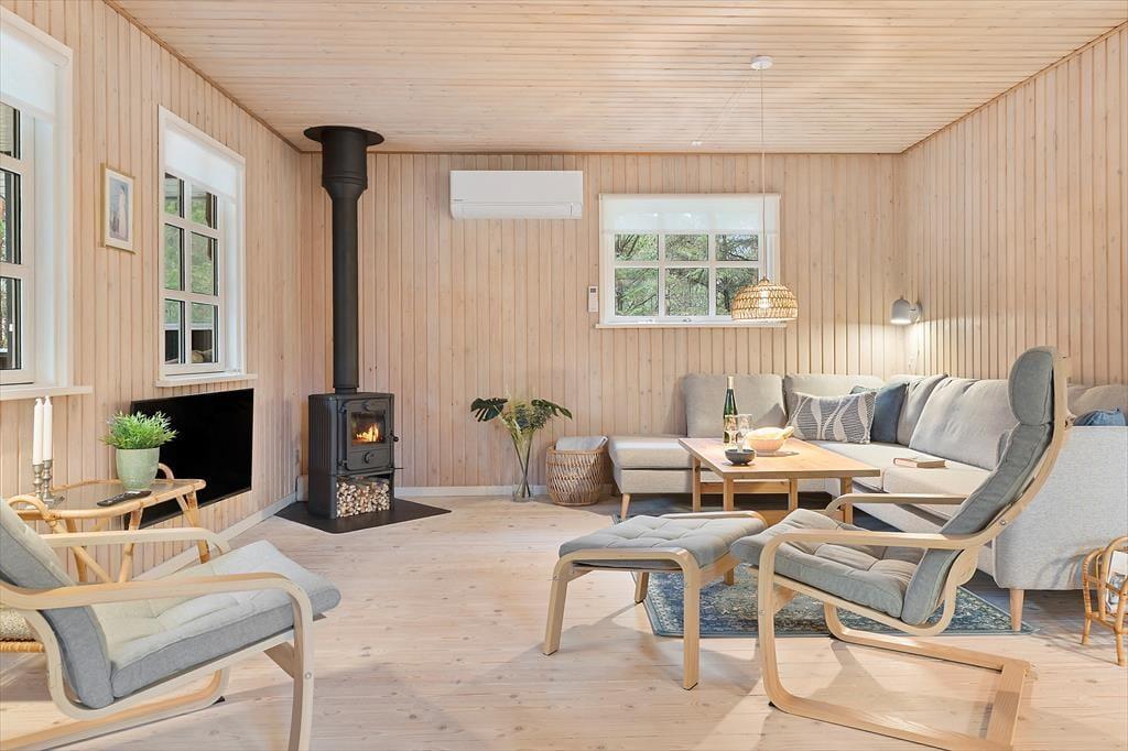 Treten Sie ein in ein Ferienhaus, in dem das Licht durch die Fenster strömt und eine einladende und freundliche Atmosphäre schafft. Der nordische Einrichtungsstil prägt die Räume, in denen helle Holzarten und schlichte, elegante Möbel dafür sorgen, dass Sie sich sofort wie zu Hause fühlen. Das Wohnzimmer und die Küche sind offen miteinander verbunden, sodass Sie kochen können, während die Familie Karten spielt oder einen guten Film in der Sofaecke genießt. Das Ferienhaus ist ideal für Entspannung und geselliges Beisammensein – sei es mit einem Buch und Blick in den Garten oder beim gemeinsamen Abendessen nach einem Tag am Strand.