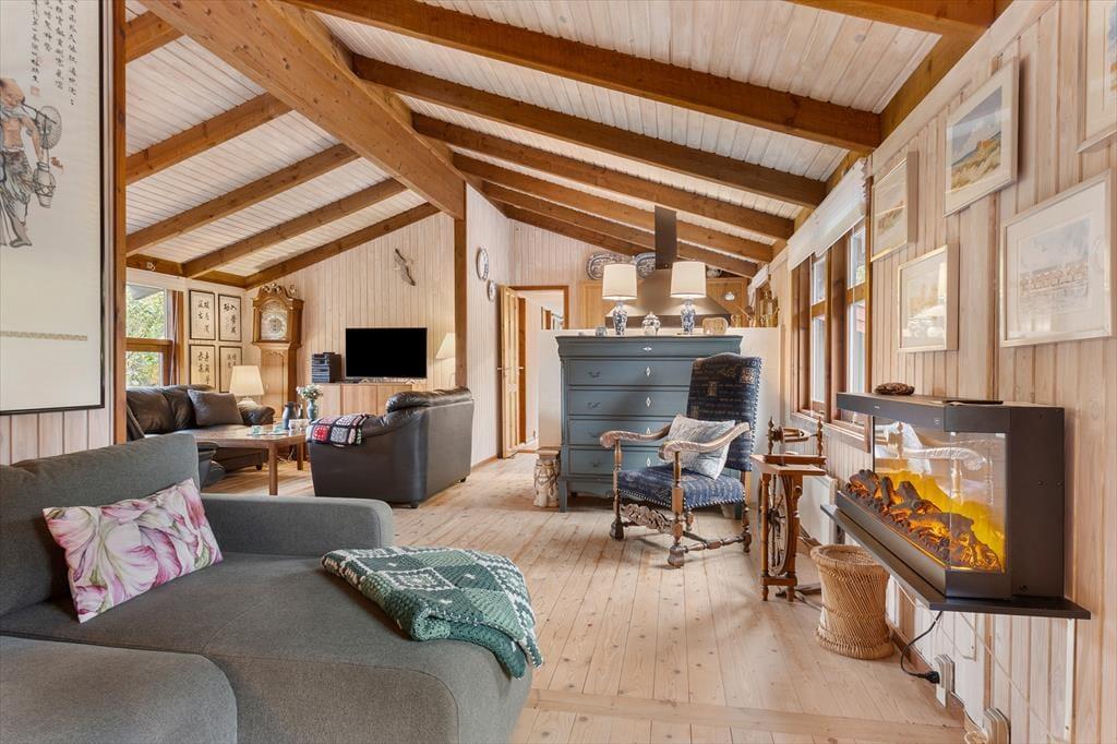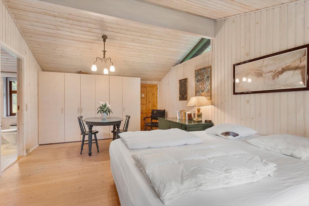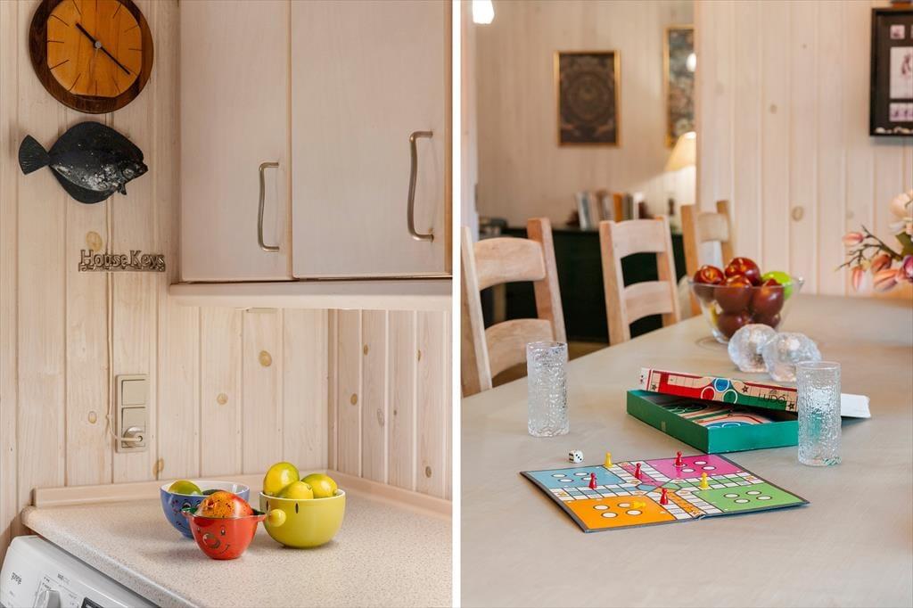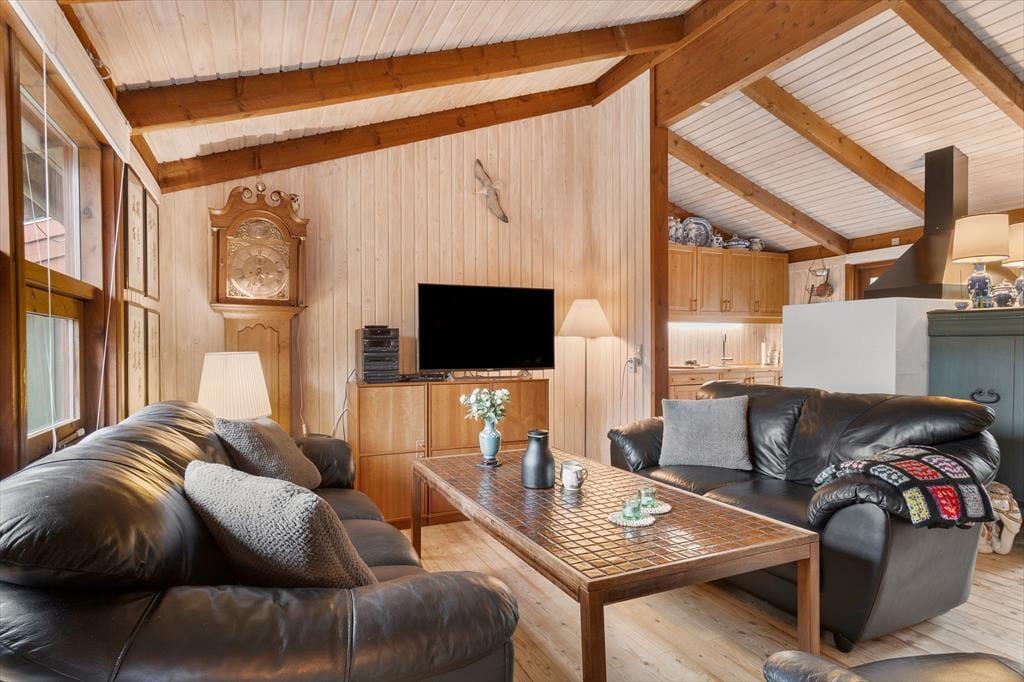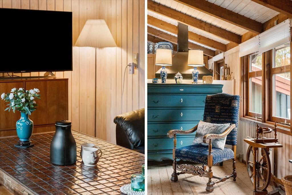 Das Ferienhaus empfängt Sie mit einer hellen und einladenden Atmosphäre, in der Gemütlichkeit und Komfort perfekt harmonieren. Die offene Küche ist direkt mit dem Wohnraum verbunden, sodass Sie beim Kochen und Essen immer miteinander plaudern können. Am Esstisch lassen sich gesellige Mahlzeiten genießen, und später lädt das Sofa vor dem Elektrokamin zu entspannten Filmabenden ein. In der Leseecke im Wohnzimmer können Sie mit einer Tasse Kaffee und einem guten Buch den Tag ausklingen lassen. Das Haus verfügt über drei schöne Schlafzimmer und zwei geräumige Badezimmer – ideal für Familien oder befreundete Paare. Zusätzlich gibt es ein großes Annex mit eigenem Bad, Teeküche, Doppelbett und gemütlichem Wohnbereich – perfekt für Teenager, Großeltern oder Gäste, die etwas mehr Privatsphäre wünschen.
