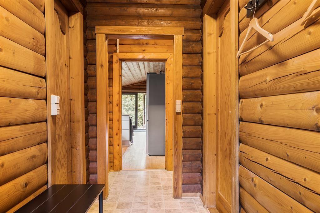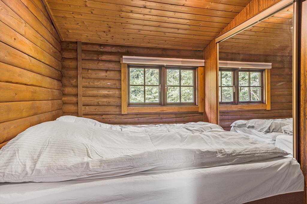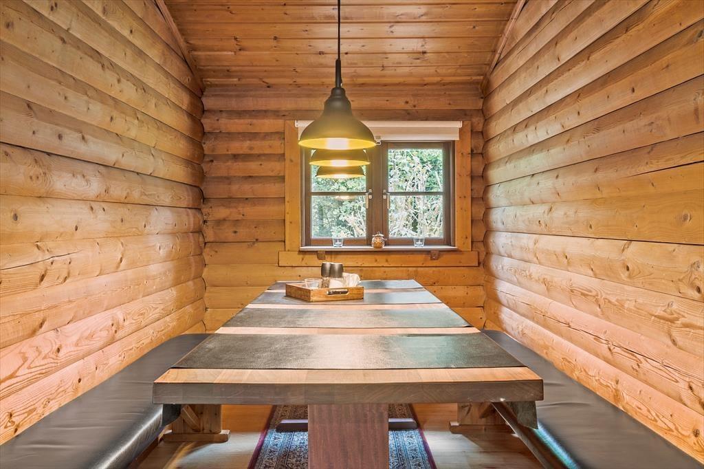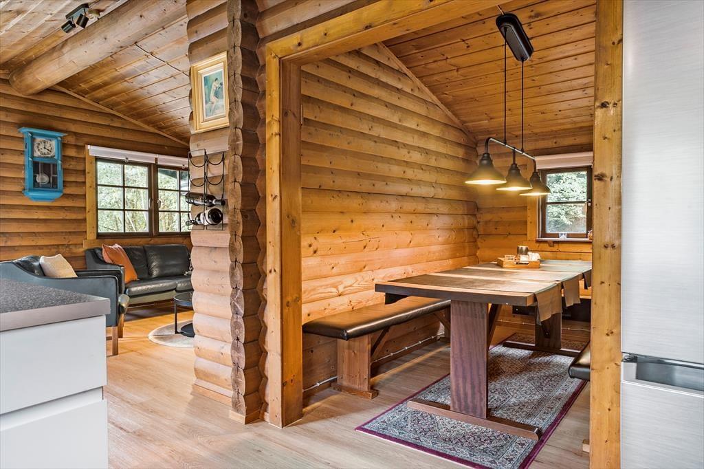 Hier ist nicht nur die Naturumgebung idyllisch – auch das Ferienhaus selbst bezaubert mit seiner dunklen Blockfassade und dem grünen Dach, als ob es fast vollständig mit der Landschaft verschmolzen wäre. Im Inneren erwarten dich rustikale Holzwände, eine offene Balkendecke und ein gemütliches Interieur, inklusive eines Kaminofens, der eine Lesepause mit einem guten Buch zu einem besonders stimmungsvollen Erlebnis macht. Die moderne Küche ist offen mit dem Wohnzimmer verbunden, und in einer Nische befindet sich der Esstisch, an dem du und deine Liebsten gemeinsam eine köstliche Mahlzeit genießen könnt. Ein Badezimmer mit Dusche liegt direkt am Eingang, und es gibt zwei gemütliche Schlafzimmer, die sich perfekt für vier Personen eignen.