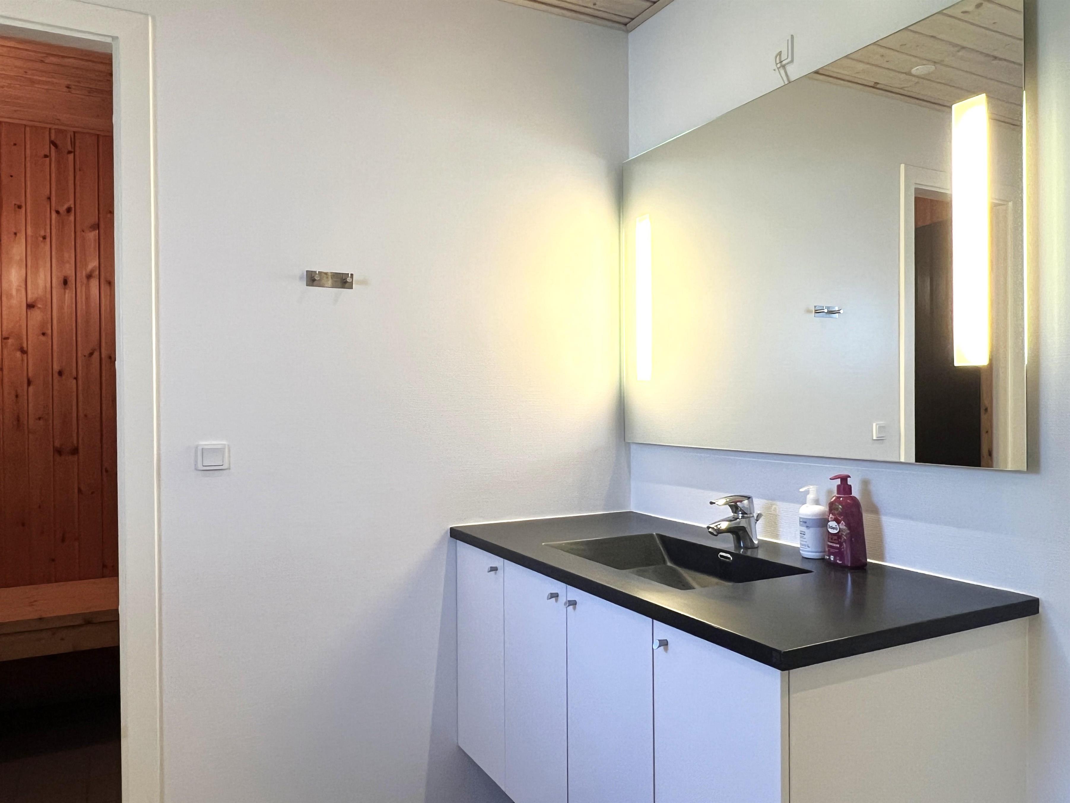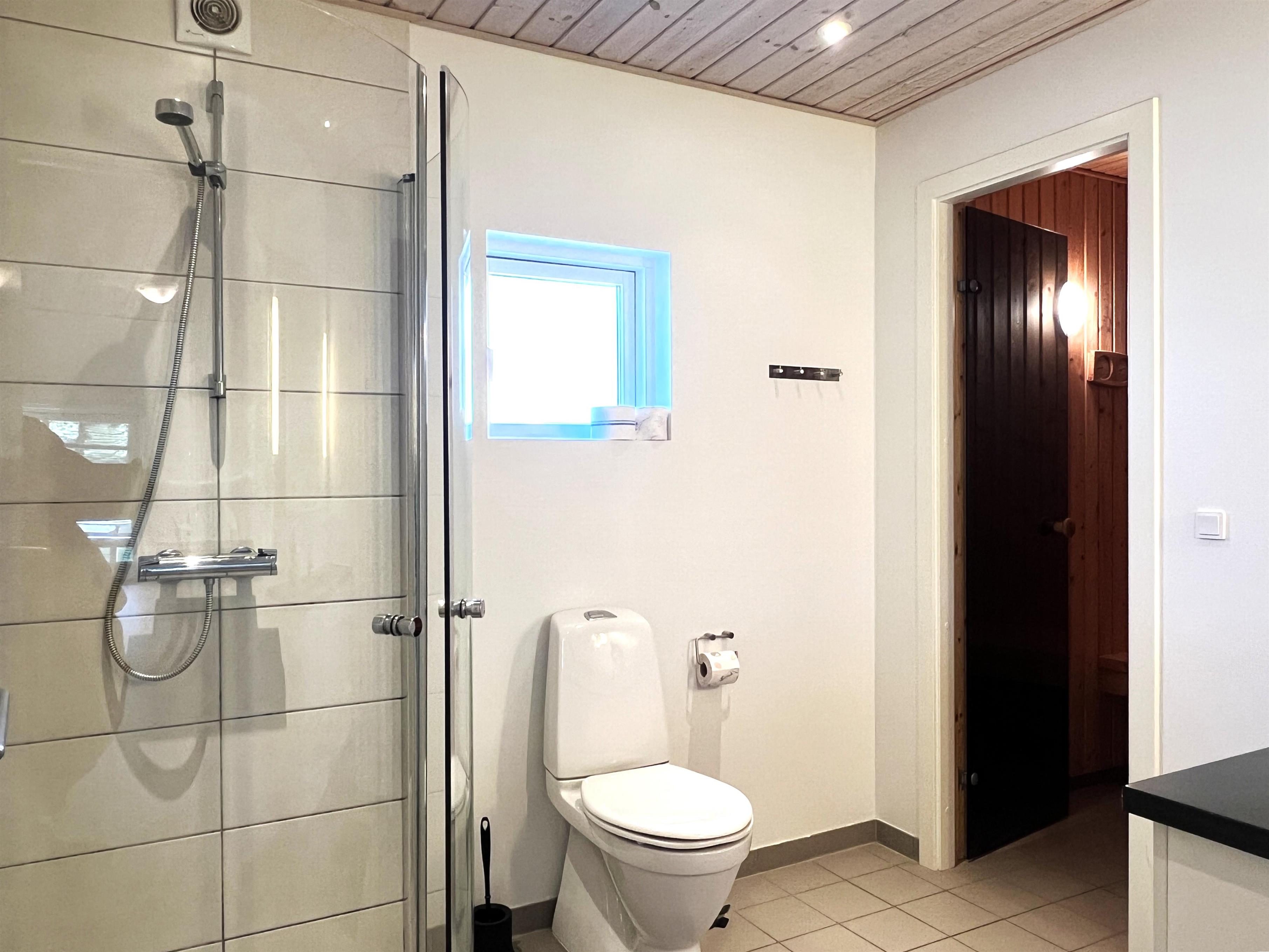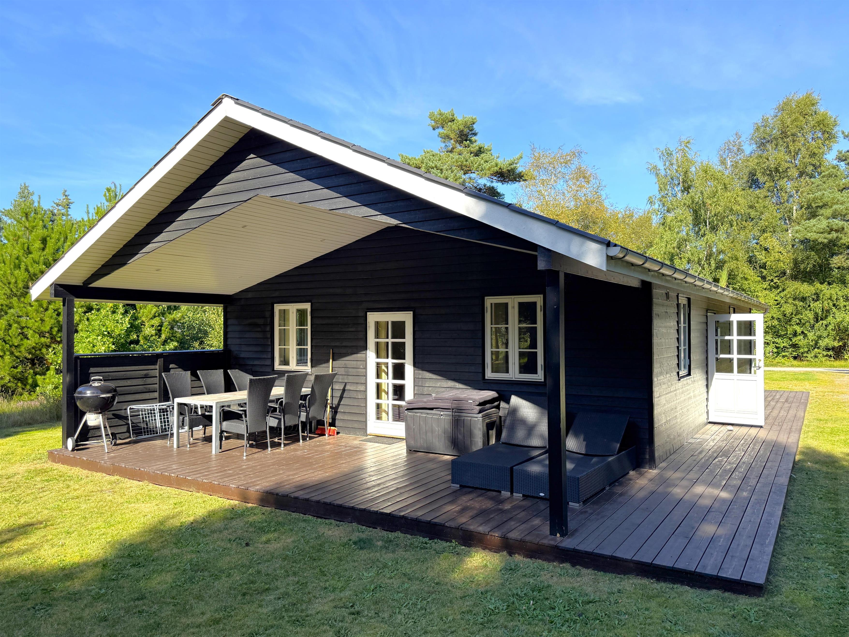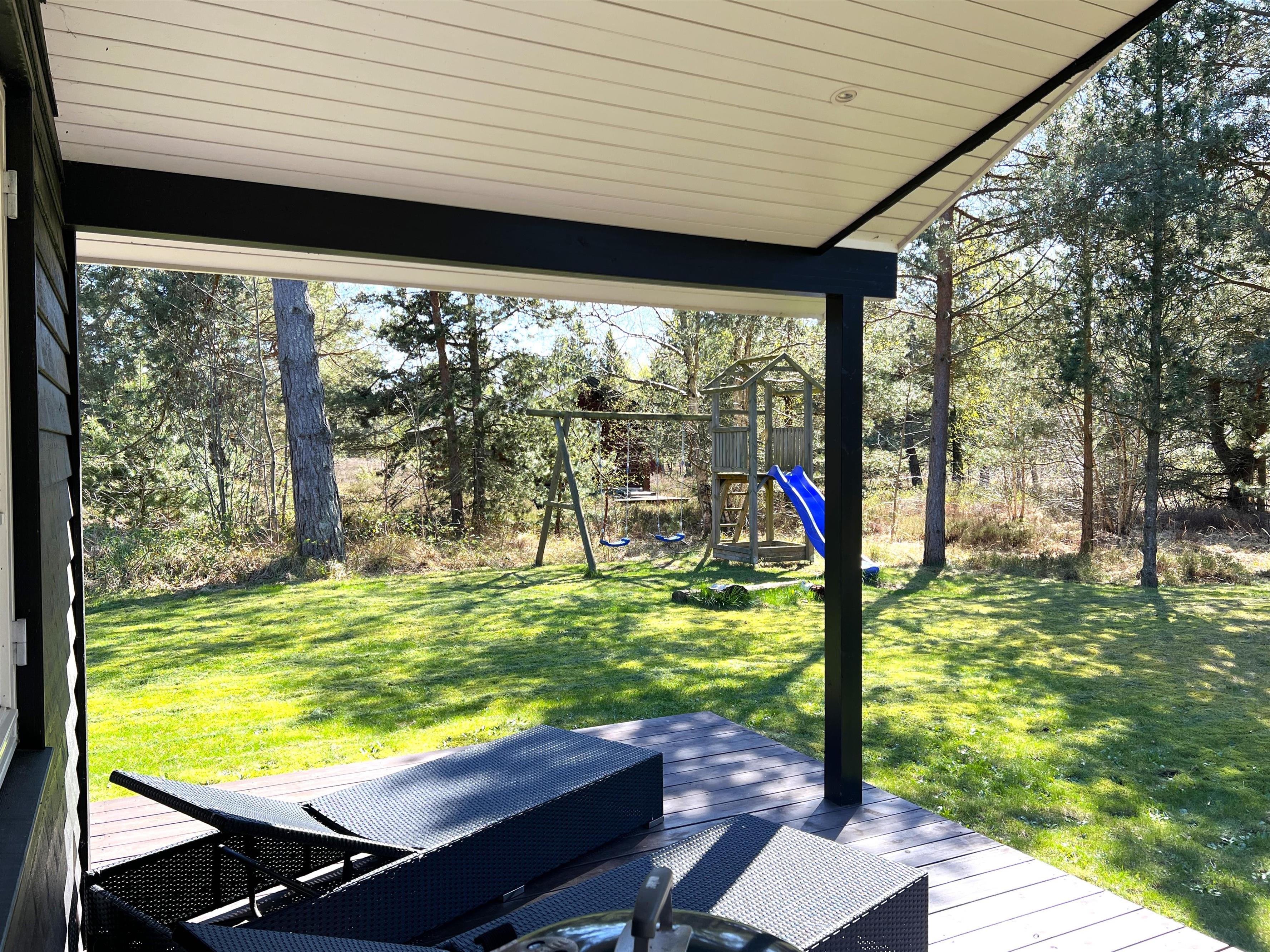 Das große Ferienhaus wirkt hell und großzügig und bietet viel Platz für die Familie. Das Haus verfügt über eine große Wohnküche mit schöner Küche, Essbereich und Wohnzimmer mit TV. Es gibt drei gute Schlafzimmer mit bequemen Doppelbetten in zwei der Zimmer und zwei Einzelbetten im dritten. In allen Zimmern gibt es sehr viel Stauraum. Schönes Badezimmer mit Dusche und Sauna. Vom Wohnzimmer aus gelangt man auf die schöne, überdachte Holzterrasse mit Gartenmöbeln und Sonnenliegen, hier kann auch der hauseigene Grill genutzt werden. Hier finden Sie zahlreiche Sonnenliegen und die Terrasse ist in die wunderschöne Natur ausgerichtet, sodass Sie die Ruhe und Natur spüren können – nicht zuletzt an schönen Sommerabenden. Für die Kinder gibt es auch einen kleinen Spielplatz.
