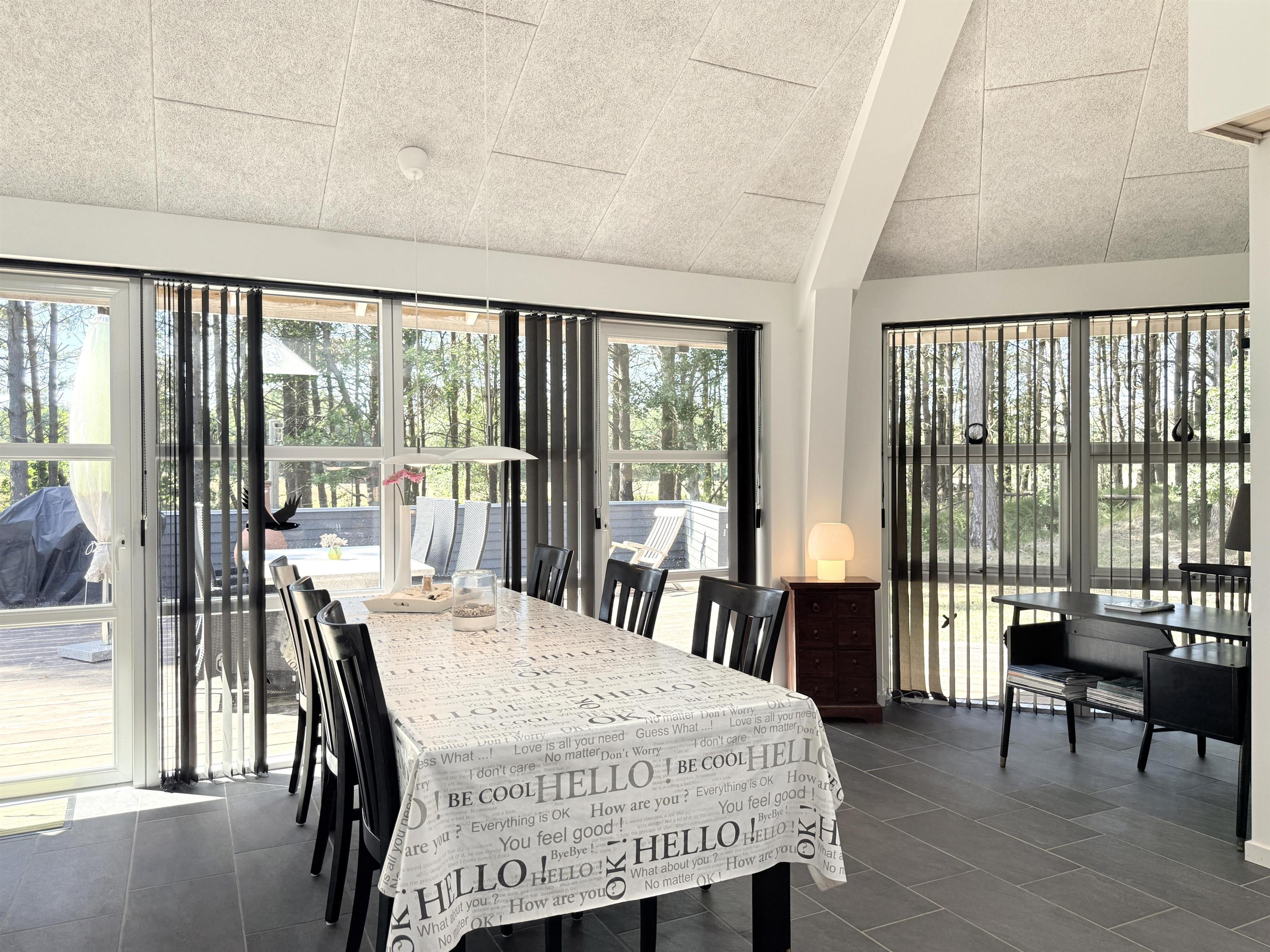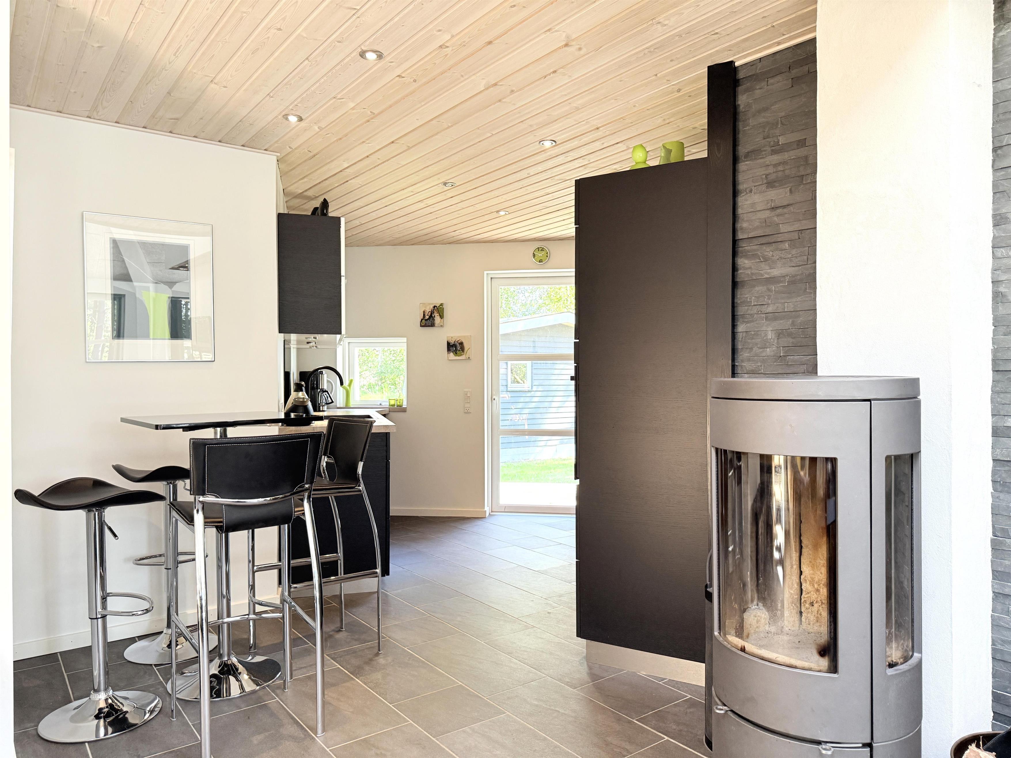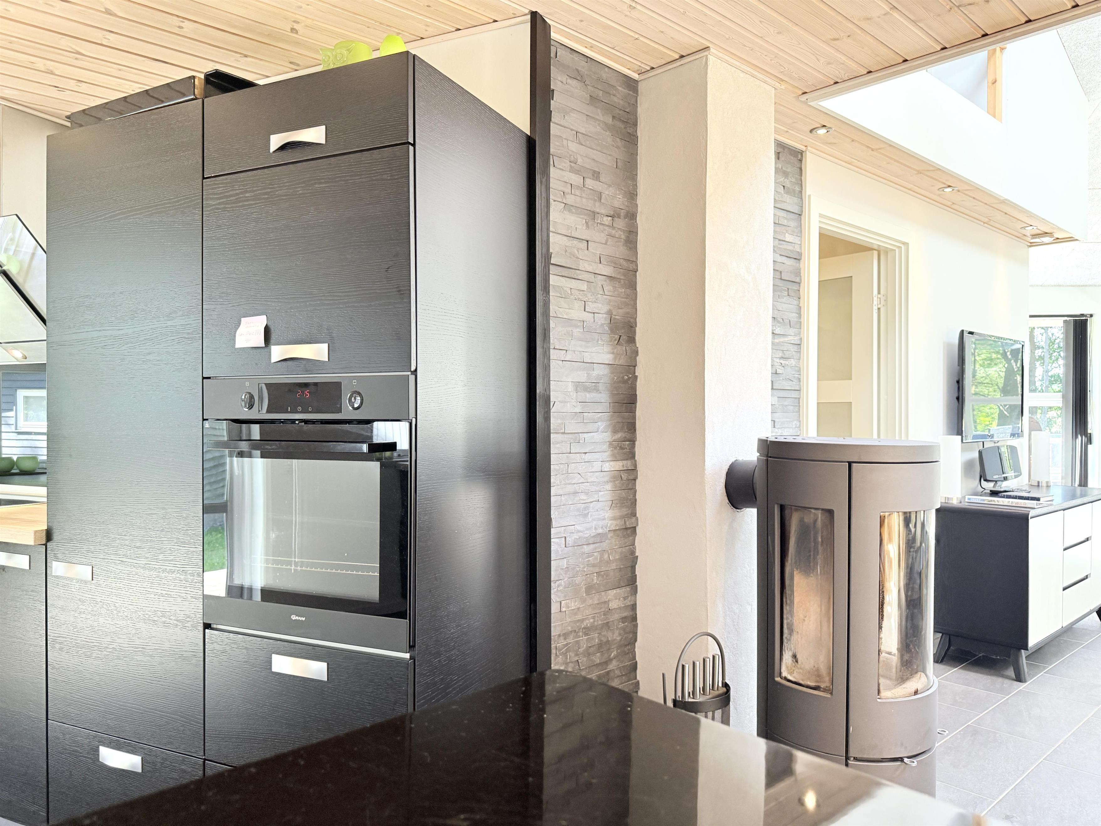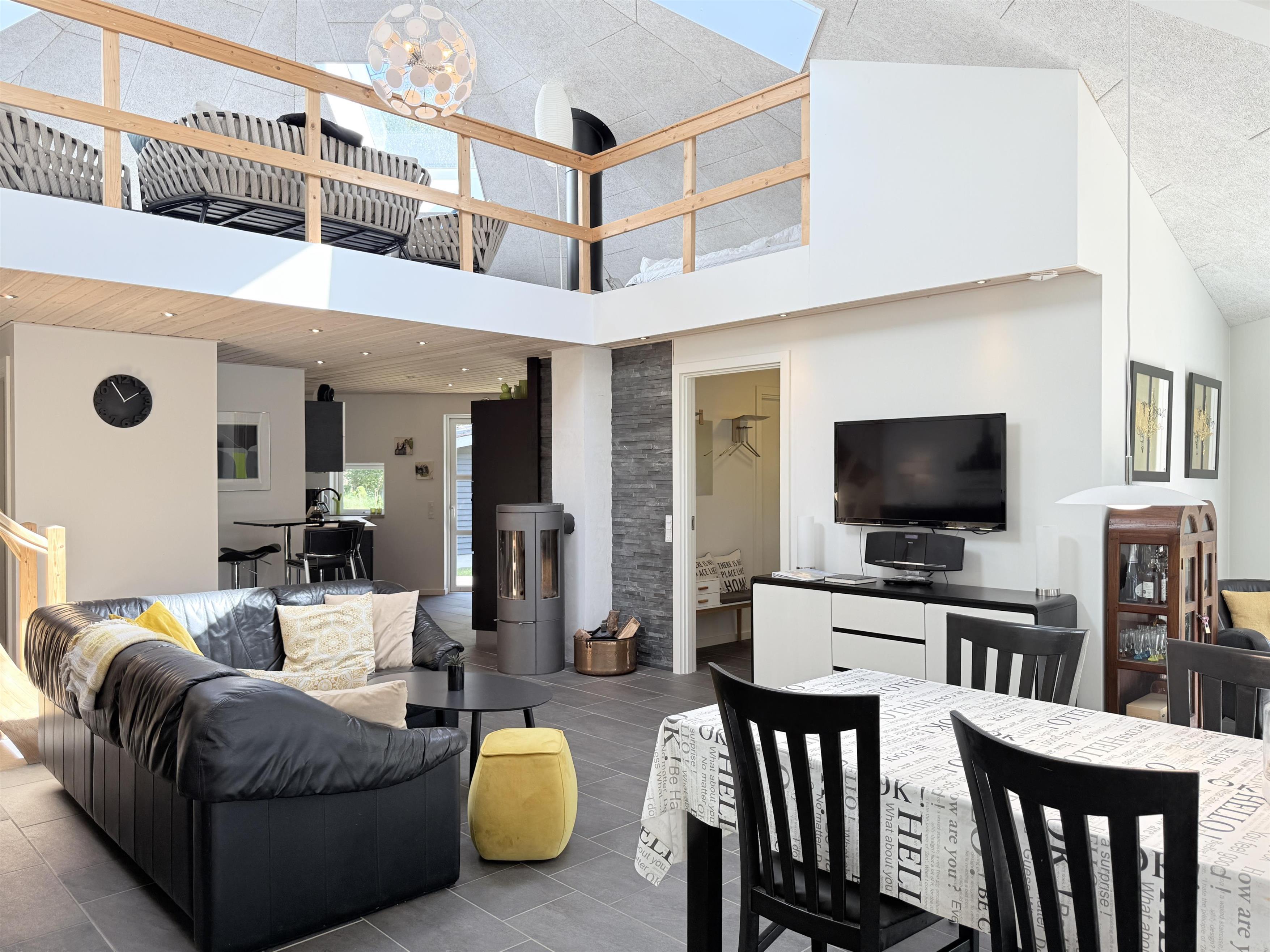 NEU bei Team Læsø. Dieses schöne, von einem Architekten entworfene Ferienhaus liegt ideal inmitten der herrlichen Natur Nordmarkens und vermittelt die perfekte Ferienhausatmosphäre. Das Haus wirkt sehr einladend, hell und geräumig mit vielen liebevollen Details. Die großen Fenster sorgen für viel Licht und einen herrlichen Blick auf die Natur und den Wald. Die schöne Küche ist offen mit dem beeindruckenden Wohnzimmer verbunden. Dieses bietet einen großen Essbereich, eine Sofagruppe, einen Arbeitsbereich und mehrere gemütliche Ecken, die zum Lesen oder einer guten Tasse Kaffee einladen. Ein Holzofen ist ebenfalls vorhanden. Über dem Wohnzimmer befindet sich der erste Stock mit einer weiteren gemütlichen Sofagruppe mit Fernseher und zwei zusätzlichen Schlafplätzen. Außerdem gibt es drei schöne Schlafzimmer, zwei davon mit Doppelbetten und eines mit einem Etagenbett. Es gibt zwei schöne Badezimmer, eines mit einem großen, schönen Doppel-Whirlpool, Dusche, WC und Waschbecken, das andere mit Dusche, WC und Waschbecken. Vom Wohnzimmer aus führen Terrassentüren auf die große, schöne Holzterrasse, wo die Gartenmöbel, der Grill und der Pizzaofen des Hauses genutzt werden können. Schöner Anbau mit Doppelbett und Küchenzeile, der beispielsweise genutzt werden kann, wenn Sie sich für eine Weile von der Gesellschaft zurückziehen müssen. Es gibt auch viele gute Wanderwege in der Umgebung und es ist nicht weit zum Strand und zum Meer. Die komfortable Einrichtung und die Lage des Hauses sorgen für einen schönen, erholsamen Urlaub, bei dem Sie sofort die typische Ruhe und die einzigartige Natur von Læsø spüren. Gleichzeitig liegt das Haus wunderschön und ruhig in Radnähe zum Golfplatz von Læsø sowie zum gemütlichen Hafen von Østerby mit Fischhändlern, Einkaufsmöglichkeiten und Restaurants.