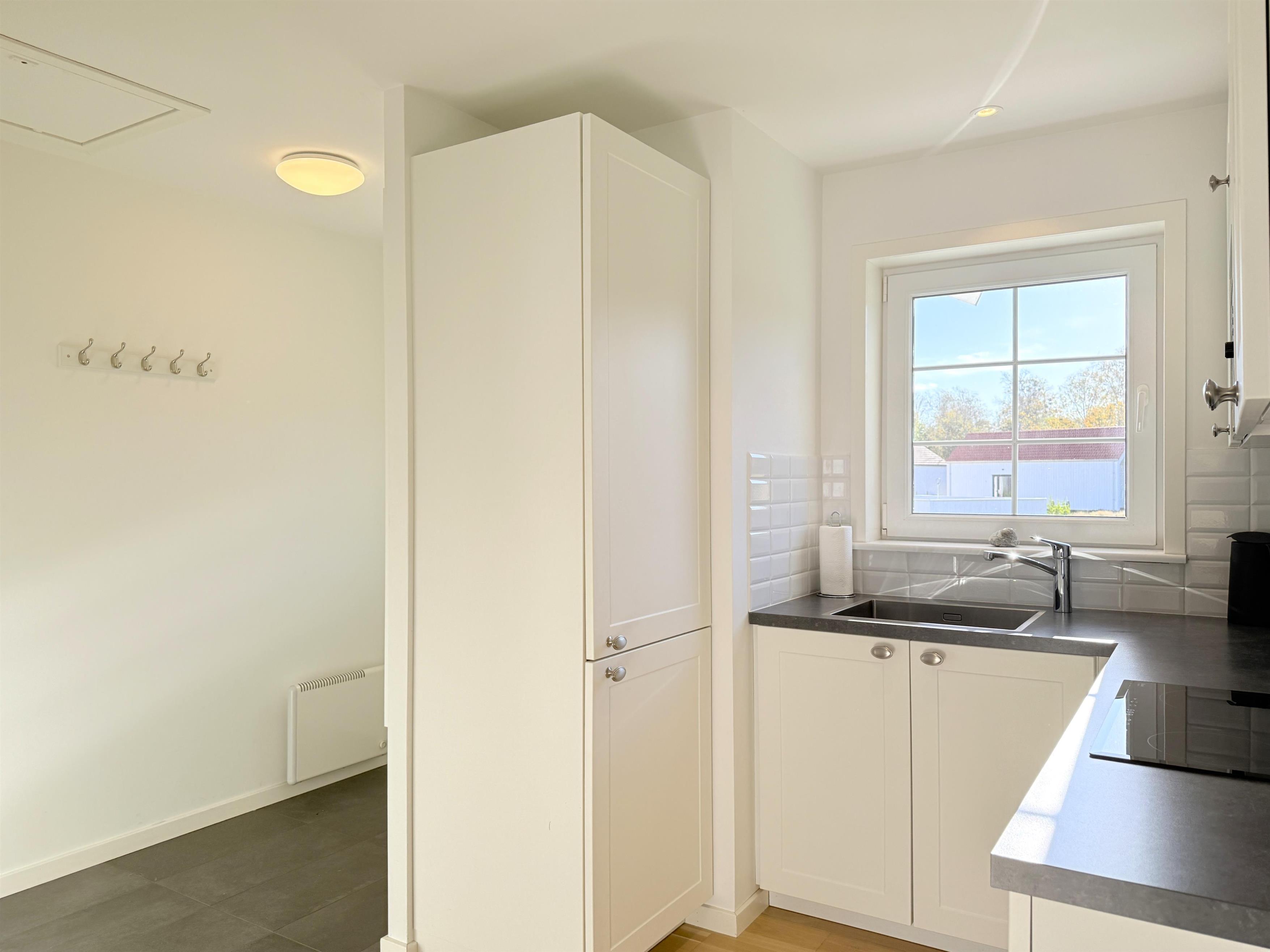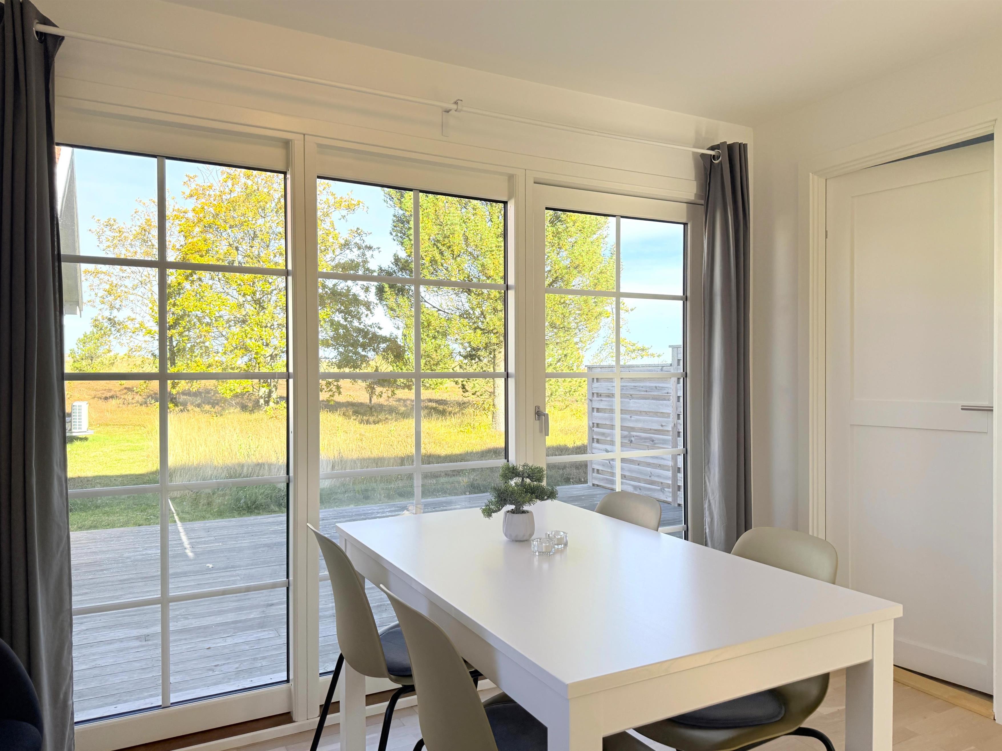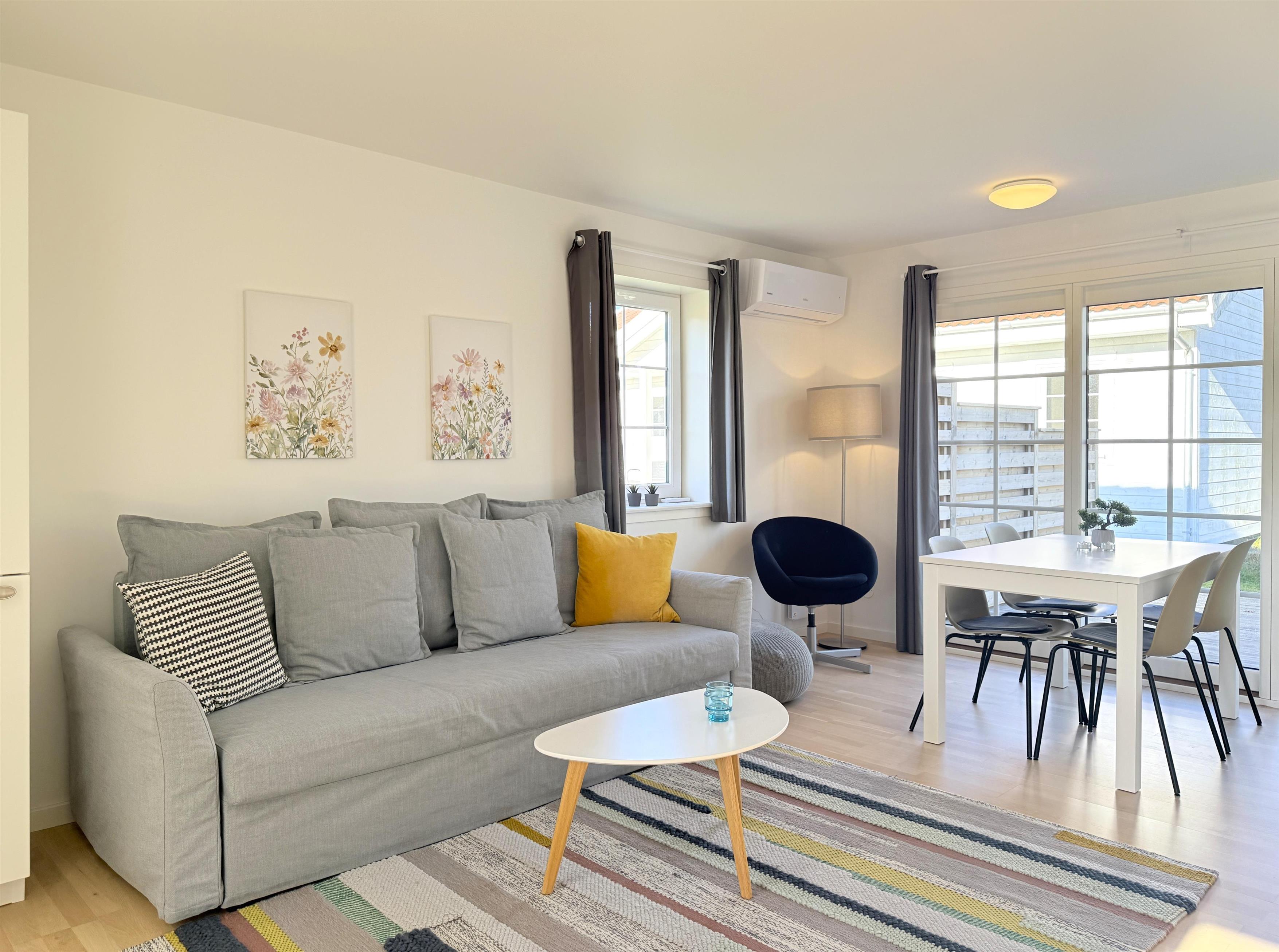 Schönes, neu renoviertes Golfhaus in herrlicher Lage in Nordmarken. Das Haus ist ein Doppelhaus und Teil des Ferienhausdorfs am Læsø Seaside Golfplatz. Das Haus hat einen überdachten Eingang mit kleiner Terrasse, eine schöne Eingangshalle und ein Badezimmer mit Dusche. Schöne Küche, gemütliches Wohnzimmer mit Esstisch und Sofa und Fernseher mit Chromecast. Es gibt ein großes Fenster mit schöner Aussicht und Zugang zur Terrasse. Von der Terrasse aus hat man einen Blick auf das Golfhotel und die Stranddünen. Das Haus hat 2 Zimmer – eines mit 2 Einzelbetten und eines mit einem 120-Bett. Das Haus ist für 4 Personen geeignet und es besteht die Möglichkeit, das Schlafsofa im Wohnzimmer zu nutzen. Das Haus ist mit einer Luft-Luft-Wärmepumpe und Glasfaser-Internet ausgestattet. Es sind nur ca. 100 Meter bis zu einer Ladestation für Elektroautos.