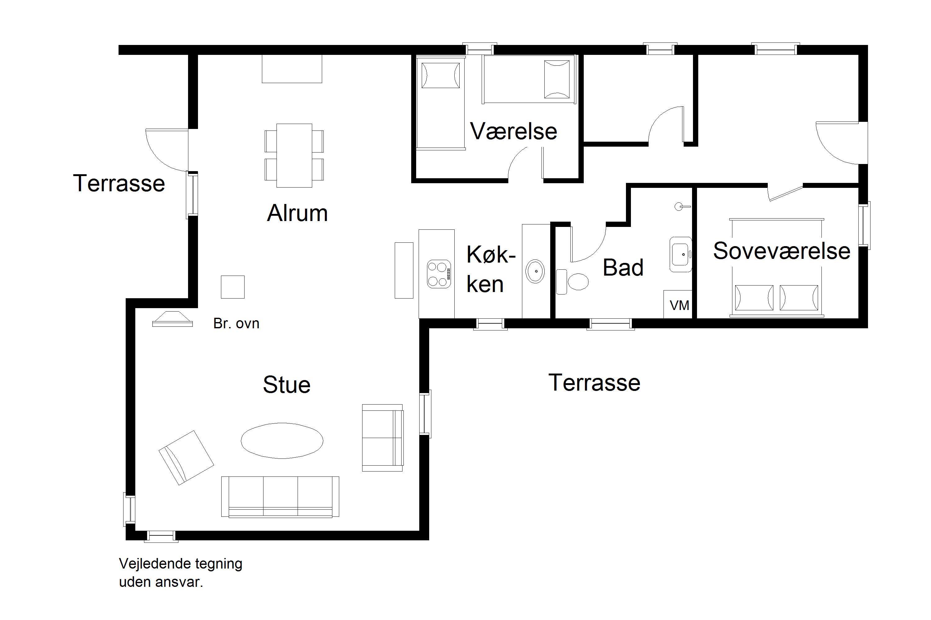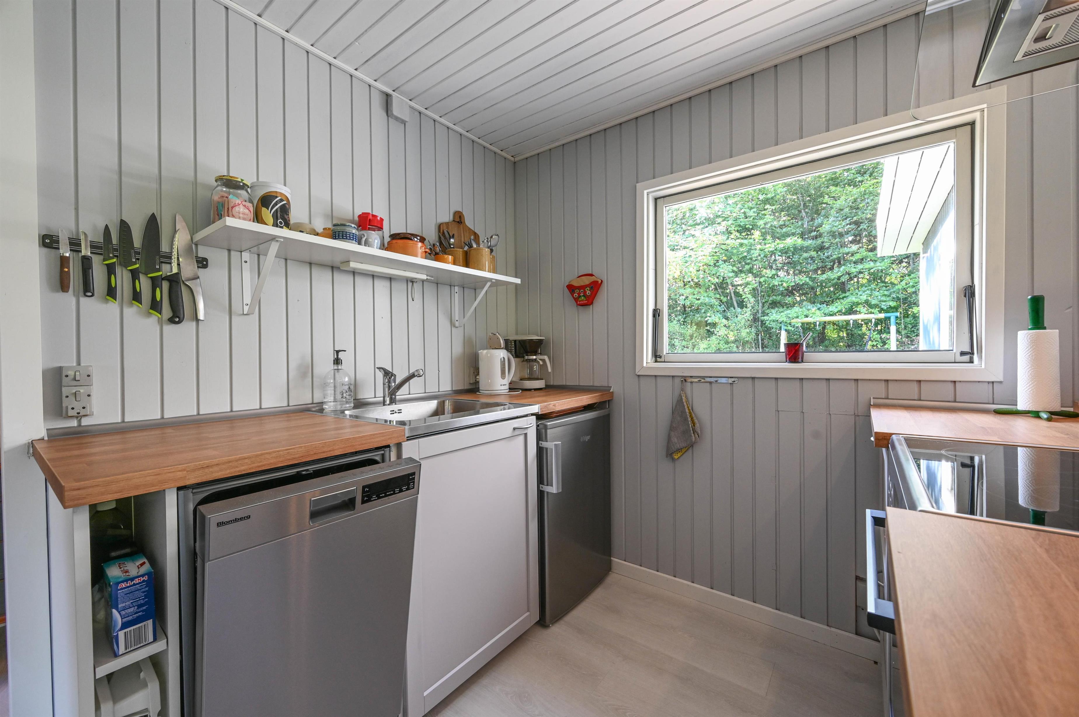 Das Ferienhaus ist hell und freundlich eingerichtet, mit einer praktischen Raumaufteilung und Platz für das Wichtigste. Die offene Küche ist direkt mit dem Essbereich und dem Wohnzimmer verbunden. Von hier gelangt ihr auf eine kleine, überdachte Terrasse – perfekt für den Morgenkaffee oder einen gemütlichen Abend im Freien.