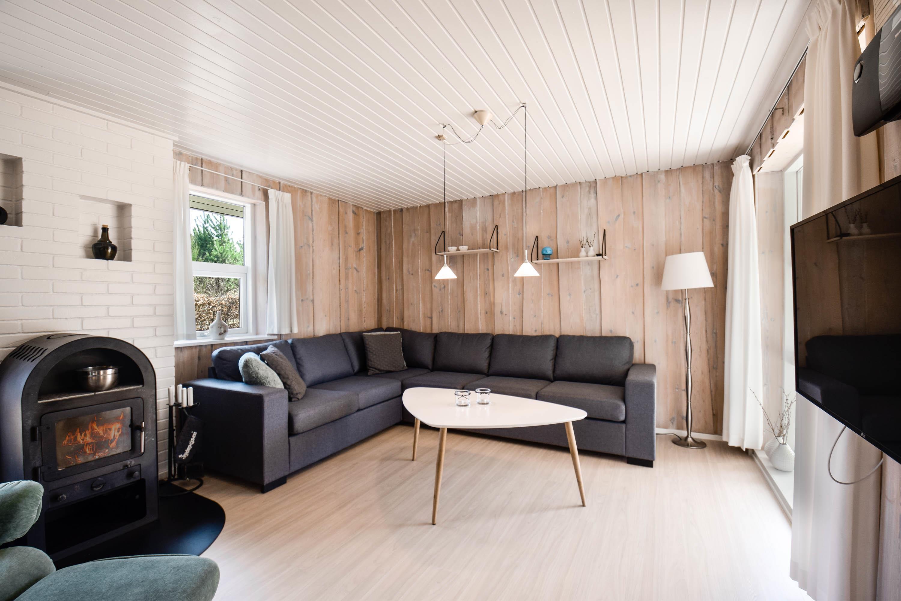 Das Ferienhaus wurde laufend modernisiert und im Jahr 2020 umfassend renoviert – mit neuen Möbeln, frisch gestrichenen Decken und einem schönen neuen Badezimmer. Das helle Wohnzimmer ist offen mit der Küche verbunden und bietet sowohl einen Essbereich als auch einen gemütlichen Platz mit Flachbildfernseher und Kaminofen – ideal für entspannte Abende nach einem Tag am Fjord. Vom Wohnzimmer gelangst du direkt in den isolierten Wintergarten, wo du das Licht und den Blick in den Garten genießen kannst.