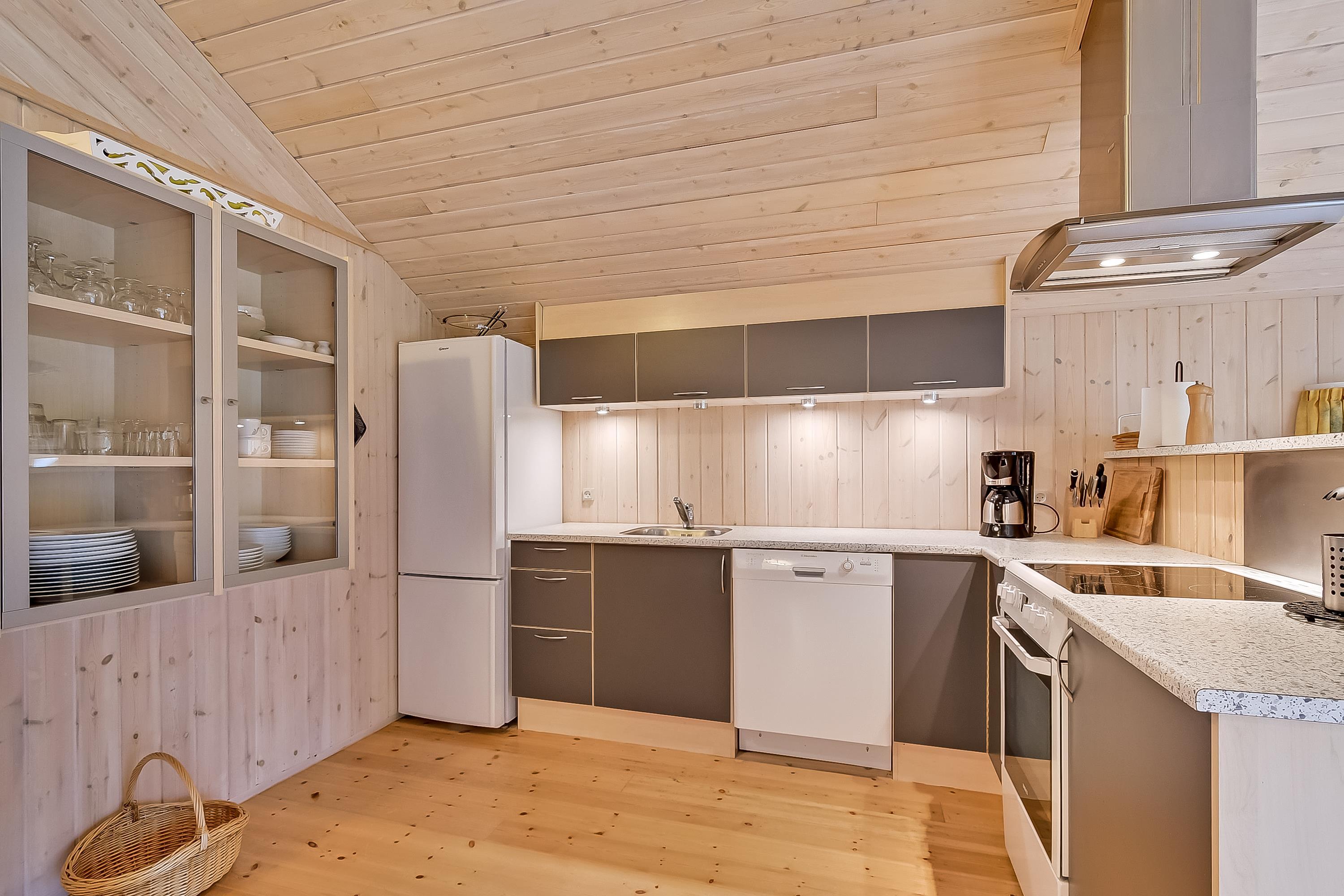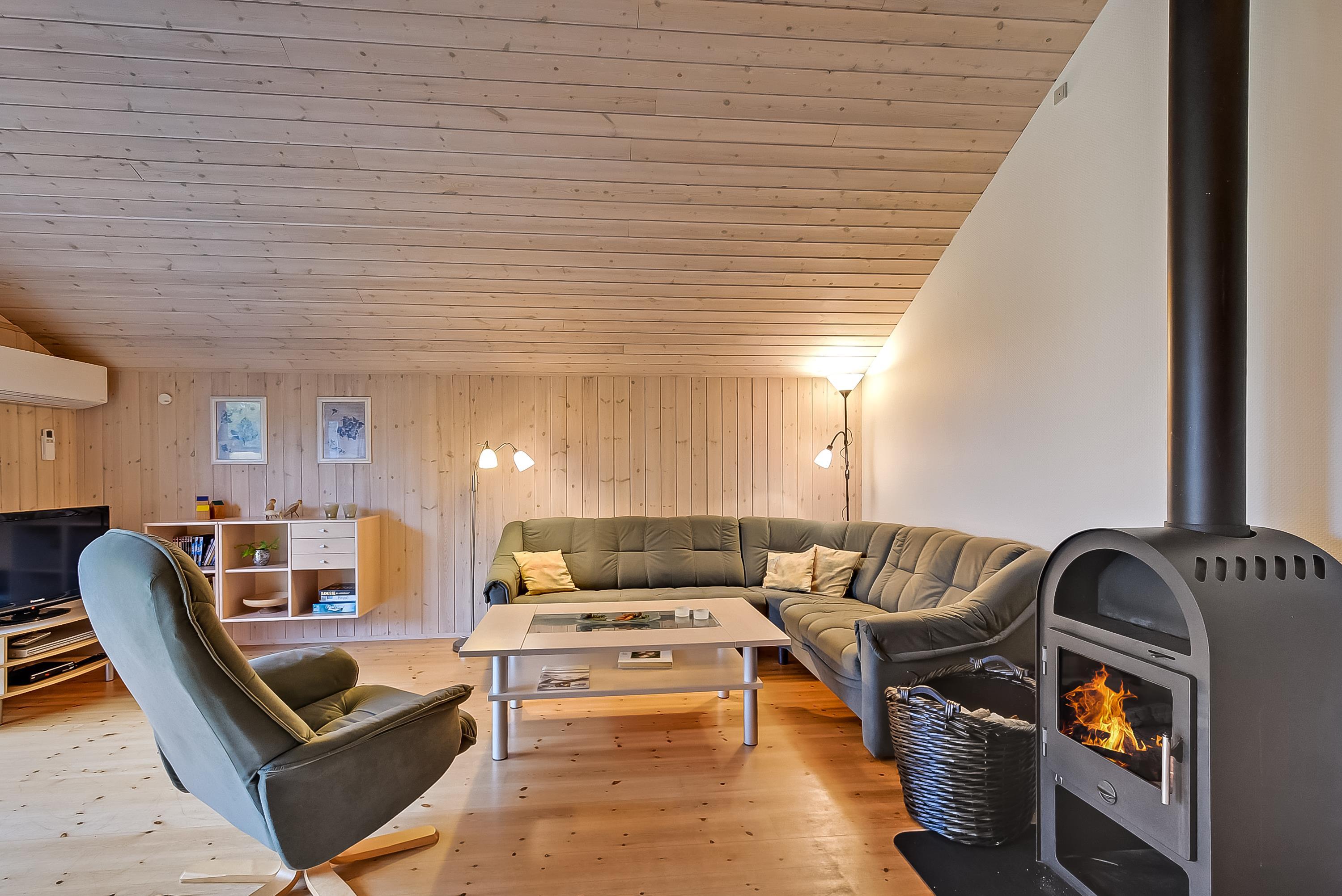 Das Ferienhaus ist hell und funktional eingerichtet – mit einer guten Raumaufteilung, bei der alles gepflegt und durchdacht ist. Die helle Küche ist offen mit dem Essbereich und dem Wohnzimmer verbunden, sodass hier viel Platz für gemeinsame Stunden und gemütliche Abende vor dem Kaminofen bleibt. Die großen Südfenster sorgen für viel Licht und holen die Natur direkt ins Haus.