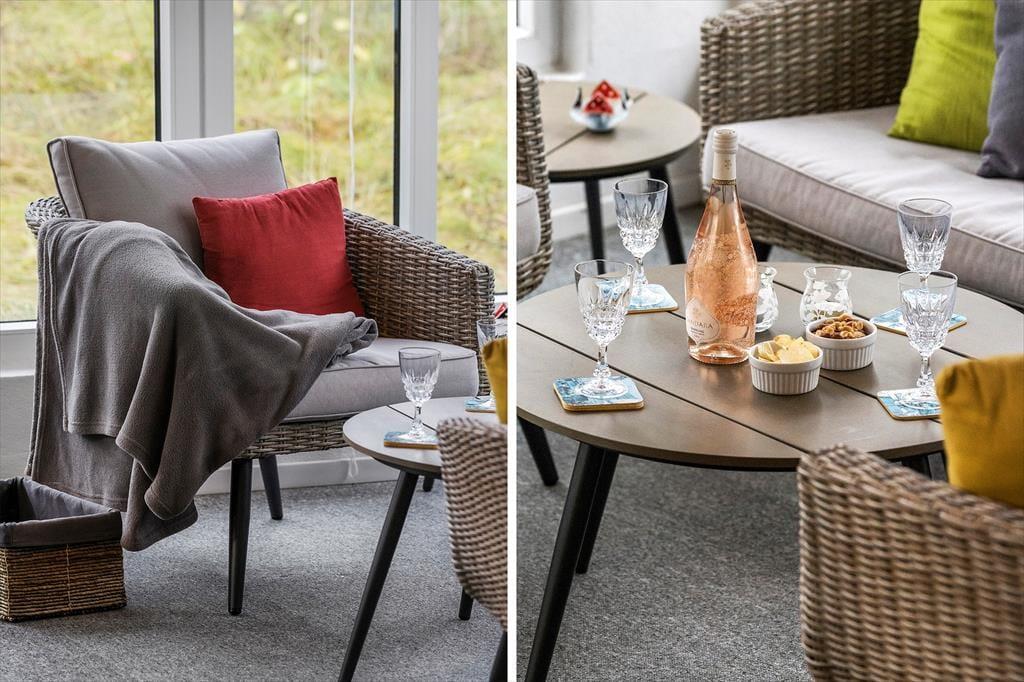 Das Ferienhaus präsentiert sich einladend mit heller Einrichtung und bequemen Möbeln, die angenehme eine Atmosphäre verbreiten. Die offene Galerie im Wohnraum gibt ein schönes Gefühl von Geräumigkeit, während der Kamin für Wärme und Gemütlichkeit an kühlen Abenden sorgen wird. Der angrenzende Wintergarten lädt zu ruhigen Momenten mit einem guten Buch oder einer Tasse Kaffee ein, von hier kannst du auch die Aussicht auf das grüne Naturgrundstück genießen. Die helle Küche ist offen mit dem Wohnraum verbunden - gemeinsames Kochen und gemütliche Mahlzeiten genießen ist leicht gemacht. Mit zwei schönen Schlafzimmern bietet das Haus Platz für Groß und Klein, also allen die Lust haben dieses authentische Ferienhausflair zu erleben.