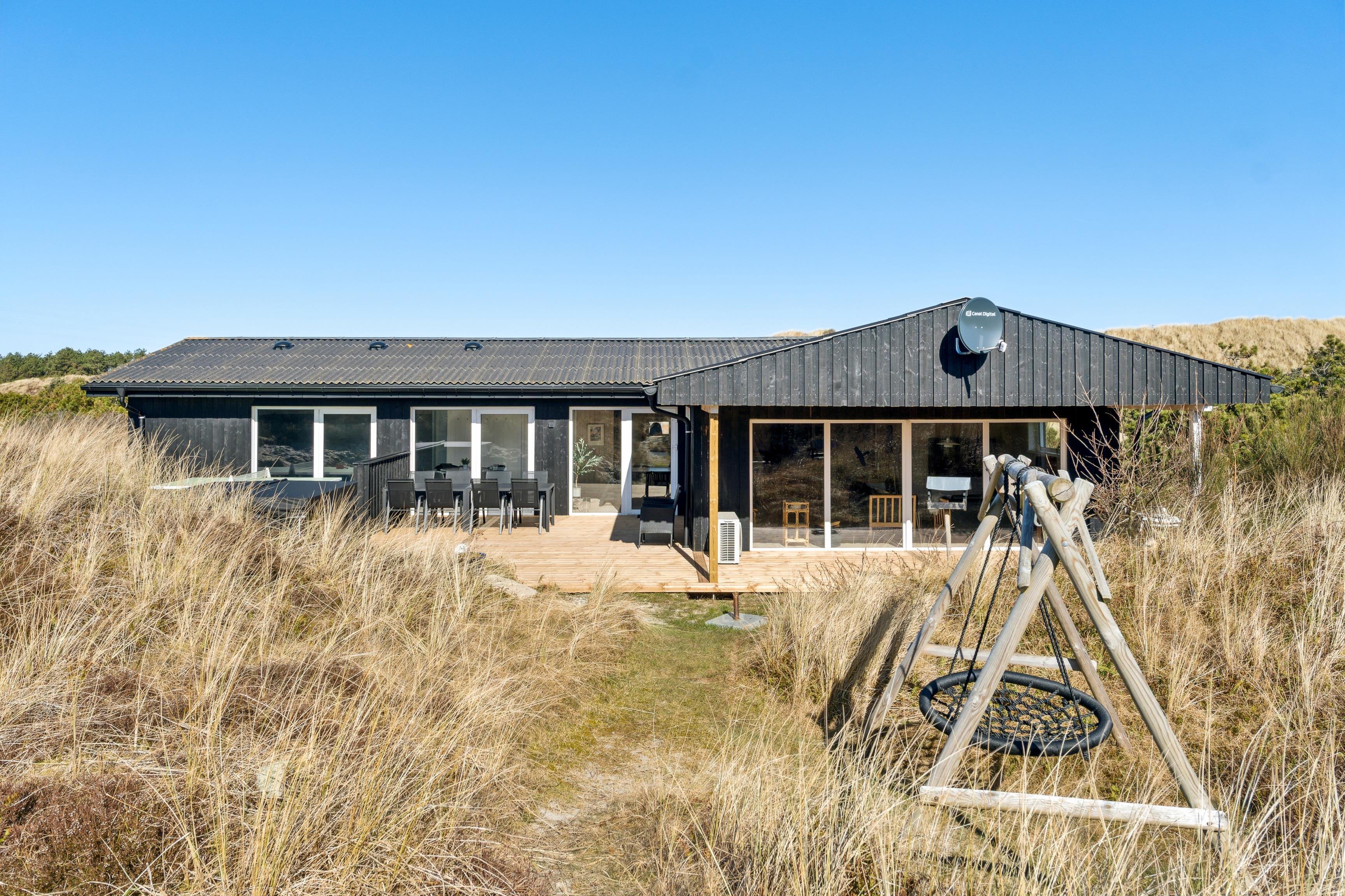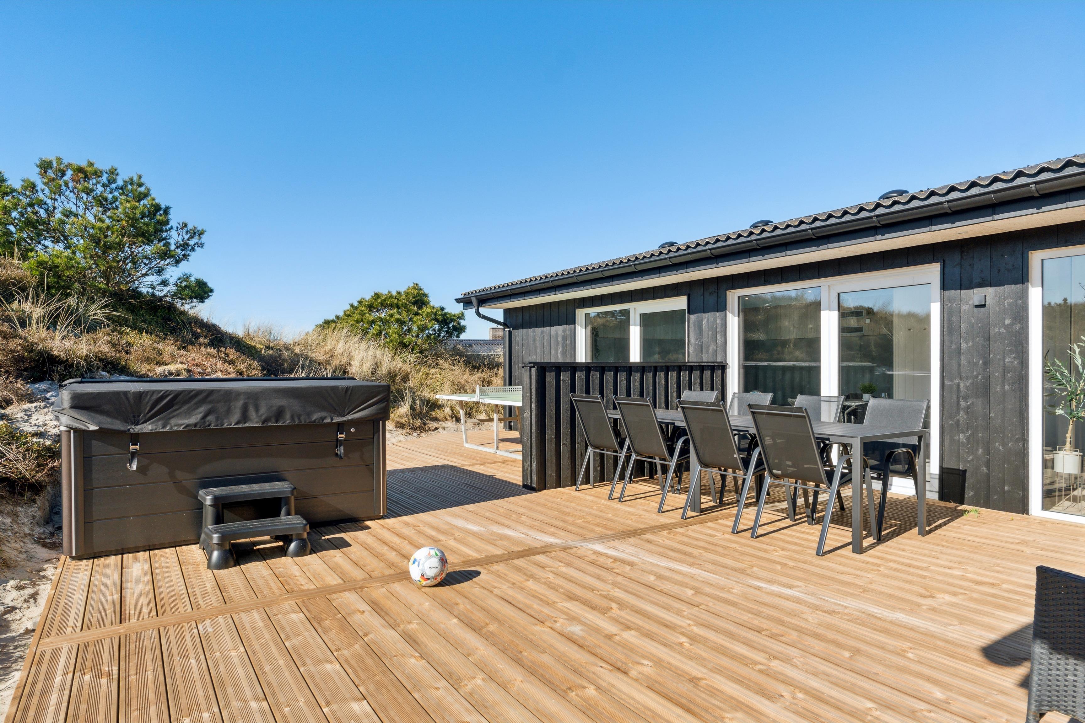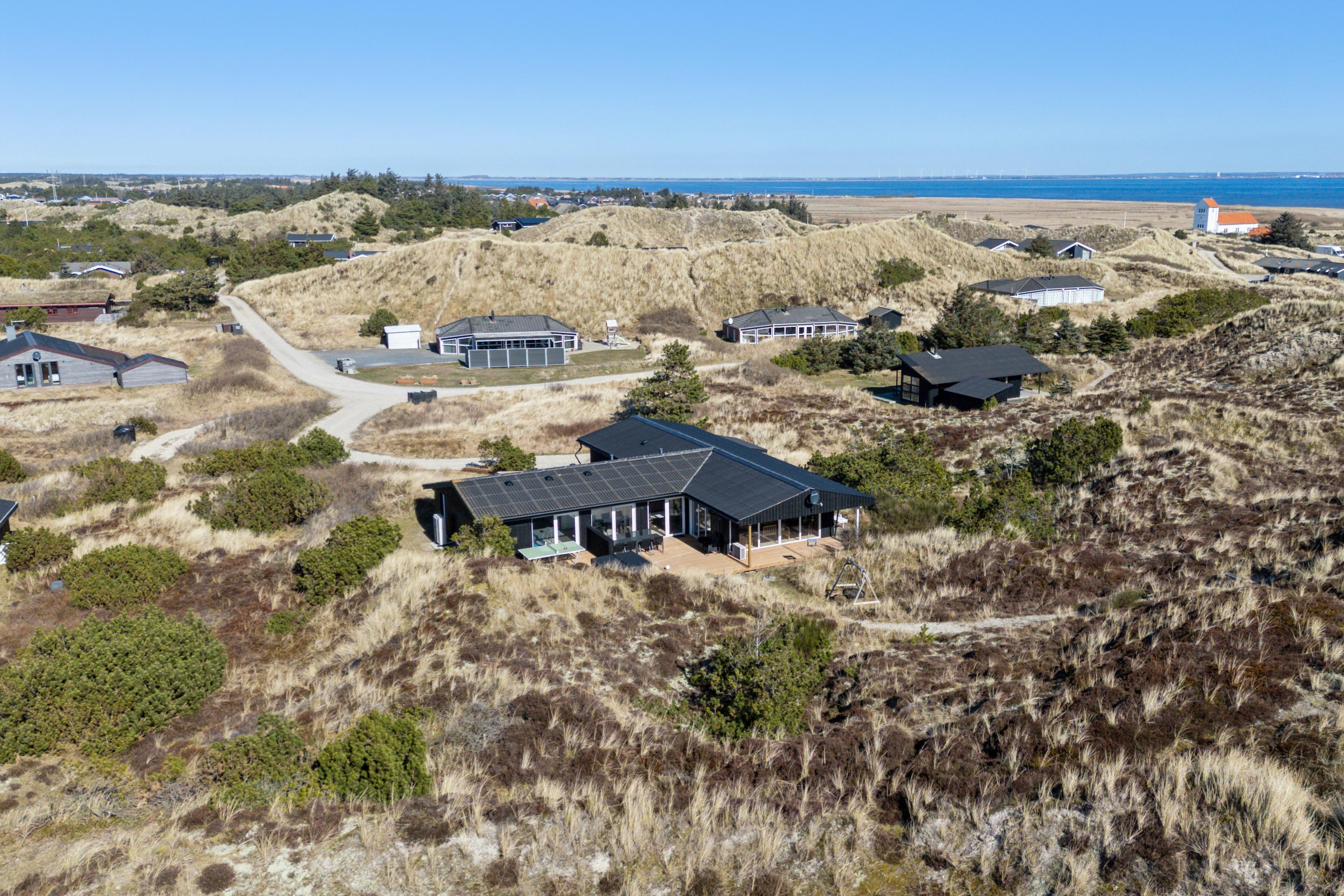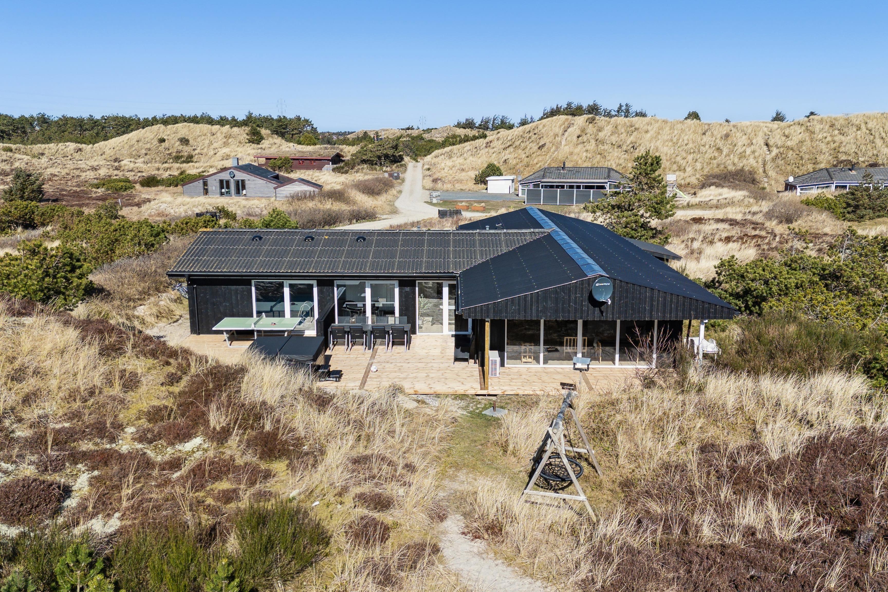 Fantastisch neu renoviertes Ferienhaus. Nach einer umfassenden Modernisierung im Jahr 2025 präsentiert sich das Haus nun als modernes und luxuriöses Urlaubsparadies mit einem neuen großen Außen-Whirlpool, modernisiertem Poolbereich und wunderschönen Terrassen. Das Haus befindet sich auf einem 3.000 m² großen, hügeligen Dünengrundstück, wo Sie eine völlig ungestörte Lage in der Nähe der beeindruckenden Natur genießen können. Von den Terrassen aus haben Sie einen herrlichen Blick auf den Leuchtturm Nr. Lyngvig, und es gibt reichlich Gelegenheit für Spaß und Entspannung mit Tischfußball, Outdoor-Tischtennis und kostenlosem WLAN.