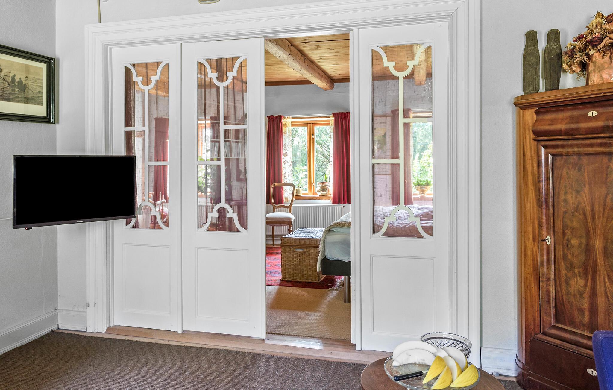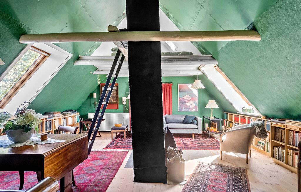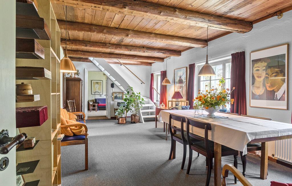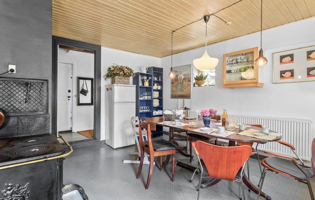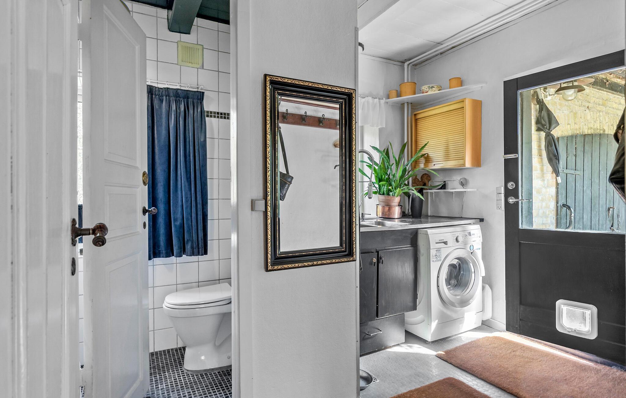 Genießen Sie einen idyllischen Urlaub in diesem historischen Bauernhaus in der Nähe des Nybølle Strands auf der malerischen Insel Lolland. Umgeben von blühenden Gärten und weiten Feldern, bietet dieses charmante Anwesen eine einzigartige Atmosphäre, in der sich Ruhe und Naturerlebnis auf eine schöne Weise verbinden. Treten Sie ein in das liebevoll eingerichtete Haus und lassen Sie sich von der Einrichtung mit rustikalen Holzbalken und gemütlichen Möbeln verzaubern. Im großzügigen Wohnzimmer können Sie sich am knisternden Kaminofenfeuer entspannen oder auf dem gemütlichen Sofa ein gutes Buch lesen. Genießen Sie Ihre Mahlzeiten am großen Esstisch, umgeben von Kunstwerken und historischen Elementen, die den Charme dieses Hauses unterstreichen.